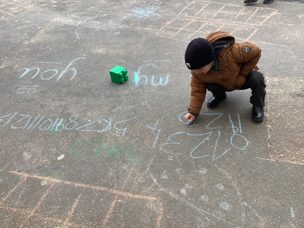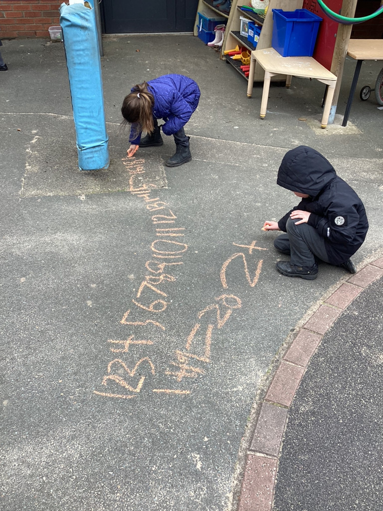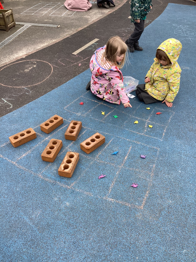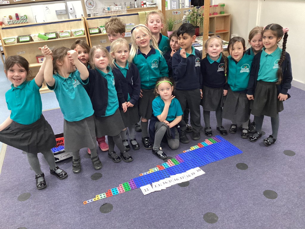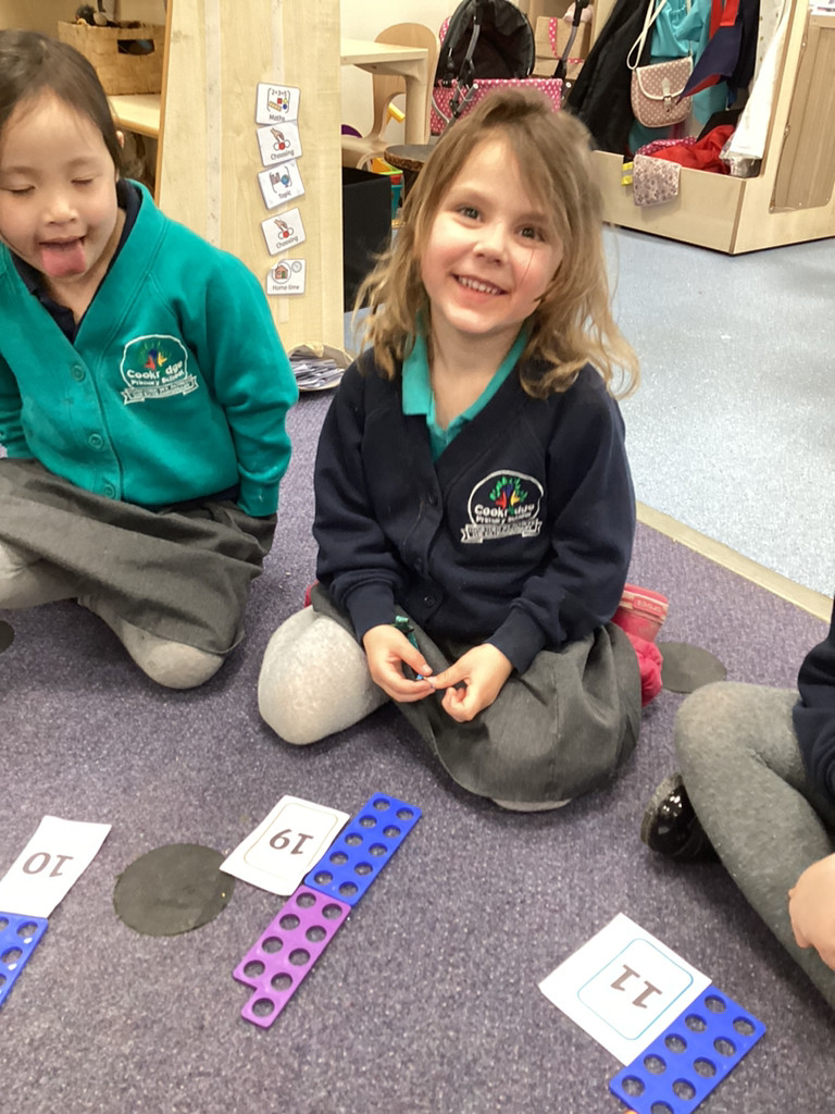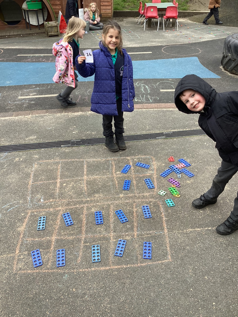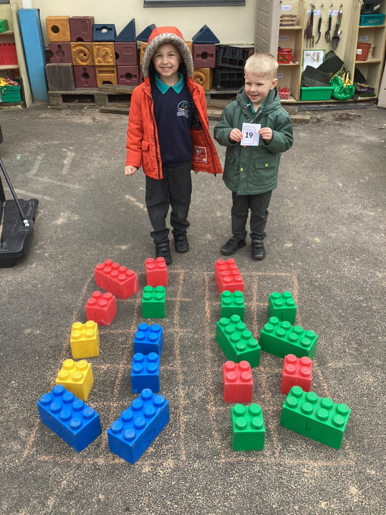 Our Maths, work this week has extended our number work past ten, investigating the numbers up to 20. The children played around with building blocks and Numicon to show how the composition of these numbers in different ways, as well as filling large tens frames outside to represent the numbers 11-20.