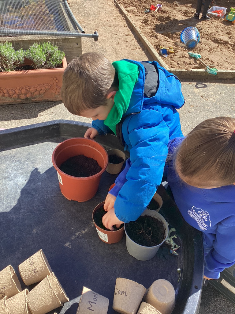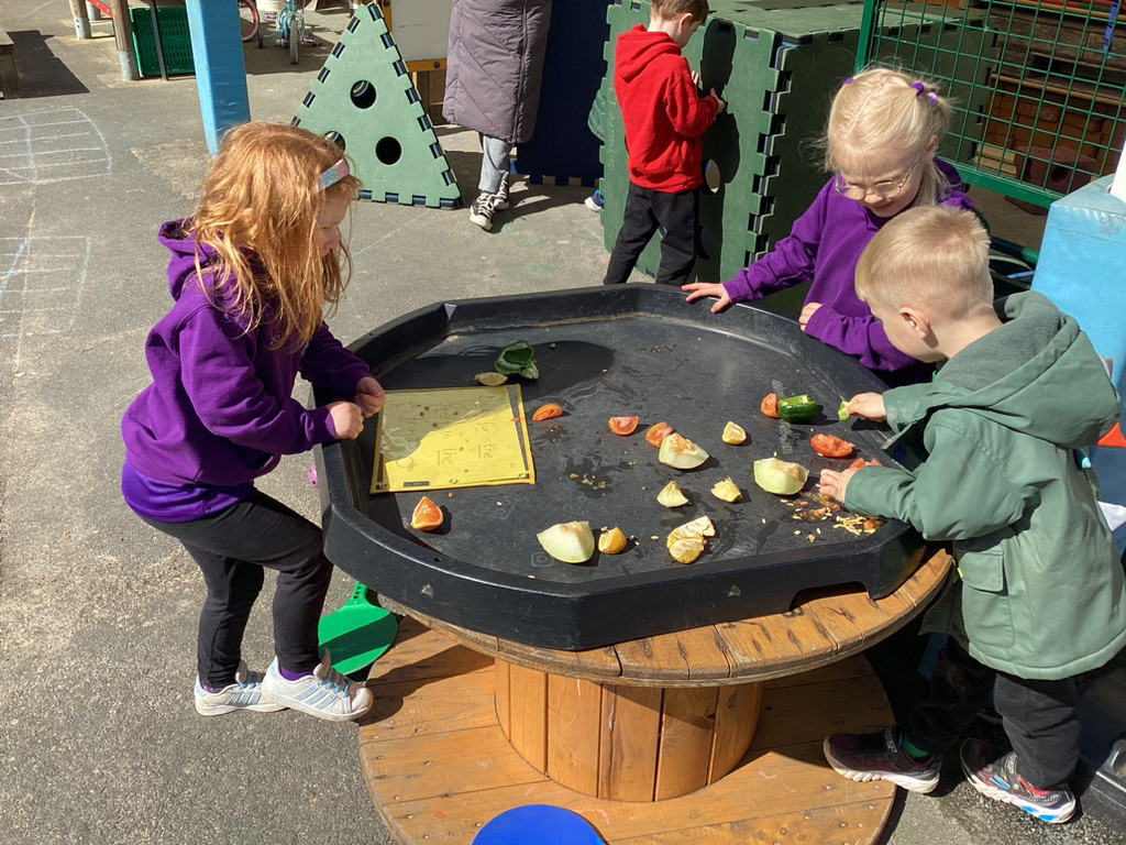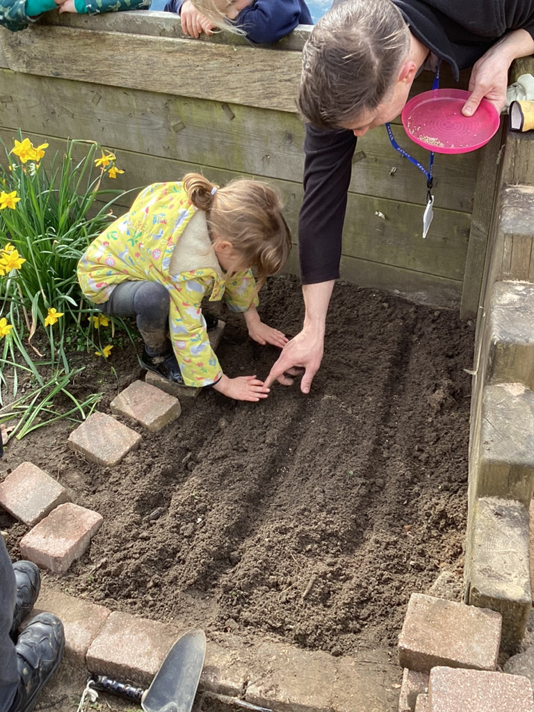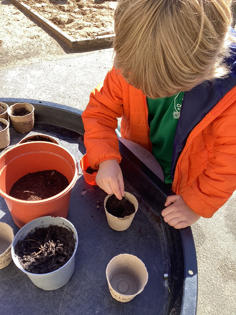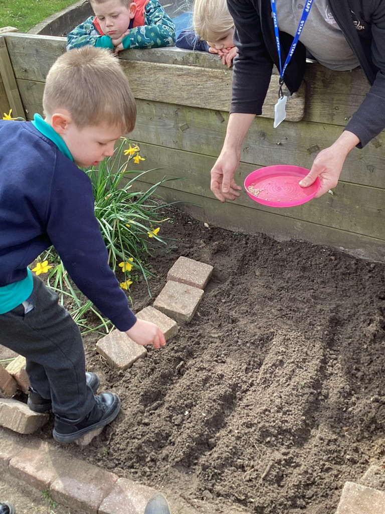 Of course, we all also got planting and every child planted their own bean in an individual pot which we shall look after as it (hopefully) grows. The children all started their own ‘bean diary’ too, to record the changes in their plant as it grows. Some children also helped out with preparing out outdoor garden by helping to remove stones and weeds before helping to sow some radish seeds in three neat little rows. We shall be keeping an eye on these in the coming weeks, and watering them as needed (should it ever go thirty minutes without raining in Cookridge, that is!). There was also a curiosity station, where children were invited to explore different fruit and vegetables to look at the different types of seeds they could find.