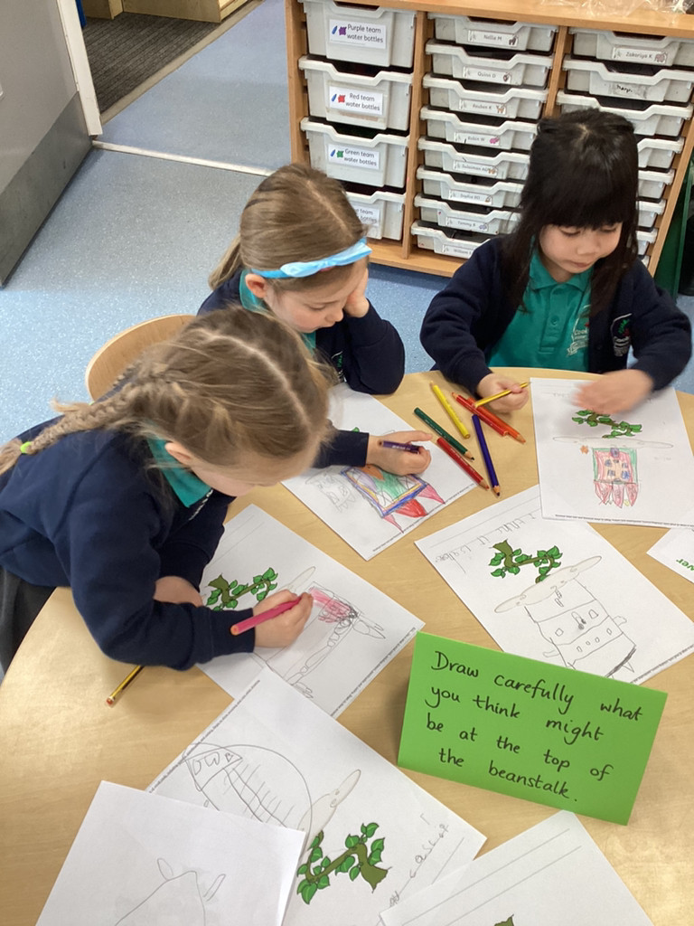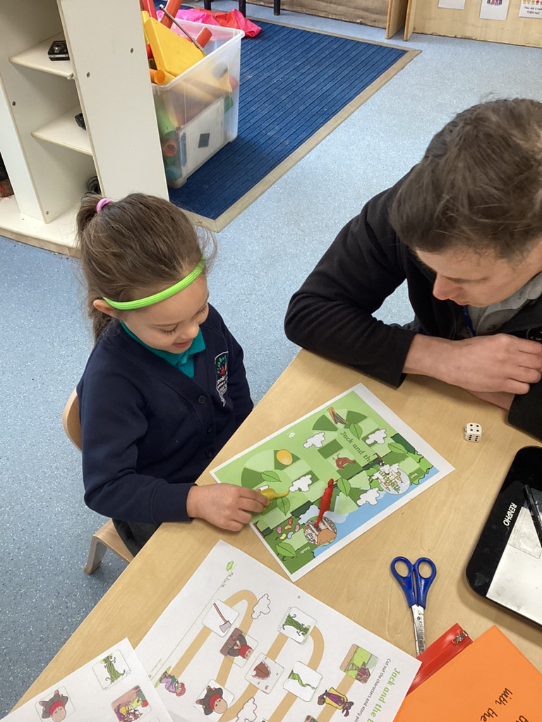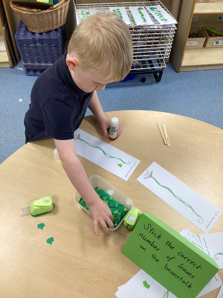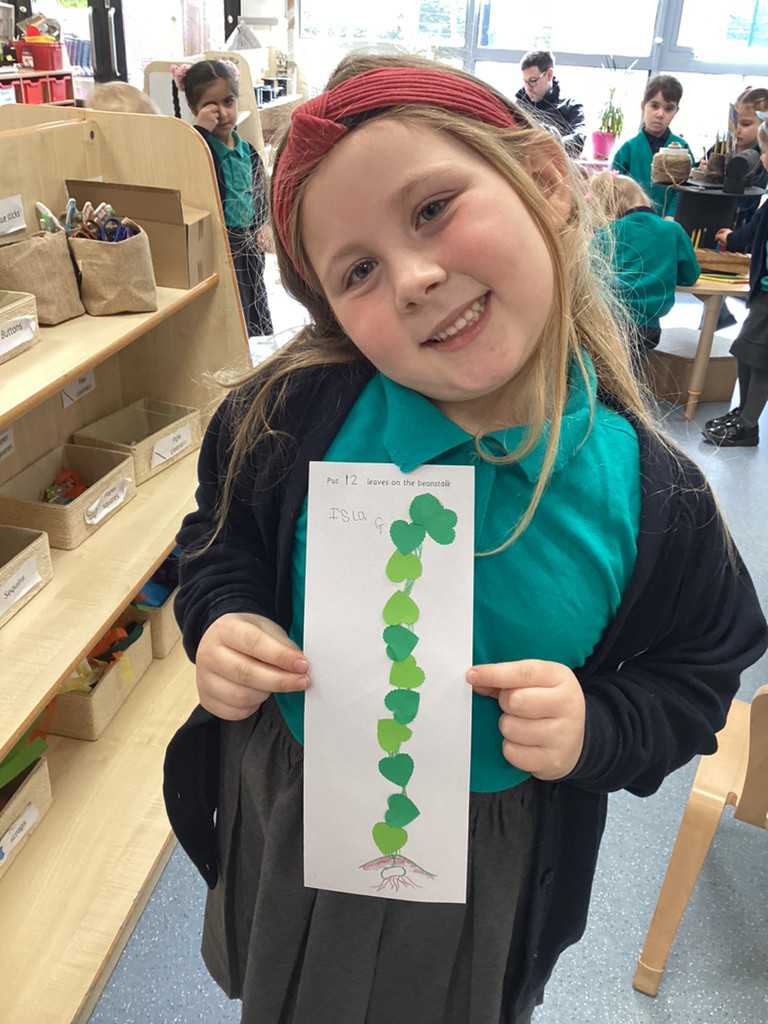 What a great start to the new term we’ve had in Reception this week! The children have returned from the break with lots of energy and enthusiasm for the term ahead and we have dived straight into our latest topic ‘Let it Grow!’ in which we’ll be looking at all kinds of growth in plants and animals alike. To begin this topic we have used ‘Jack and the Beanstalk’ as our focus story. The children enjoyed hearing a couple of different versions of this traditional tale and got stuck into a range of related activities around Reception. There were props available for the children to use to retell the story; we had story maps where children were challenged to put the parts of the story in the correct order; we had some fantastic beanstalk artworks and even a Jack and the Beanstalk boardgame!