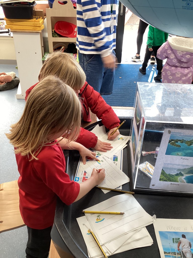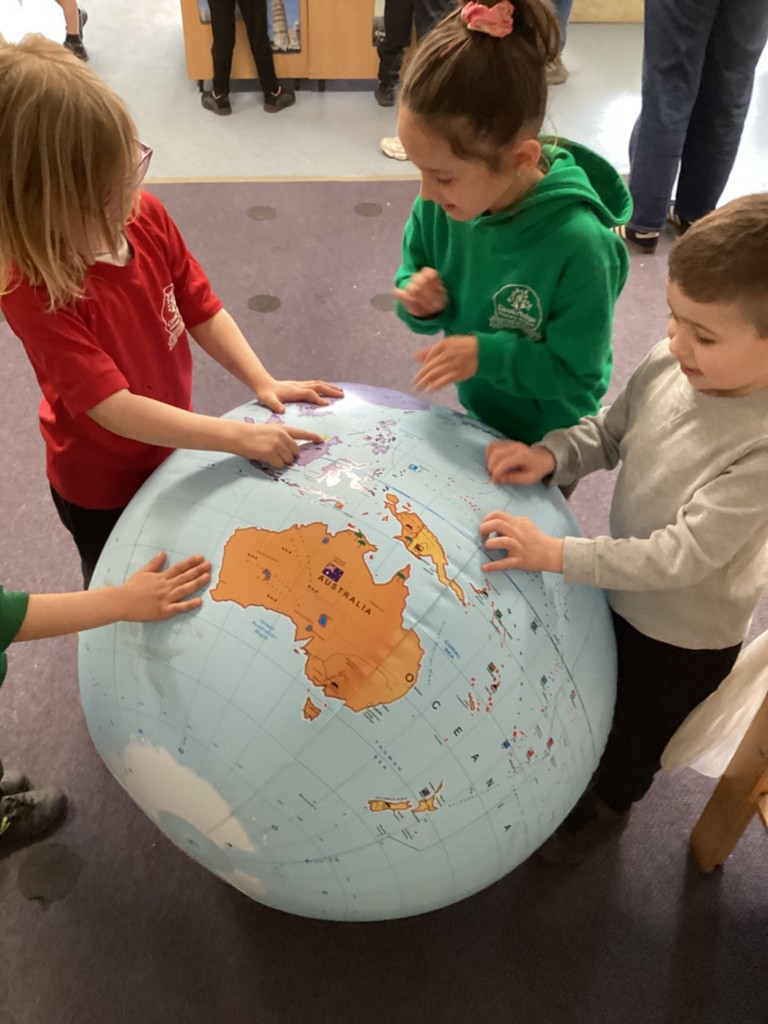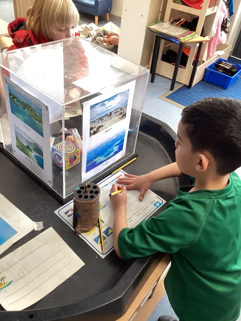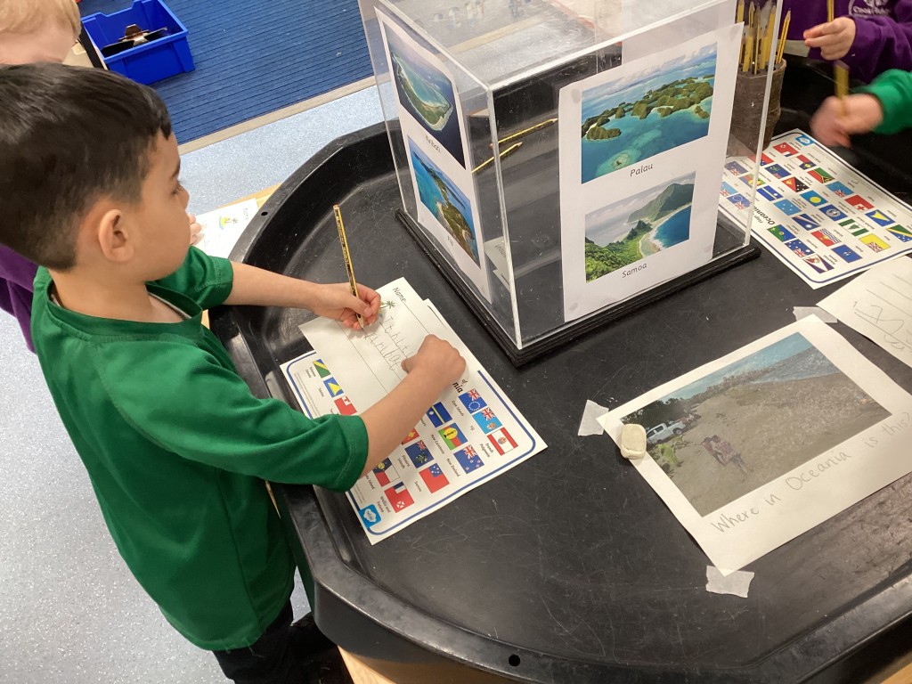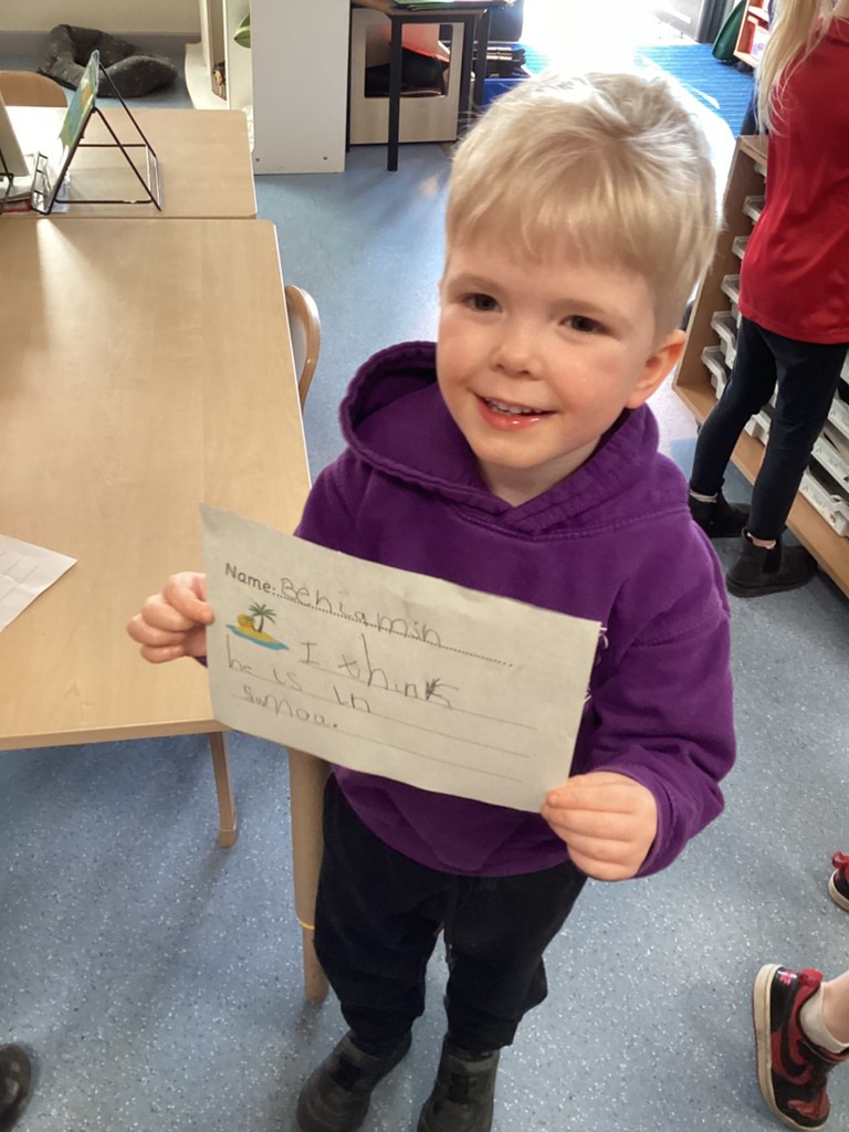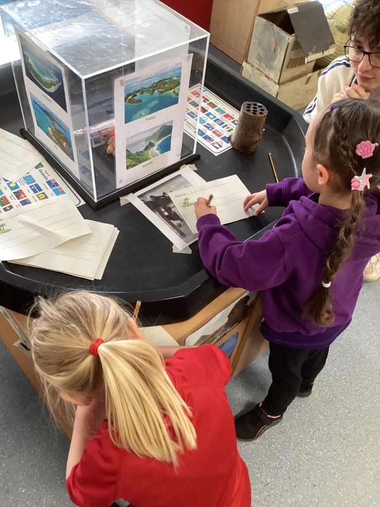 On Thursday, we contrasted life in Leeds with some of the tiny island nations found in Oceania. We zoomed out from our school on Google Earth to see the surrounding city with it’s thousands of houses, it’s shops, factories, offices and busy motorways before travelling to the other side of the planet to compare this to the nation of Tuvalu which is made up of a series of islands and has a total population of around 10,000 people compared to the approximately 850,000 people that live in Leeds. We zoomed in on the island of Nukuleilei (one of the islands making up Tuvalu) which is home to only 341 people which is around the same number of children and staff at Cookridge Primary School. We saw how different life must be for the children who go to school on the island as there is no cars or roads and only narrow spits of land surrounded by expanses of ocean. To further consider the many islands that make up the continent of Oceania the children were presented each day with an image of people on different islands (such as Samoa, Tonga, Kiribati and Nauru) and encouraged to write a sentence to guess which island they were on. Those that correctly named the island were placed on a spinning wheel of names and the lucky winner each day got to pick a prize to take home.