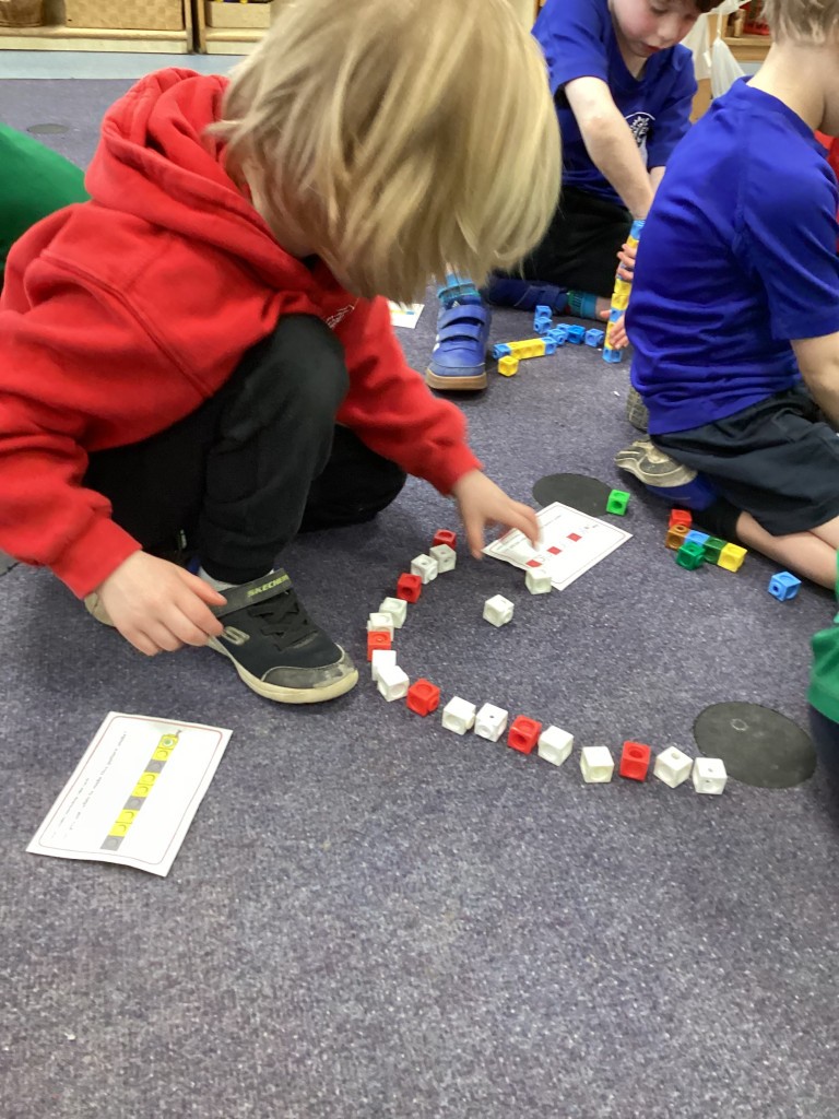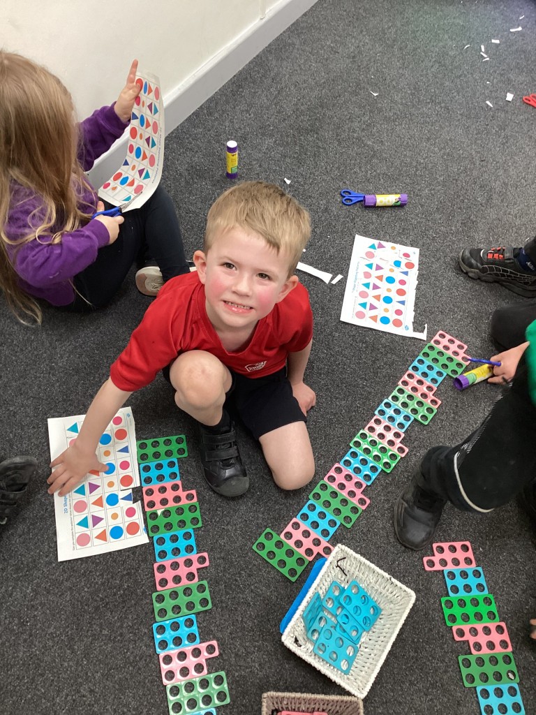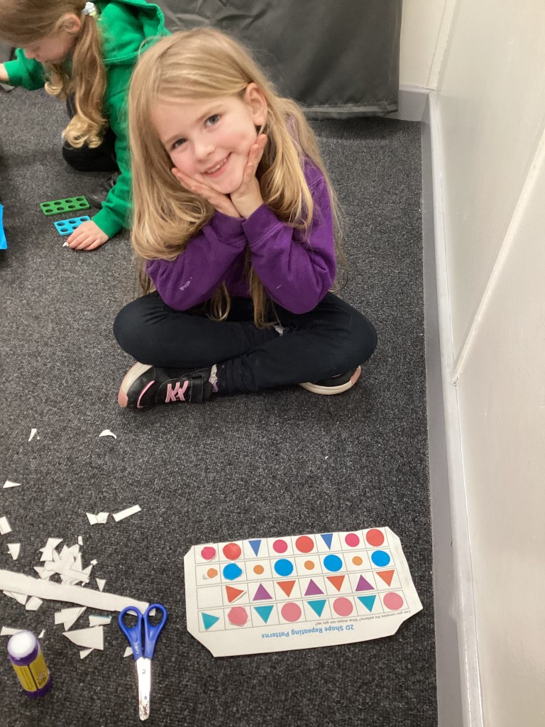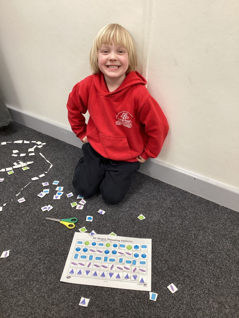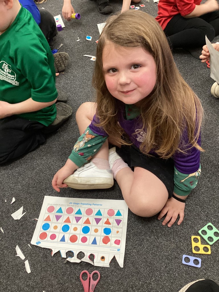 Our Maths sessions this week have been lots of fun as we’ve been thinking about patterns! The children have had a great time making repeating patterns with cubes and counters, or by looking closely at the rotation of familiar 3D shapes. Most fun of all has been using the musical instruments outside to make repeating patterns with different sounds!