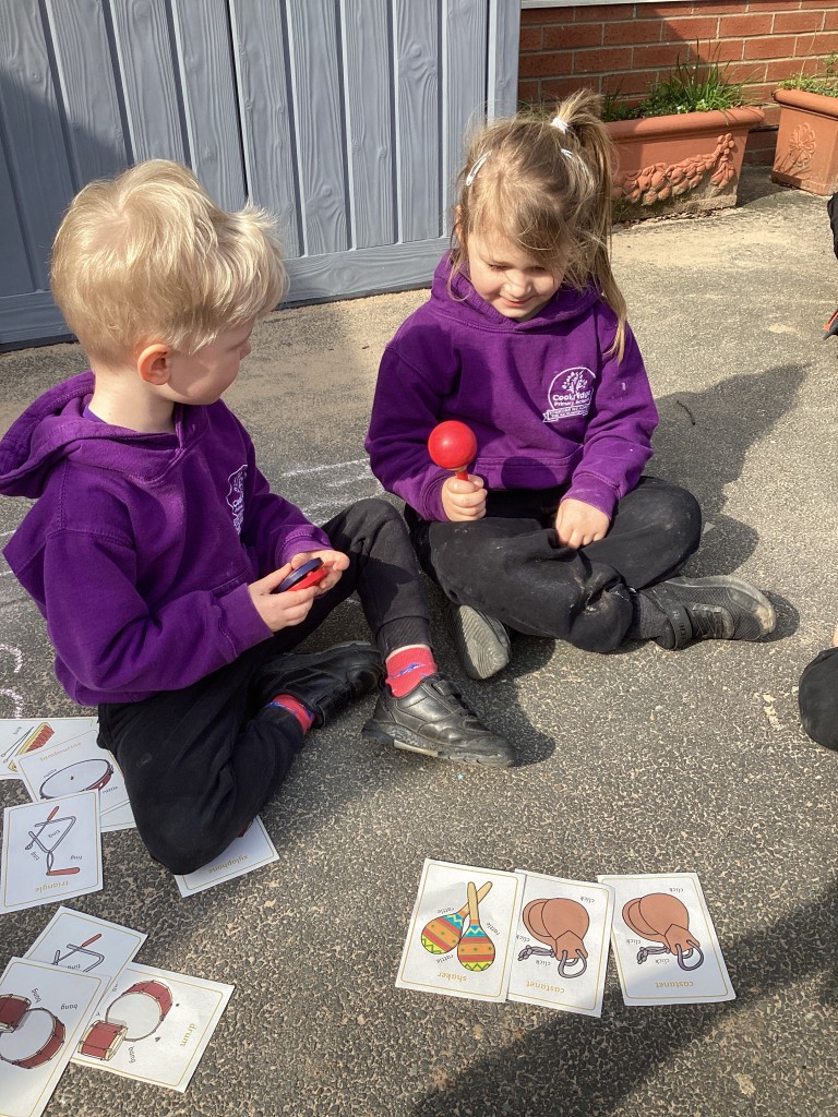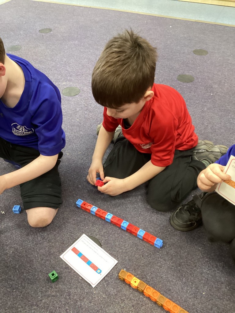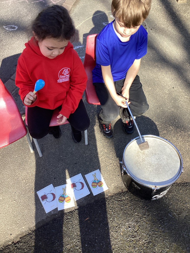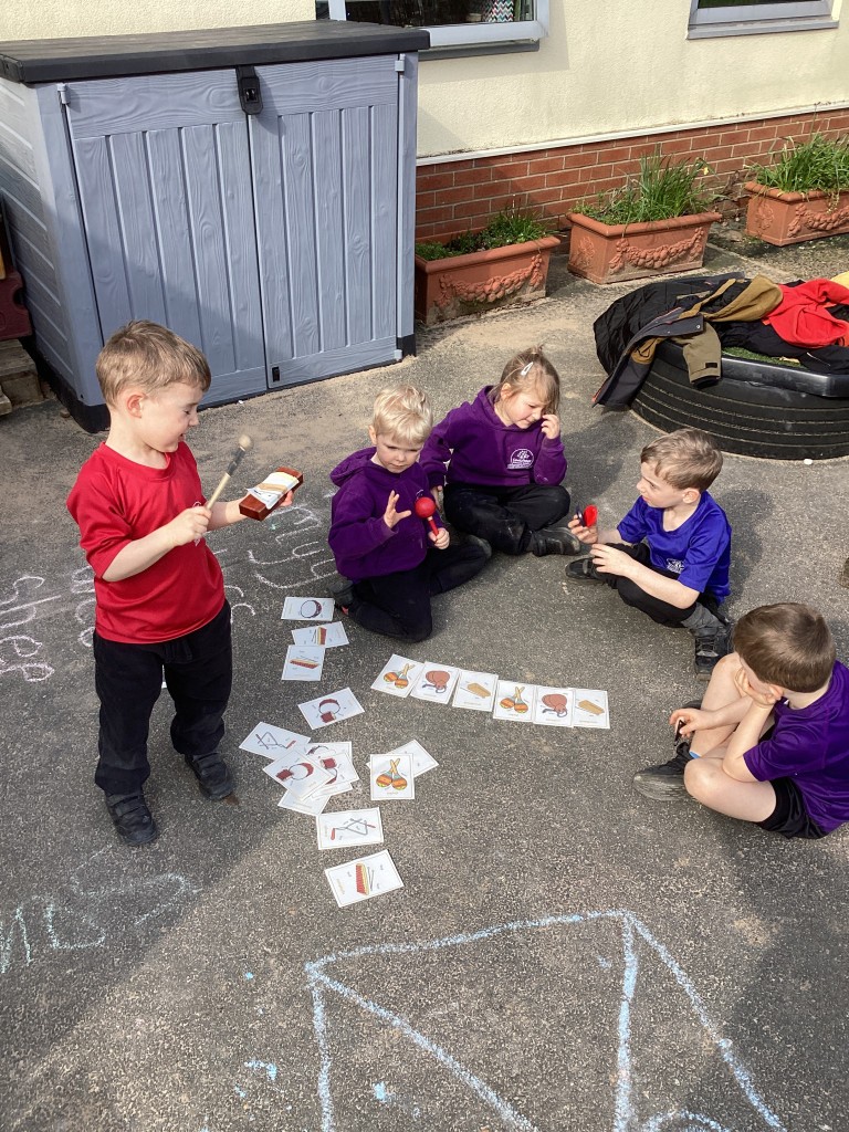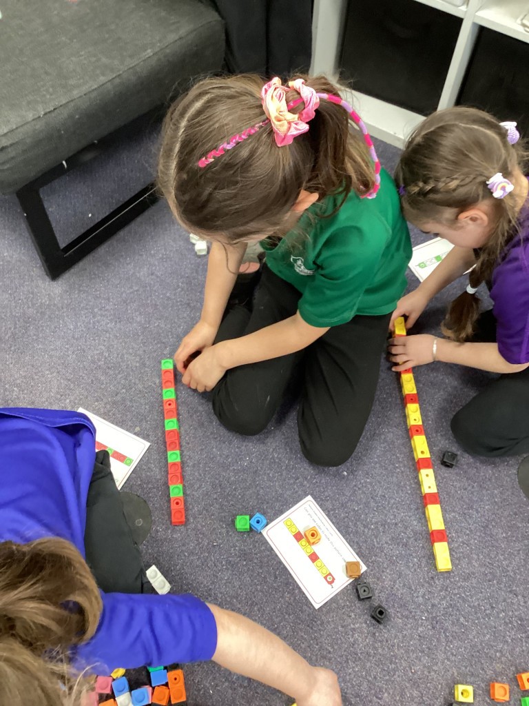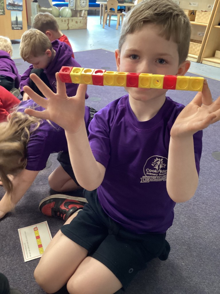 Our Maths sessions this week have been lots of fun as we’ve been thinking about patterns! The children have had a great time making repeating patterns with cubes and counters, or by looking closely at the rotation of familiar 3D shapes. Most fun of all has been using the musical instruments outside to make repeating patterns with different sounds!