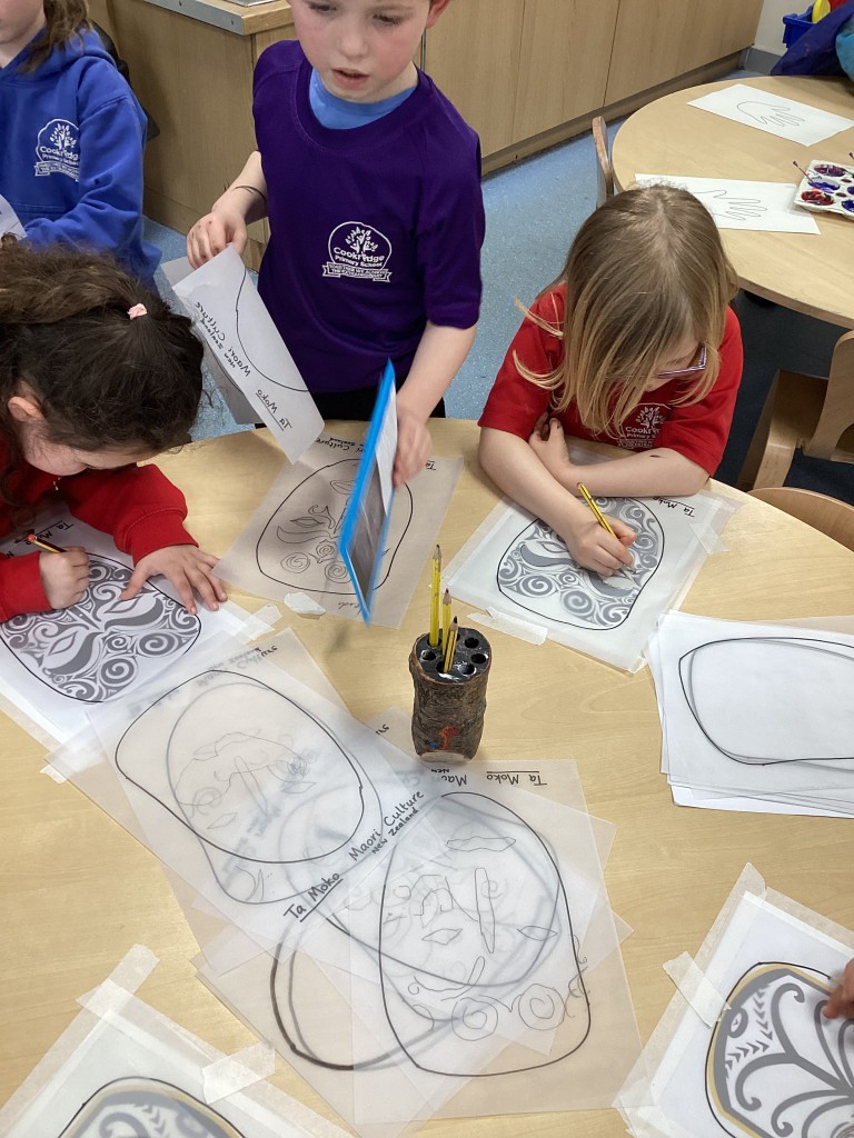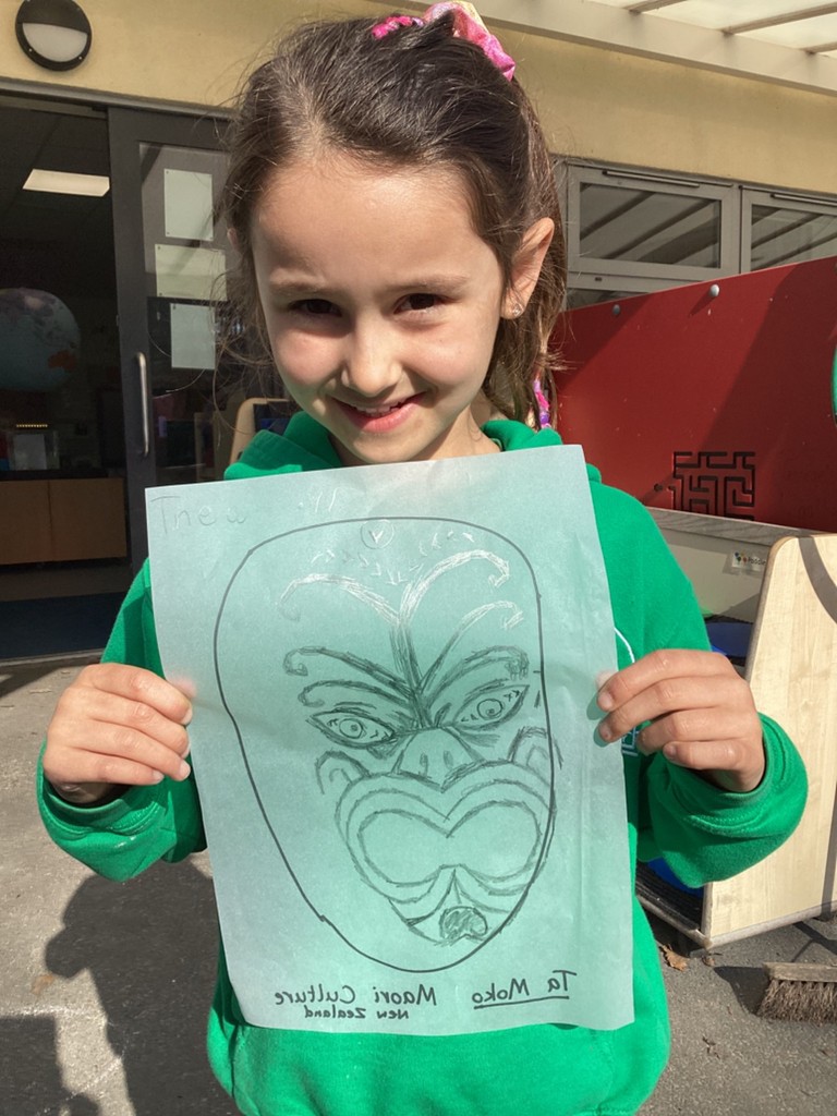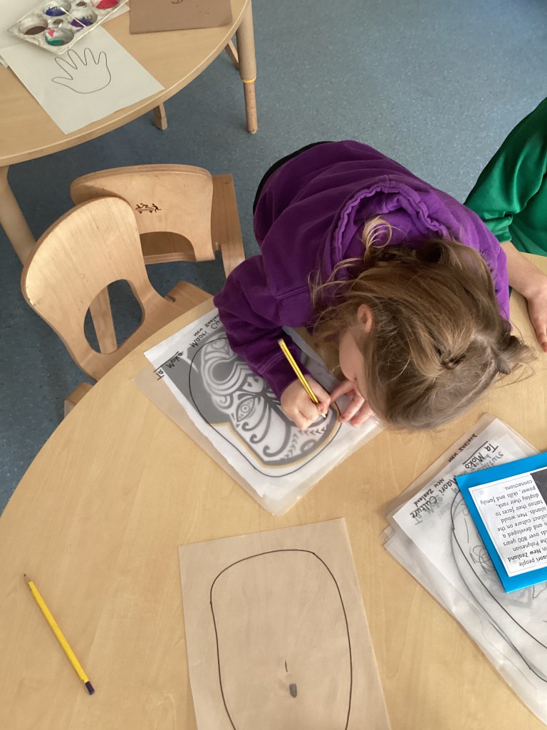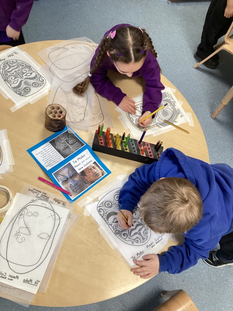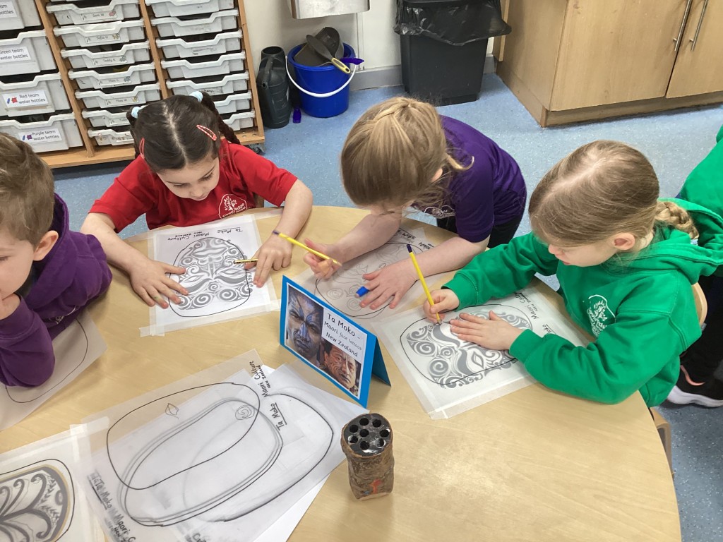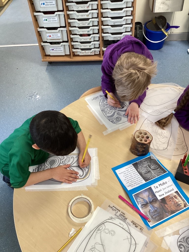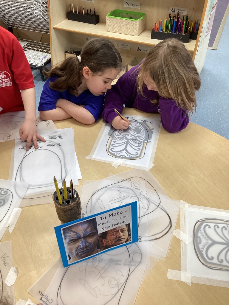 Mrs Andrews shared photos from her time living in New Zealand and showed us the incredible and varied scenery of the islands – from glaciers and mountains to tropical forested beaches. Whilst learning about New Zealand we heard about the indigenous Moari culture and their centuries-old tradition of tattooing called Tā Moko and how the tattoos typically show the bearer’s ancestry and status or to represent traditional stories. Many children then took on the challenge to carefully trace some examples of face tattoos in pencil.
