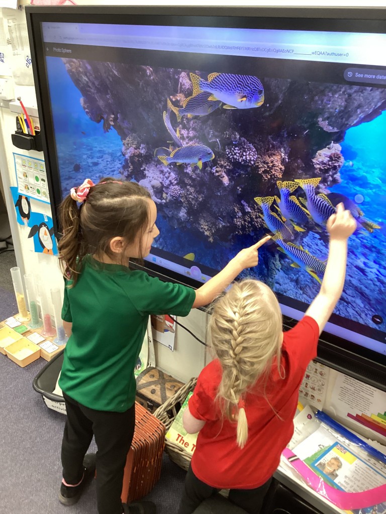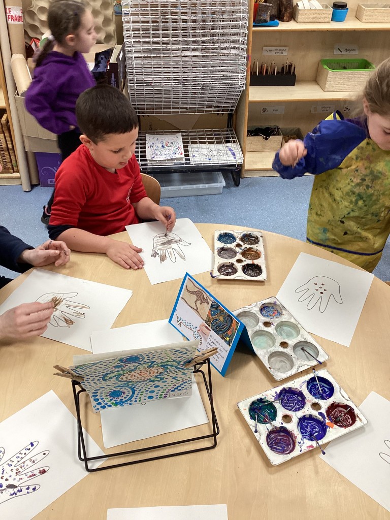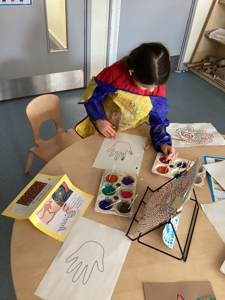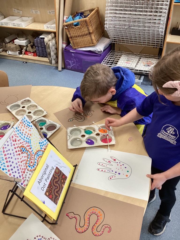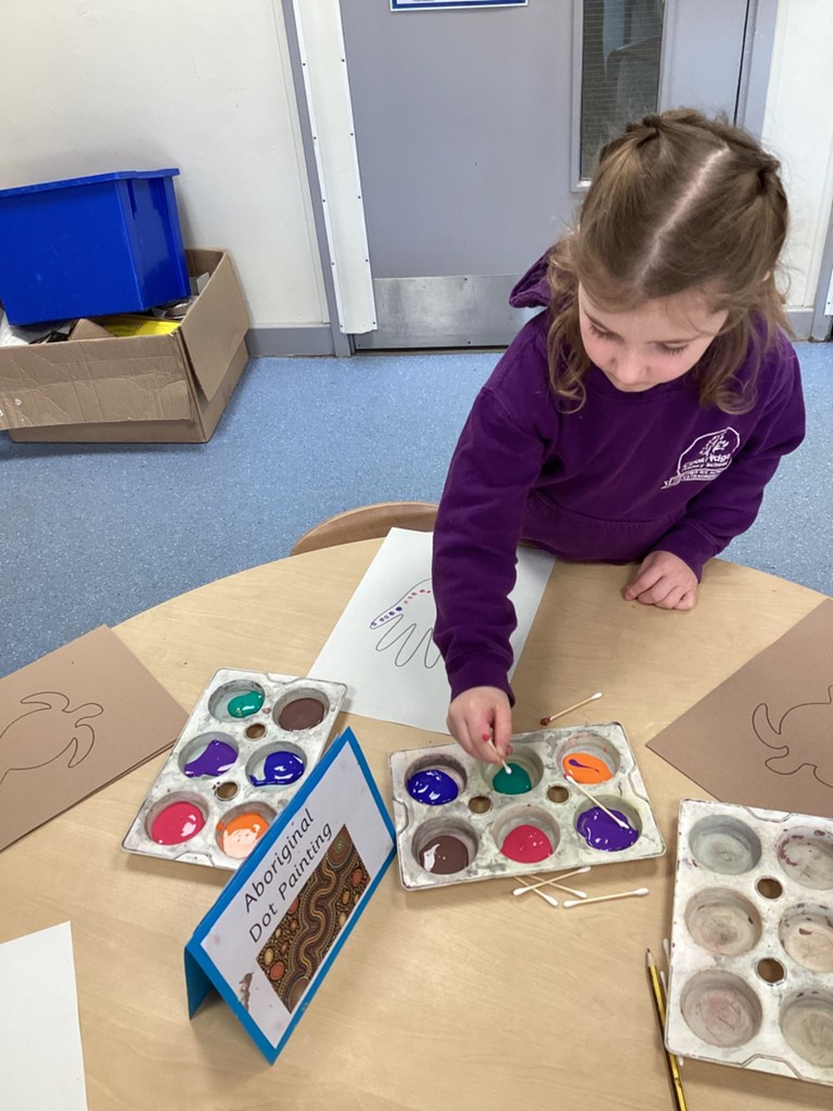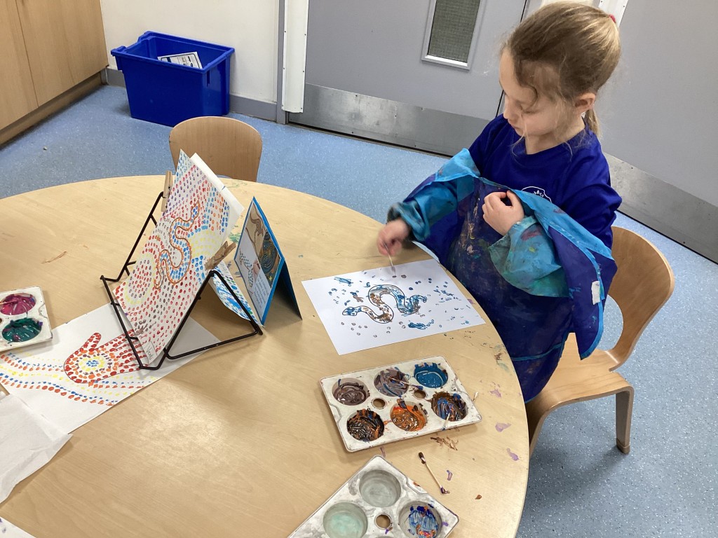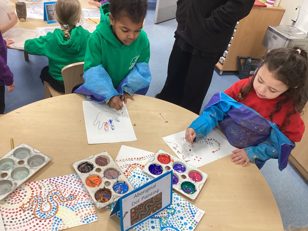 We’ve been ‘down under’ this week in Reception as our ‘Around the World’ topic reached Oceania. The children have enjoyed learning more about Australia, New Zealand and a host of other island nations in the South Pacific. We travelled with the Go Jetters team to find out a bit about some famous Australian landmarks – Uluru, Sydney’s Opera House and The Great Barrier Reef – and, looking at each in turn, we discussed how some landmarks are natural and some are man-made. It was fascinating to dive into the ocean and see the beautiful coral reefs around Australia via the underwater photography on Google Earth and see close-up the fish and plants that find their homes there. Following this, some children were inspired to construct their own version of The Great Barrier Reef from a selection of loose parts to represent coral and sea creatures. Another one of our creative activities this week was given over to trying our hand at the traditional indigenous Australian art-form of dot painting with the children having a go at carefully making concentric dot patterns with colourful paint.
