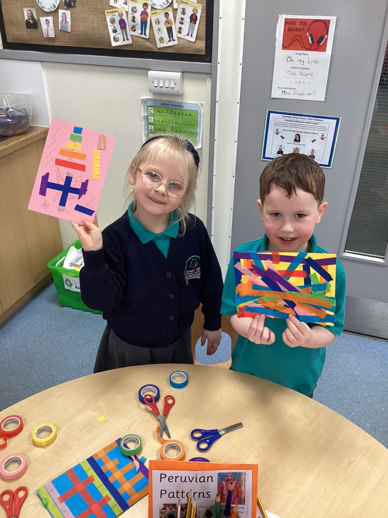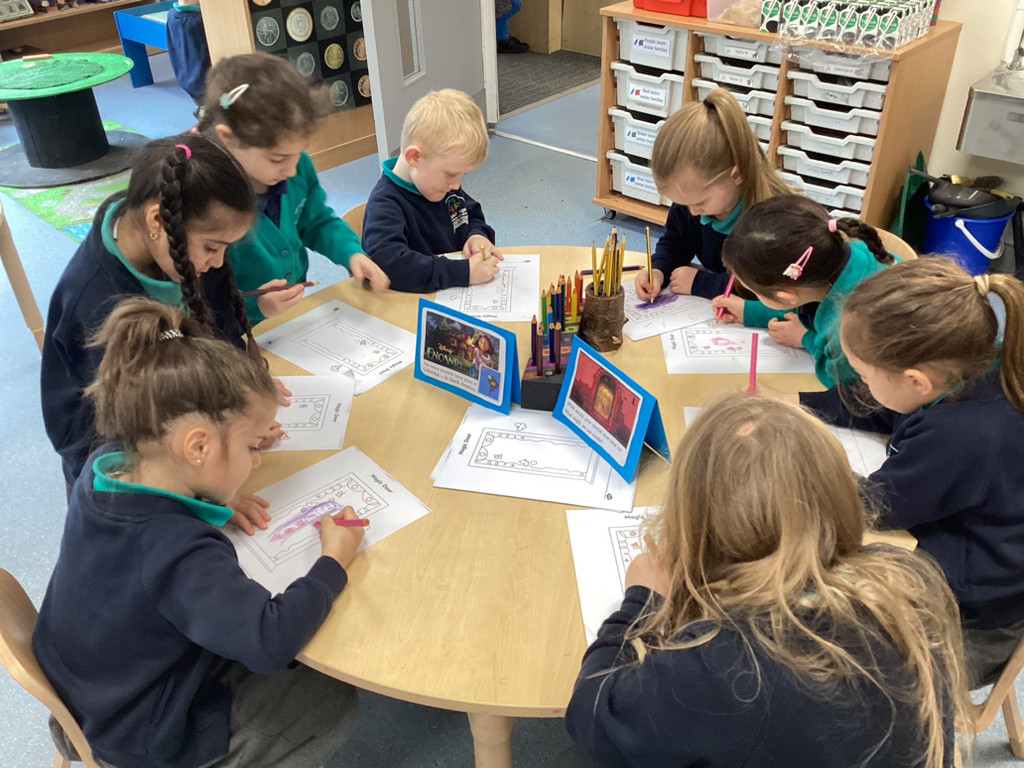 Around our classroom were lots of opportunities for the children to further explore aspects of South American culture. Miss Devine kindly lent us her Peruvian poncho and jacket that she picked up on her travels last year so that we could take a close look and use this as inspiration to design our own patterns. The children also enjoyed using the watercolour palettes to carefully paint rainforest creatures from the Amazon jungle and used their imagination to design a magical door inspired by the Disney film Encanto (set in Colombia). The children have also been encouraged to engage in back and forth conversations, asking each other questions about where in the world they would like to see and answering each other in full sentences.