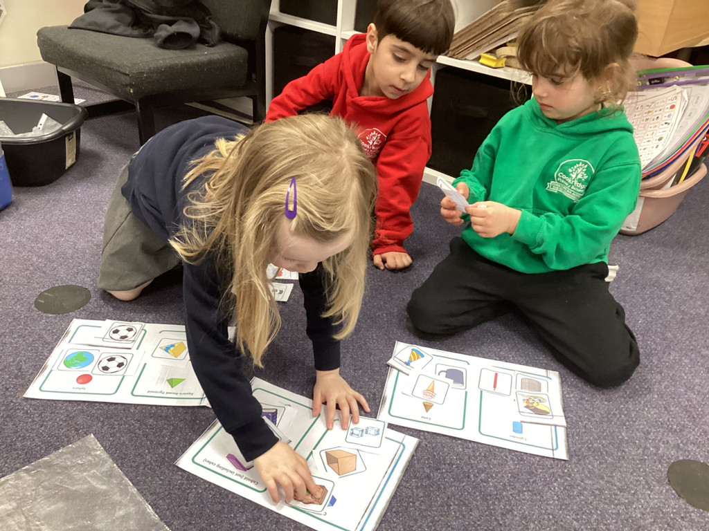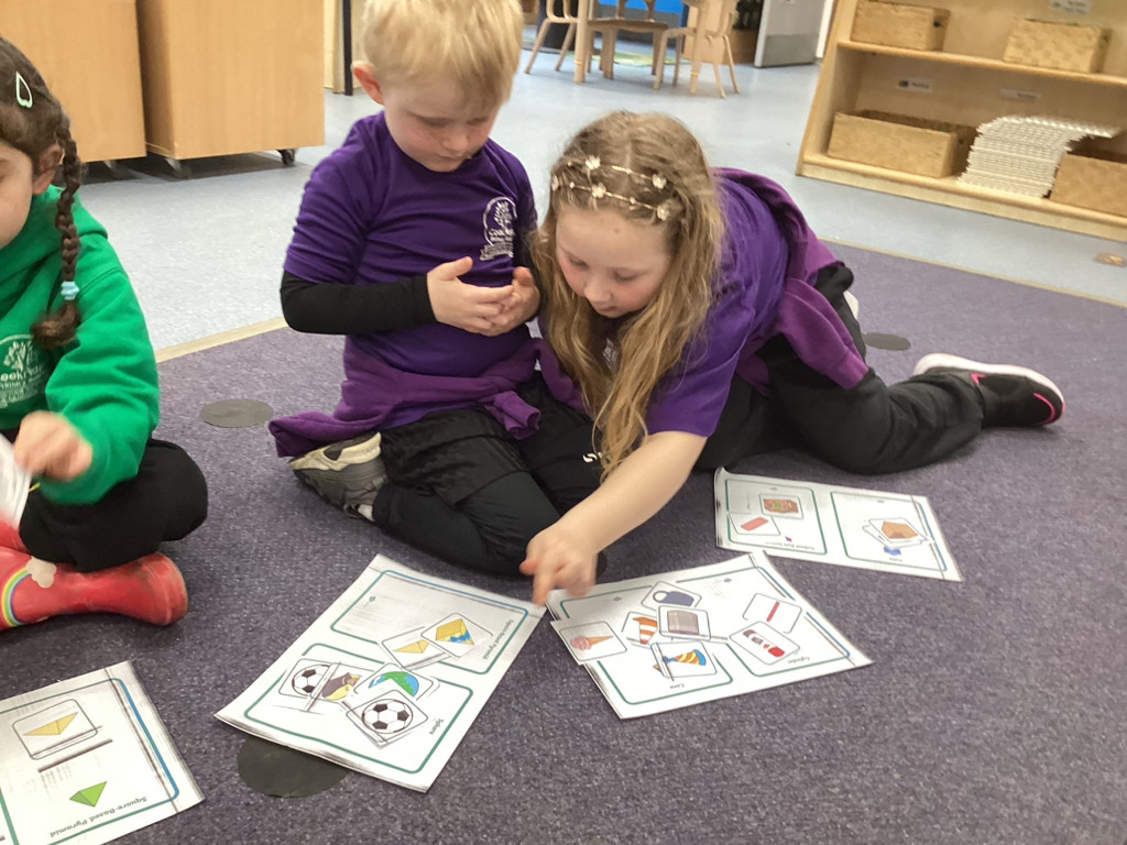 Maths work this week has focused on exploring the names and properties of 3D shapes. The children have enjoyed their hands on with hunting for shapes in our environment and playing 3D shape ‘Top Trumps’ to investigate and compare shapes.