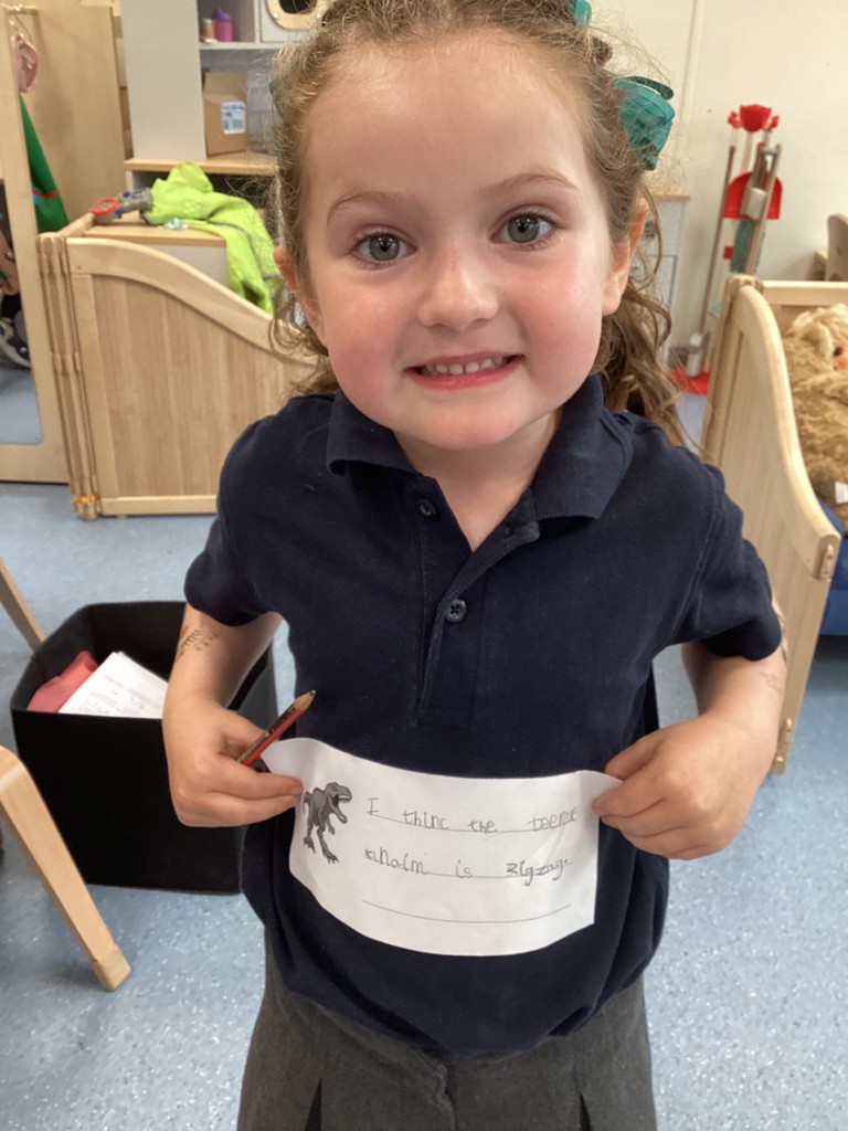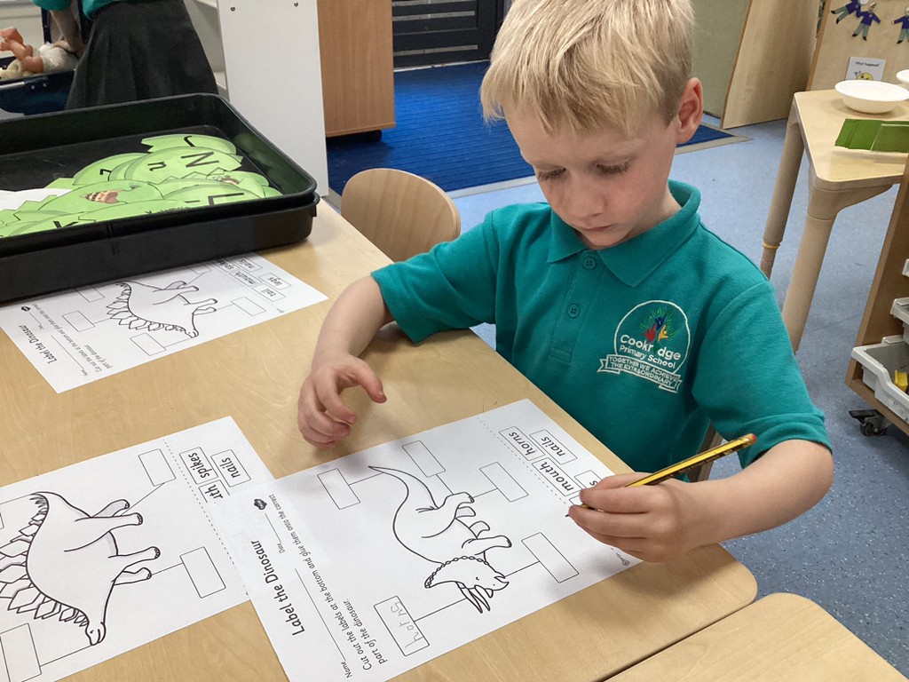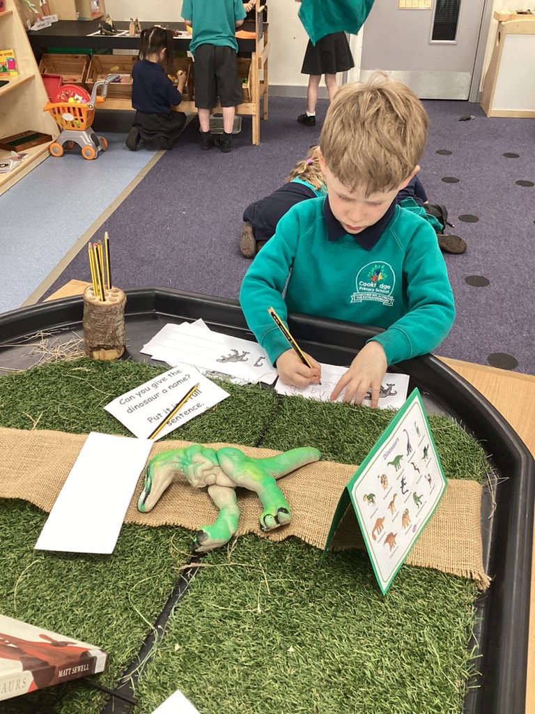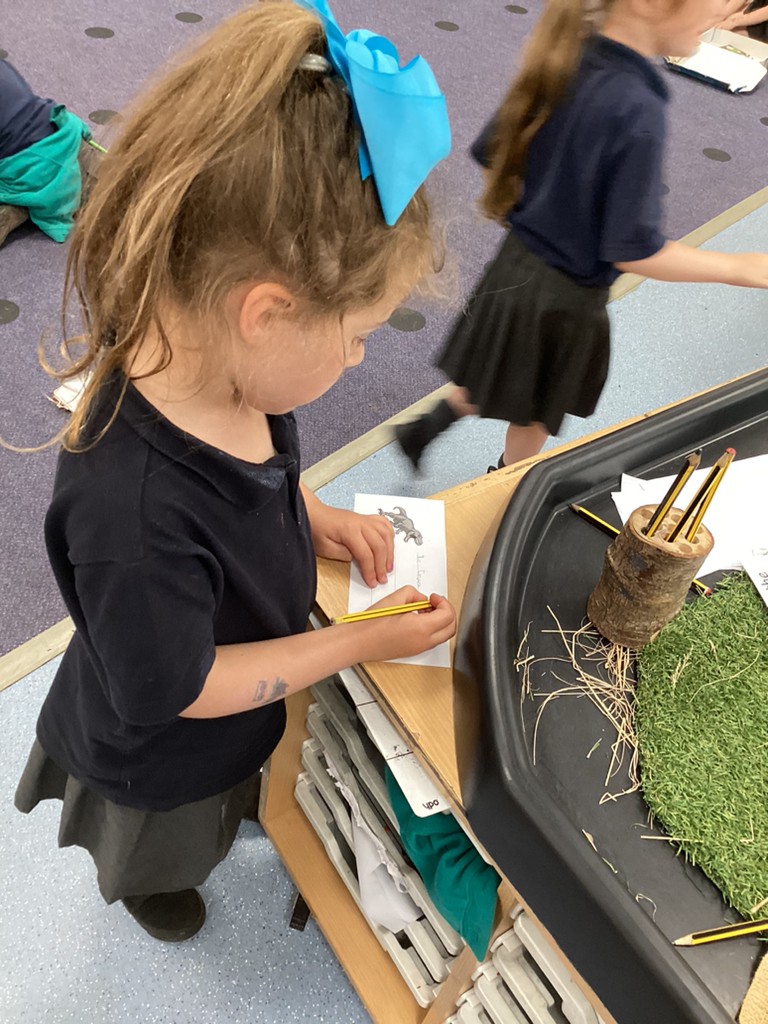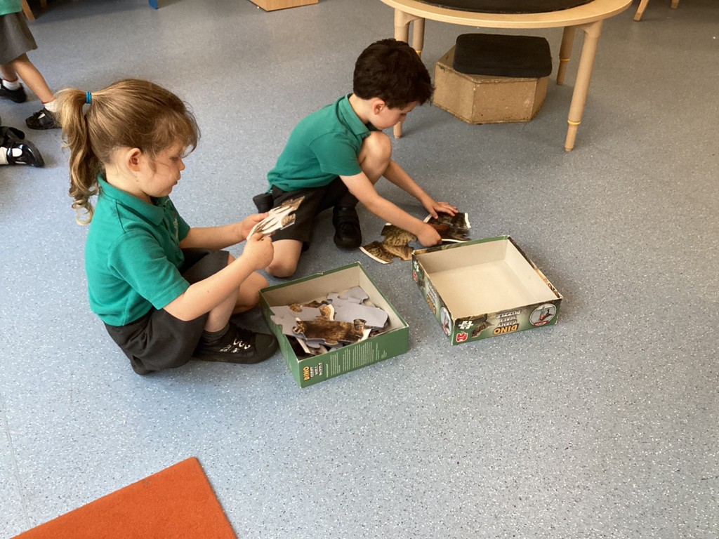 Our Dinosaurs topic has continued to inspire lots of excitement and activity. After the thrills of our dino egg hatching out, we’ve been left with a surprisingly still and quiet baby T-Rex in our class. The children have been tasked with coming up with a name for the young dinosaur and we saw some great sentence writing as a result. There have been plenty of other dino-themed activities to interest and engage the children this week, from dinosaur pastel rubbings; a dinosaur actions trail outside; and labelling different parts of a dinosaur. We also spent time reading the story Tyrannosaurus Drip by Julia Donaldson and this led us to talking about the terms carnivore and herbivore, so we got together in groups to sort animals by their diets and decide if they were carnivore, herbivore or omnivore. Also, with Mrs Ledda in Tuesday’s art sessions, the children explored how to represent ammonite fossils with clay, collage and paint.