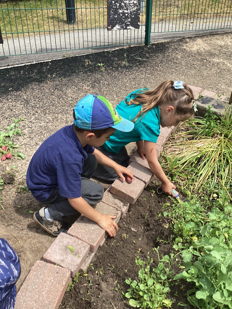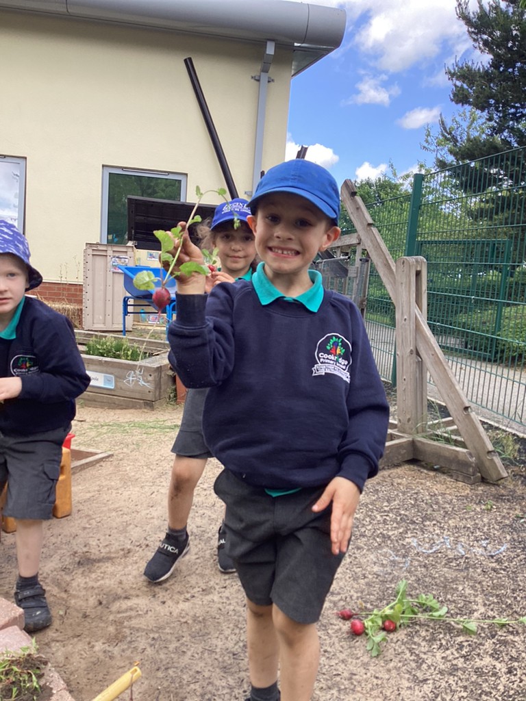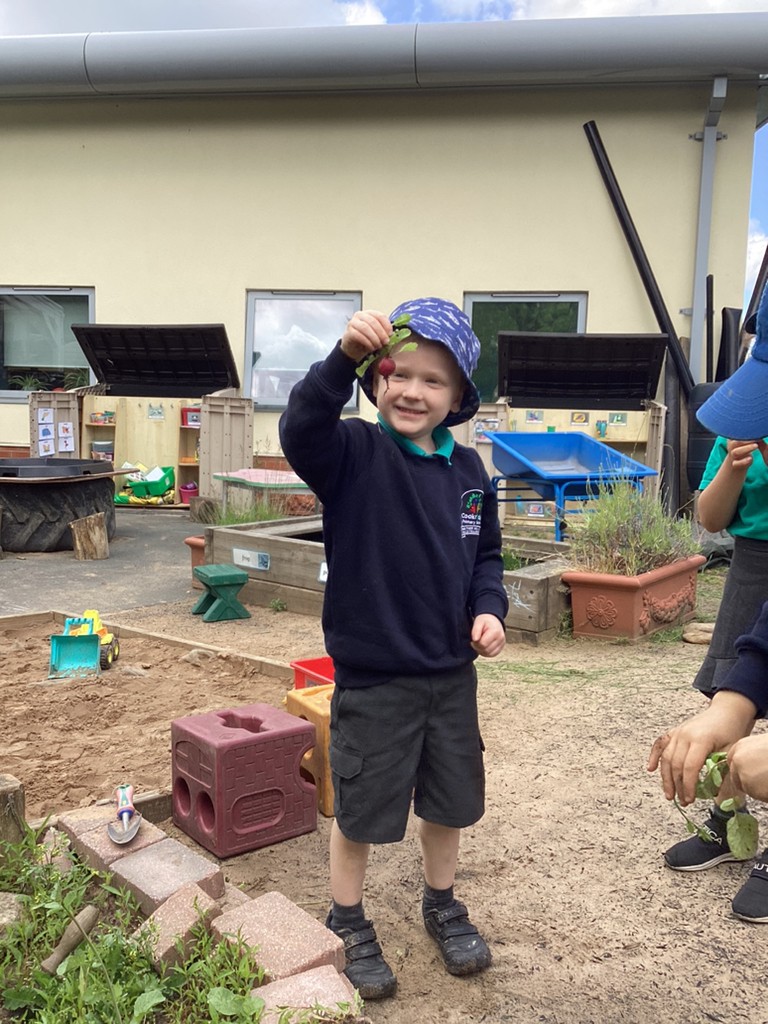 Some children have been helping in the past weeks to water our garden and to pick out the weeds, and this week we harvested some of our radishes and had a little taste. Quite a lot of children were unsure if they had tried radishes before or if they would like them but many were happy to give them a go. Responses were mixed but we had some great descriptive language as a result, with kids describing the radishes as ‘spicy’ ‘bitter’ ‘delicious’ and ‘yeauuuck!”