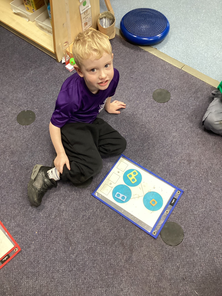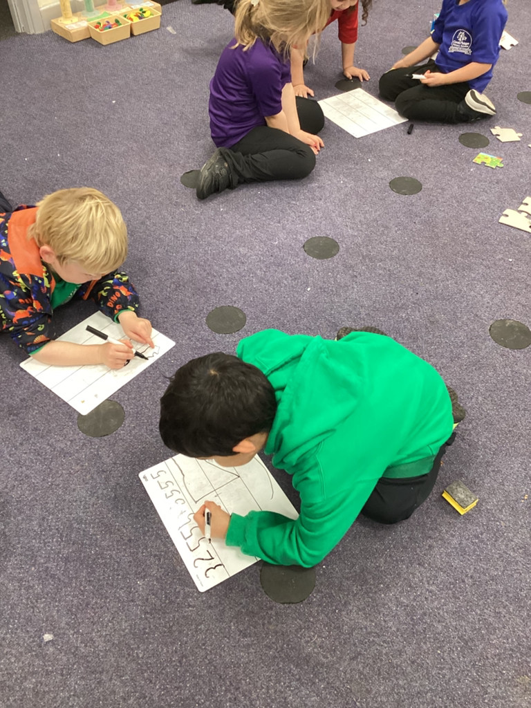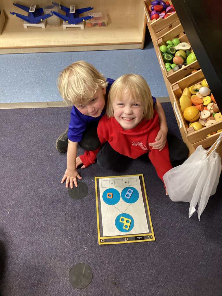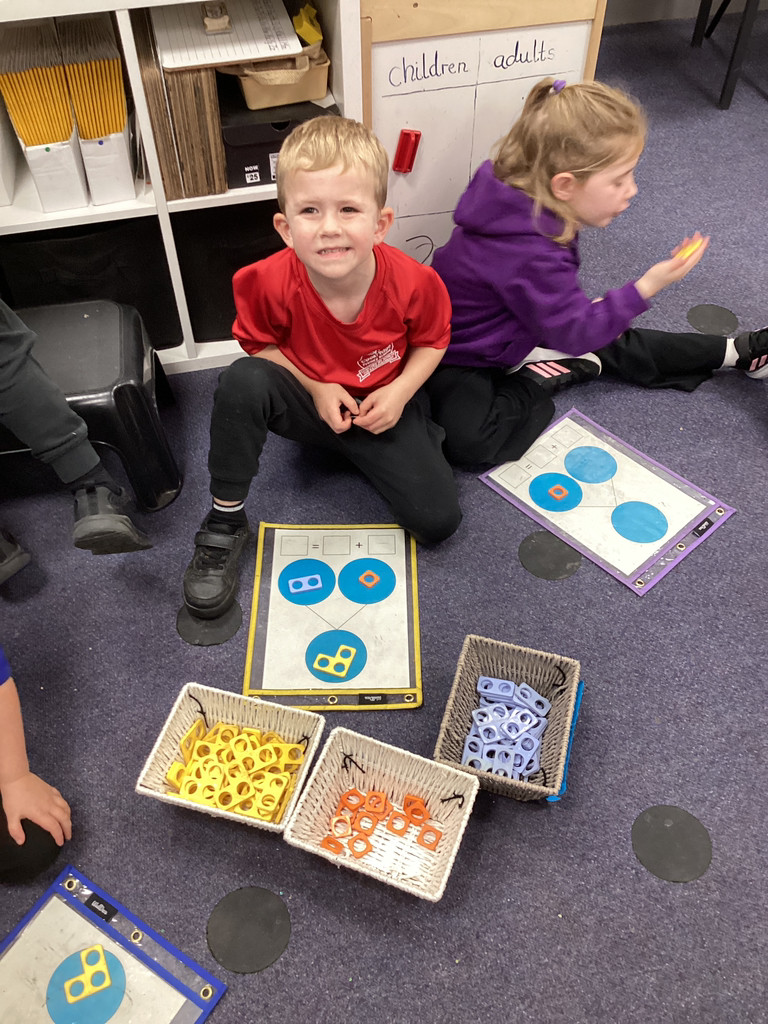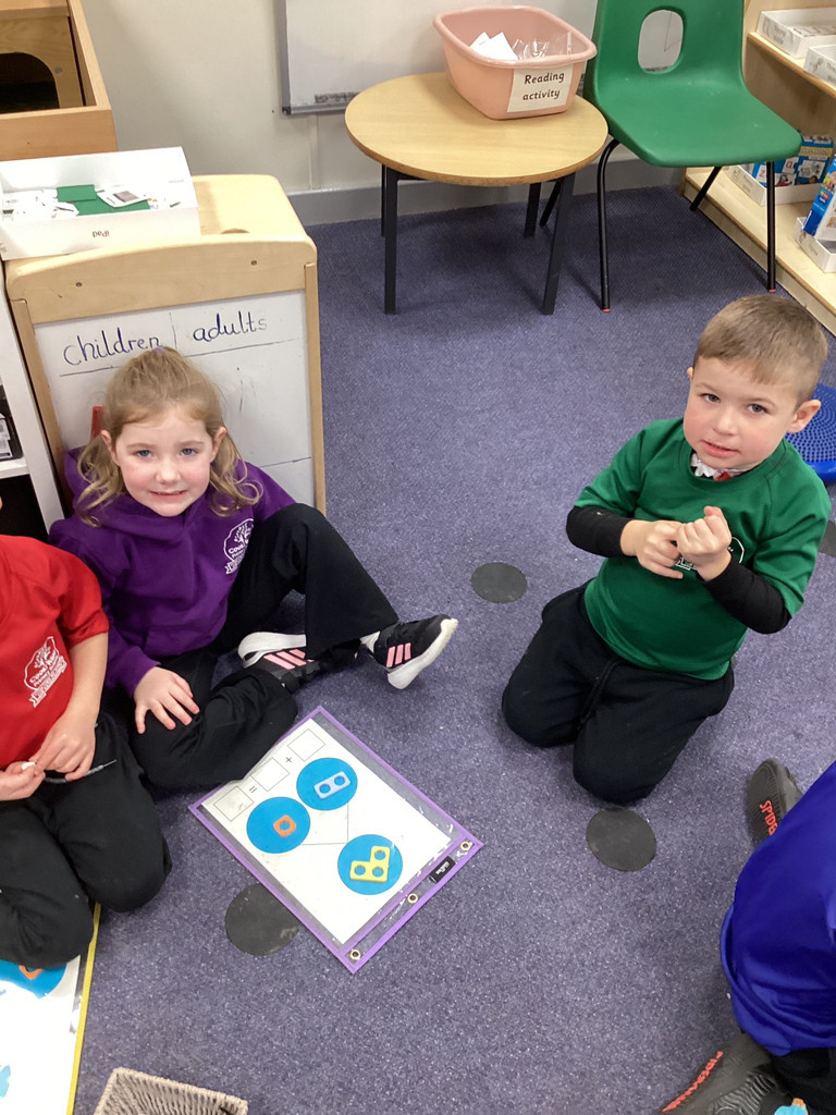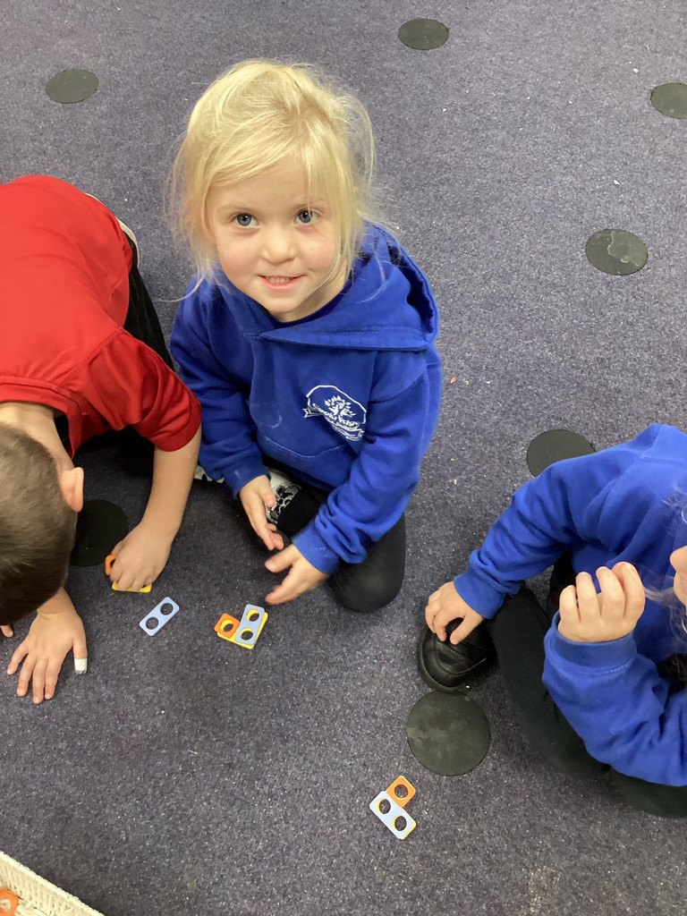 Our maths sessions have been focused on exploring numbers 1, 2 and 3. The children have used part part-whole models to investigate the make up of these numbers with numicon and bean bags, as well as retelling the story of the Three Billy Goats Gruff and discussing how many goats are on each side of the bridge at different points in the story.