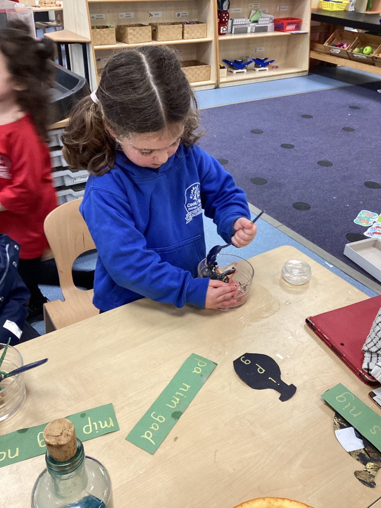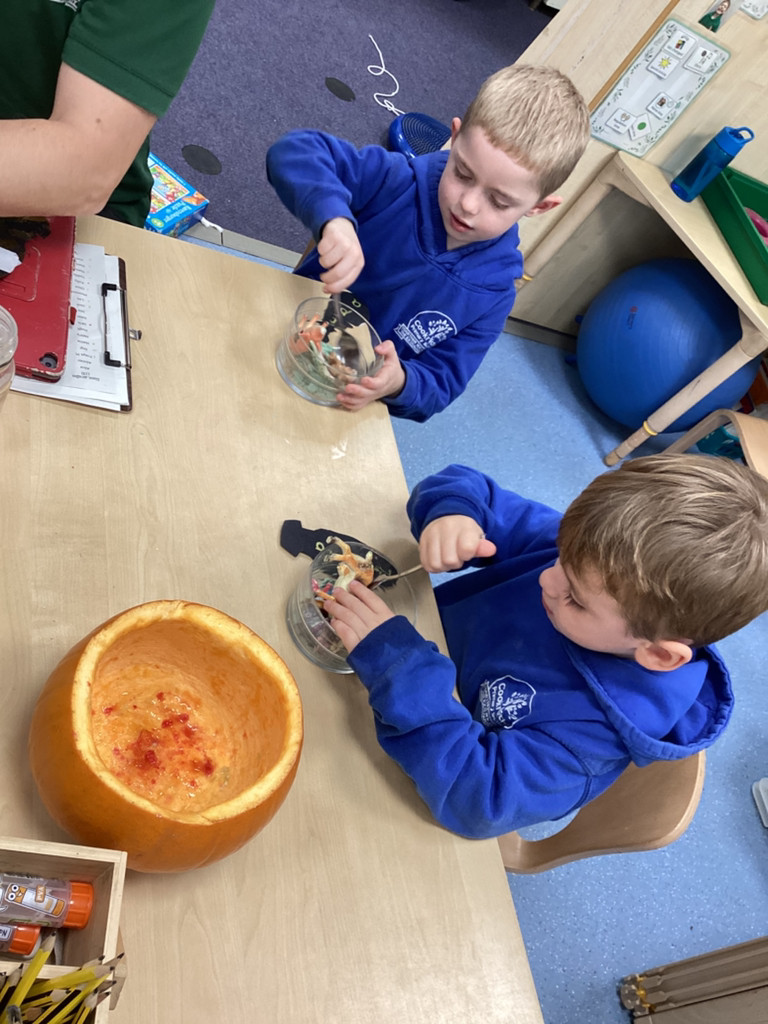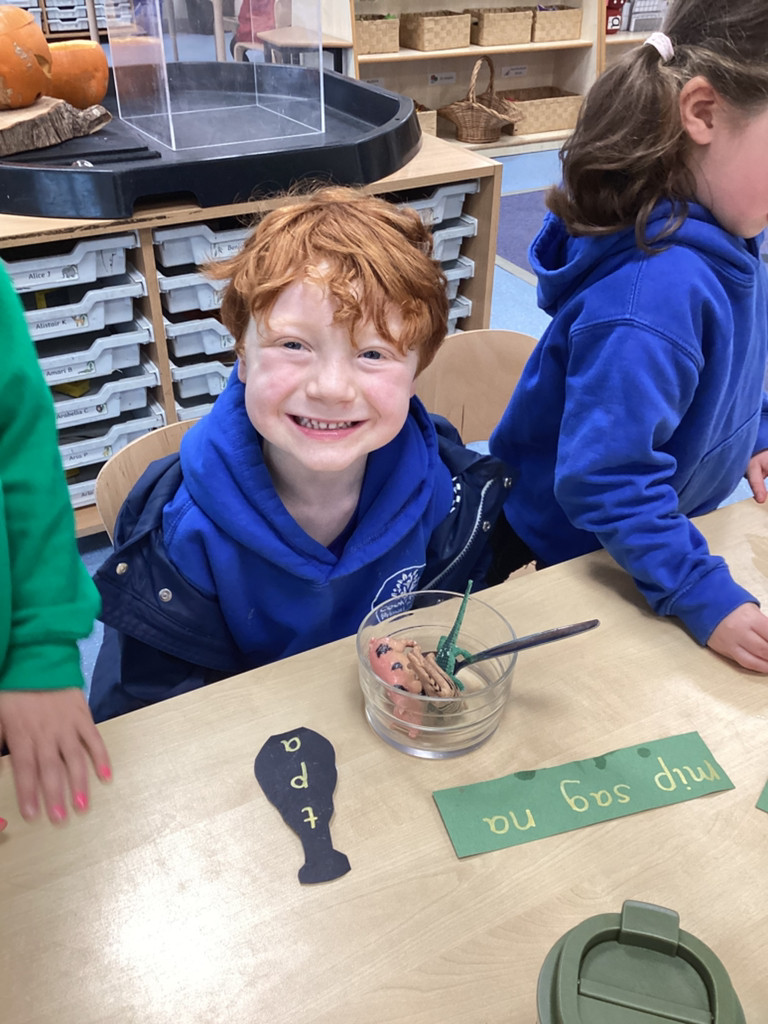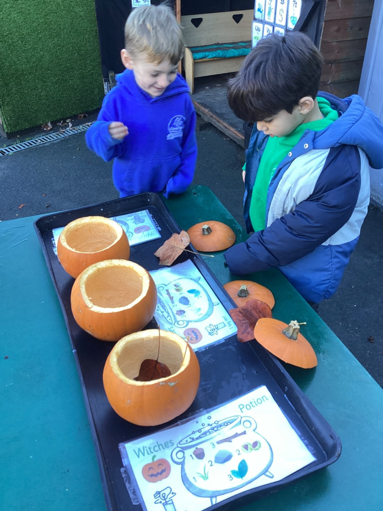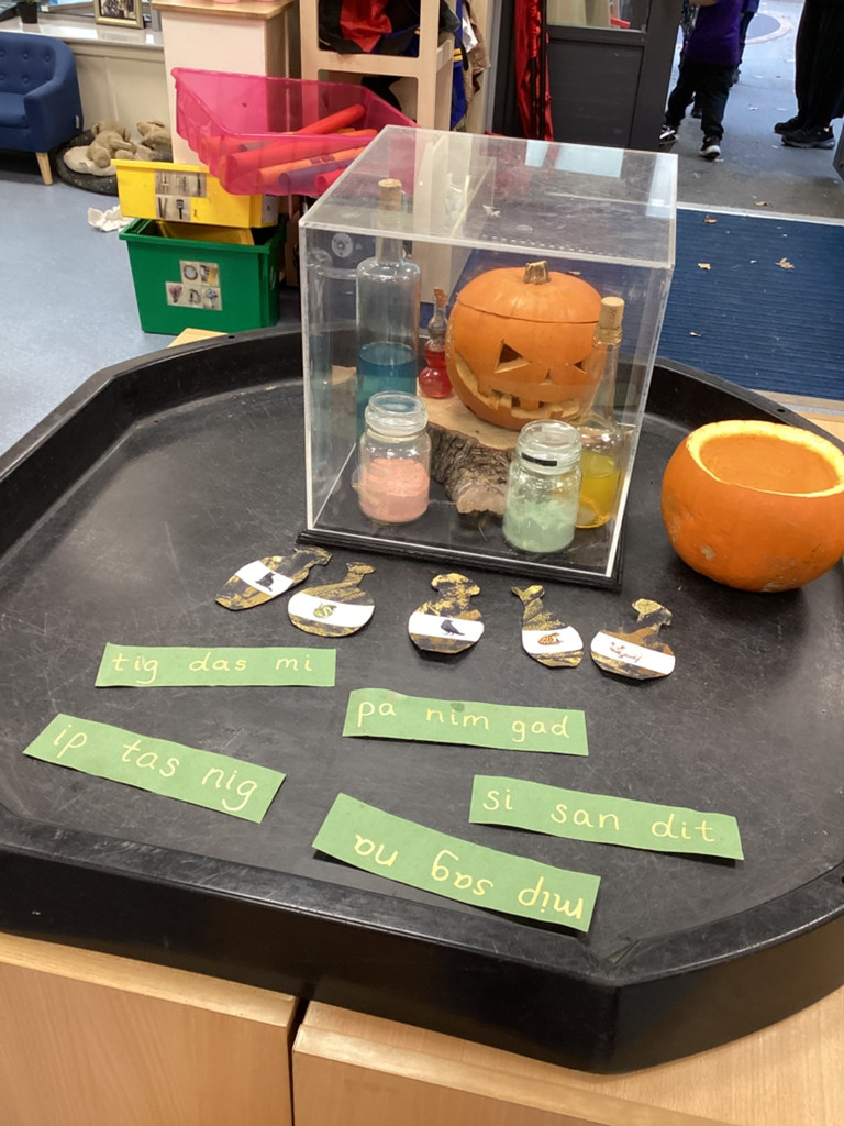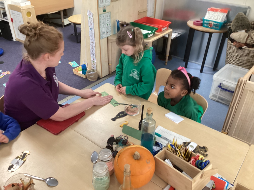 As Halloween approaches, we have enjoyed a few magical moments and spooky activities. All the children were invited to have a go at making a magic potion and casting spells on the teachers. They were first asked to pick a potion bottle, each with a different animal on it and then to look on the reverse for three golden letters. Once they had found an animal that began with each of these letters, the magic powder could be sprinkled into their cauldron. If the animals had been chosen correctly a power magic was released into the powder and all it would take is a little of the precious potion and some magic words to produce a spell to turn anyone who drank it into an animal. Given the spell to read, the children practised their blending skills to read the magic words which were recited as the potion was poured in. As the magic took hold, the children were astonished to see the potions bubble and foam (which of course proved the magic had worked). Mr Verdi and Mrs Andrews bravely took a little sip and amazingly they were momentarily transformed into pigs, snakes cats, frogs and crows. Other Halloween themed activities that were available to the children included; colouring and decorating pumpkin faces and making potions outside with Miss Bostock using some careful counting.