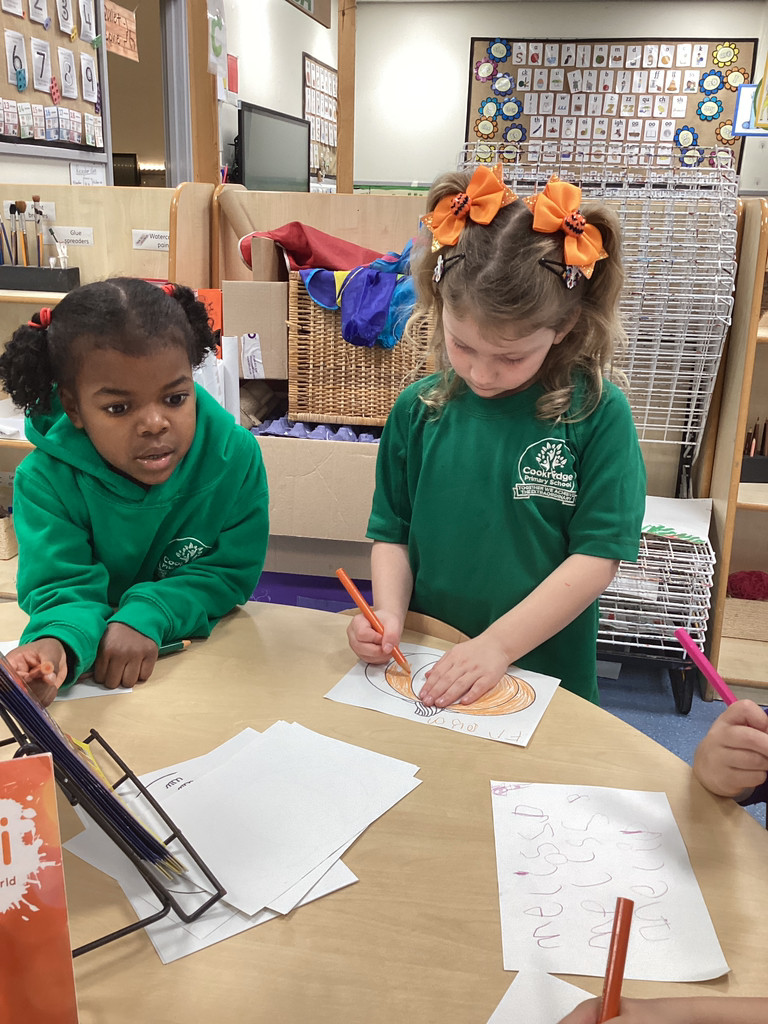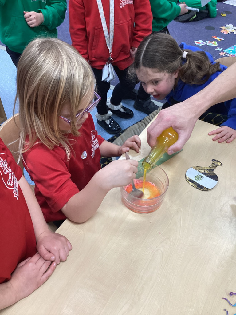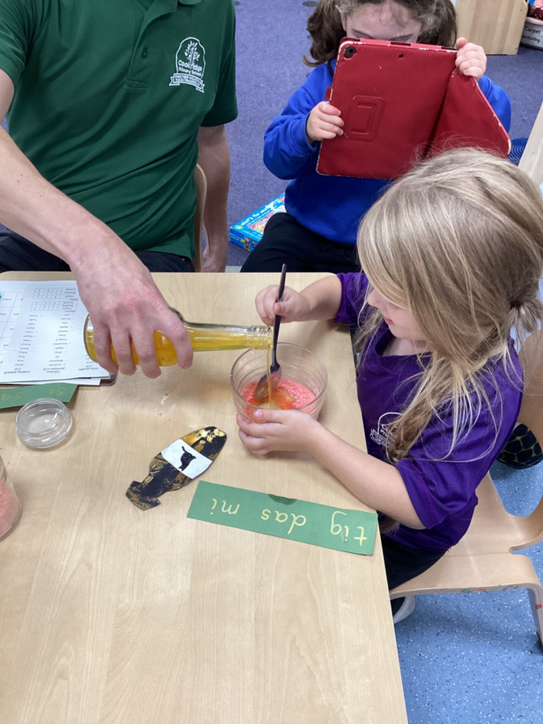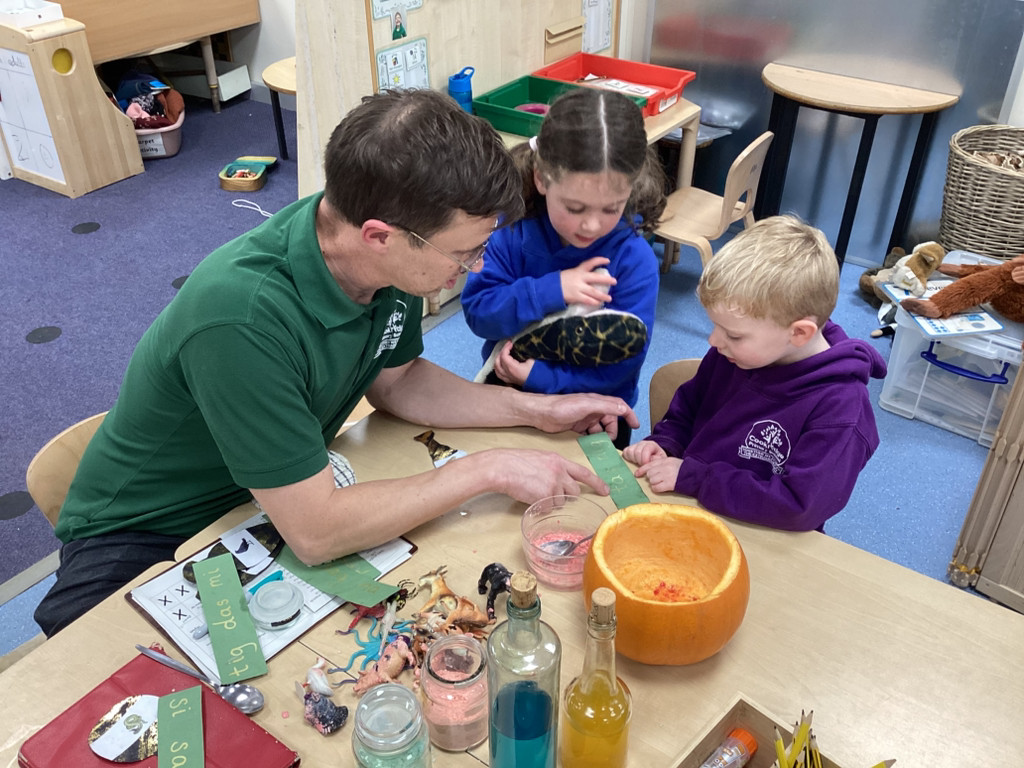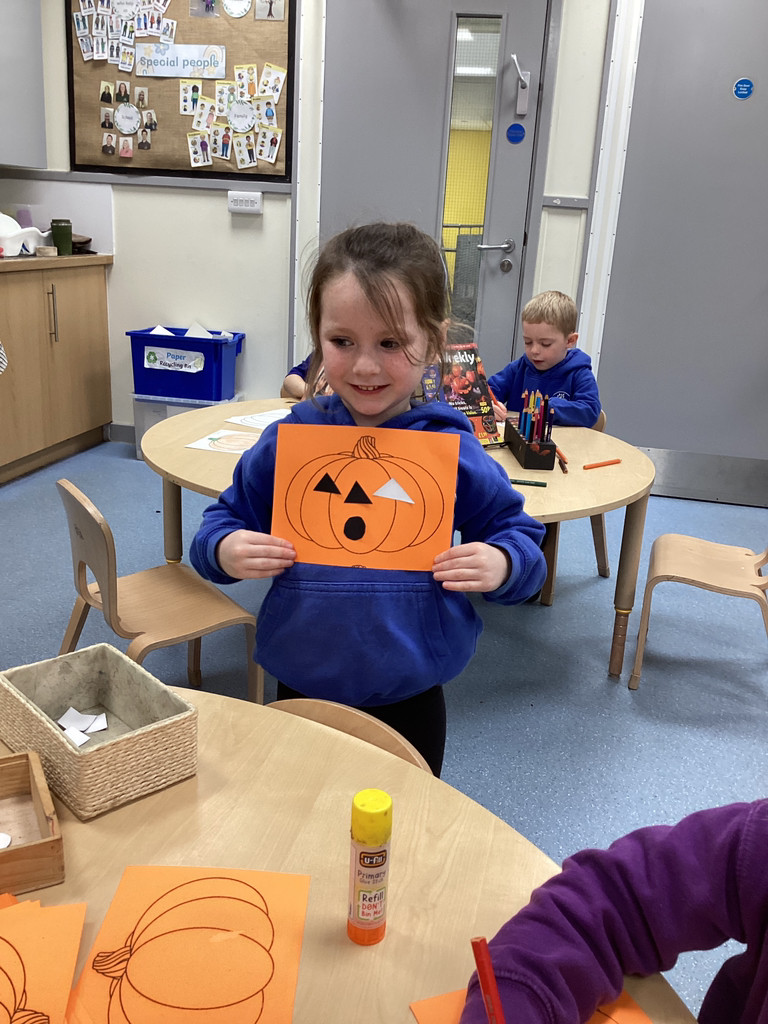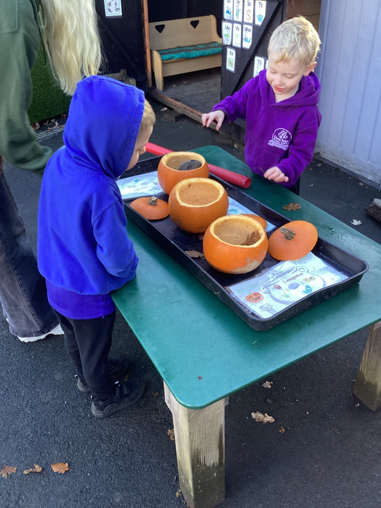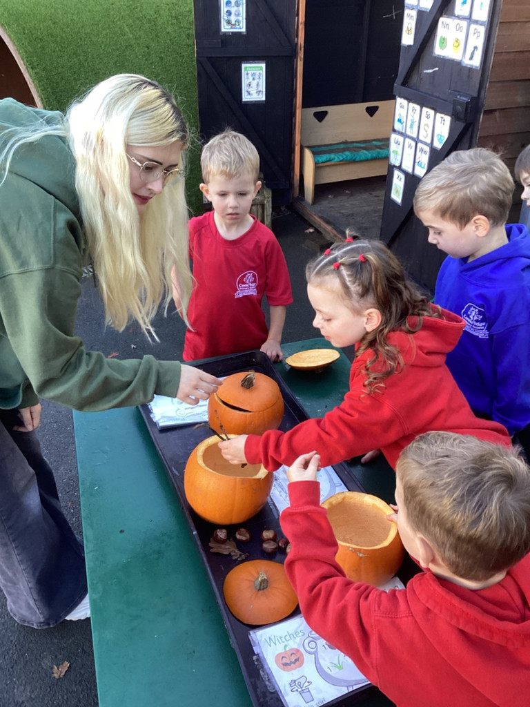 As Halloween approaches, we have enjoyed a few magical moments and spooky activities. All the children were invited to have a go at making a magic potion and casting spells on the teachers. They were first asked to pick a potion bottle, each with a different animal on it and then to look on the reverse for three golden letters. Once they had found an animal that began with each of these letters, the magic powder could be sprinkled into their cauldron. If the animals had been chosen correctly a power magic was released into the powder and all it would take is a little of the precious potion and some magic words to produce a spell to turn anyone who drank it into an animal. Given the spell to read, the children practised their blending skills to read the magic words which were recited as the potion was poured in. As the magic took hold, the children were astonished to see the potions bubble and foam (which of course proved the magic had worked). Mr Verdi and Mrs Andrews bravely took a little sip and amazingly they were momentarily transformed into pigs, snakes cats, frogs and crows. Other Halloween themed activities that were available to the children included; colouring and decorating pumpkin faces and making potions outside with Miss Bostock using some careful counting.