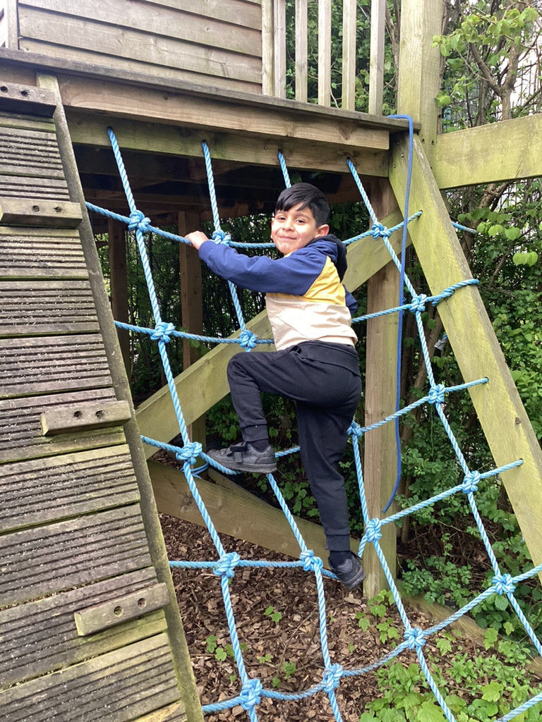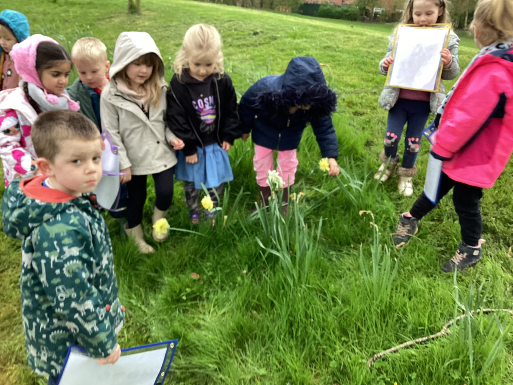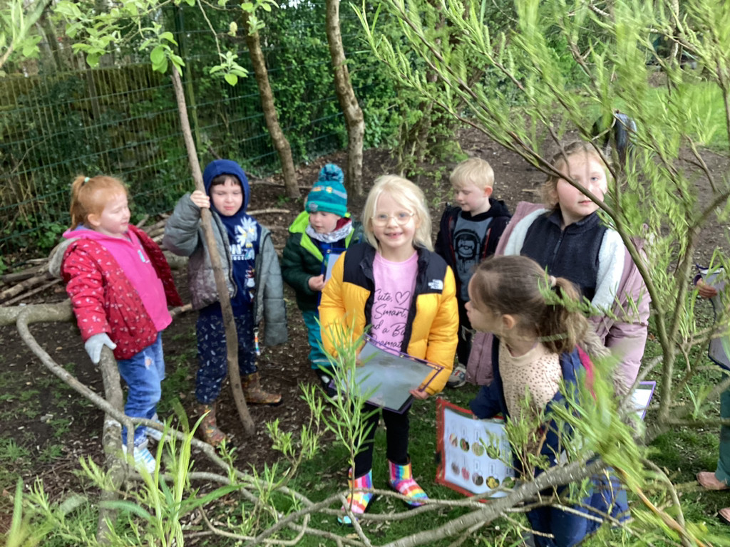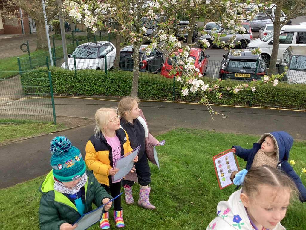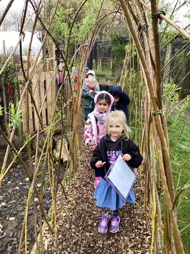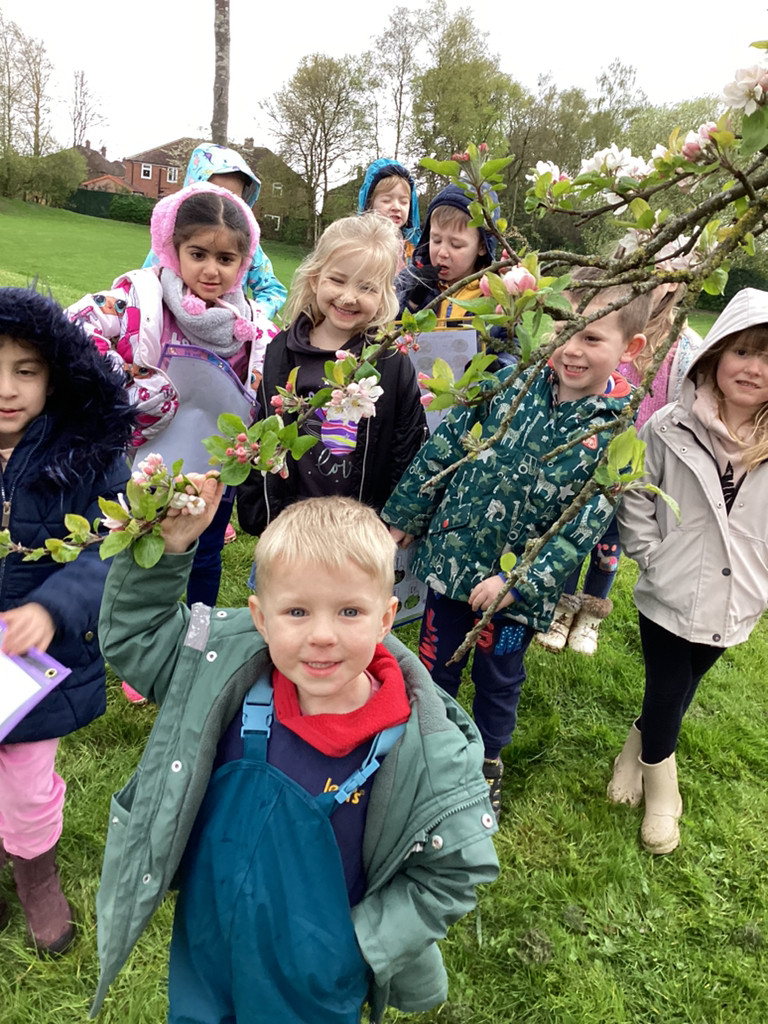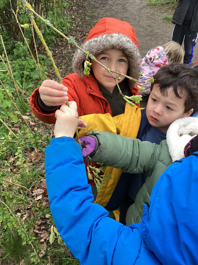 Thursday brought our regular Forest Schools session which found us out in the school garden despite some very mixed weather. To support our topic of ‘Let It Grow!’ we set off in small groups to explore the school grounds for signs of Spring. Despite a rather chilly walk interrupted by a heavy hailstorm we did manage to spot many signals that life is returning to Cookridge Primary School with lots of new leaves, buds, blossom and emerging seedlings the Kitchen Garden. At one point, we even happened upon Nigel and Doughnut out on a walk with and enjoying a munch on some of these fresh Spring growth on the school field. The children also got to enjoy the welcome return of the newly repaired treehouse equipment (following storm damage in the winter). All in all, we had a lovely time and anticipate some more Spring-like weather next time!