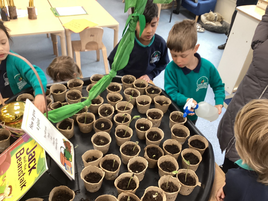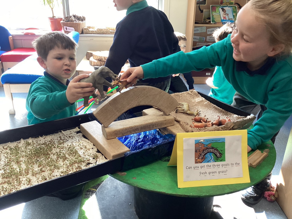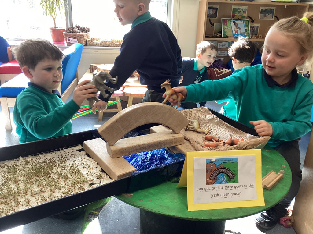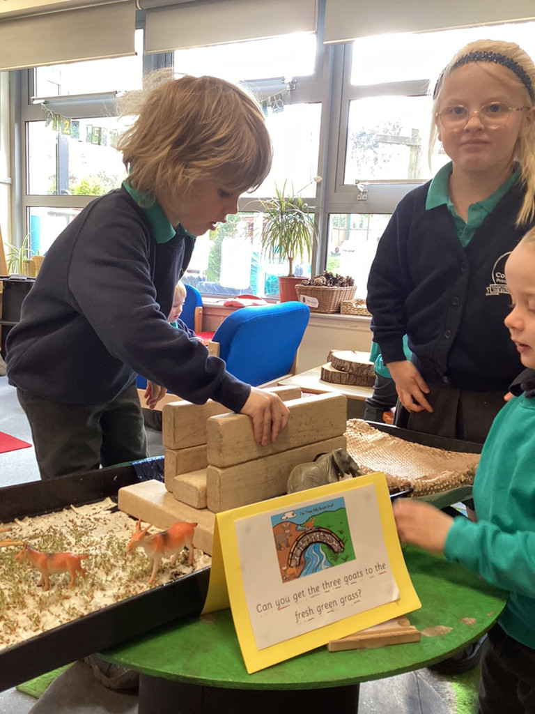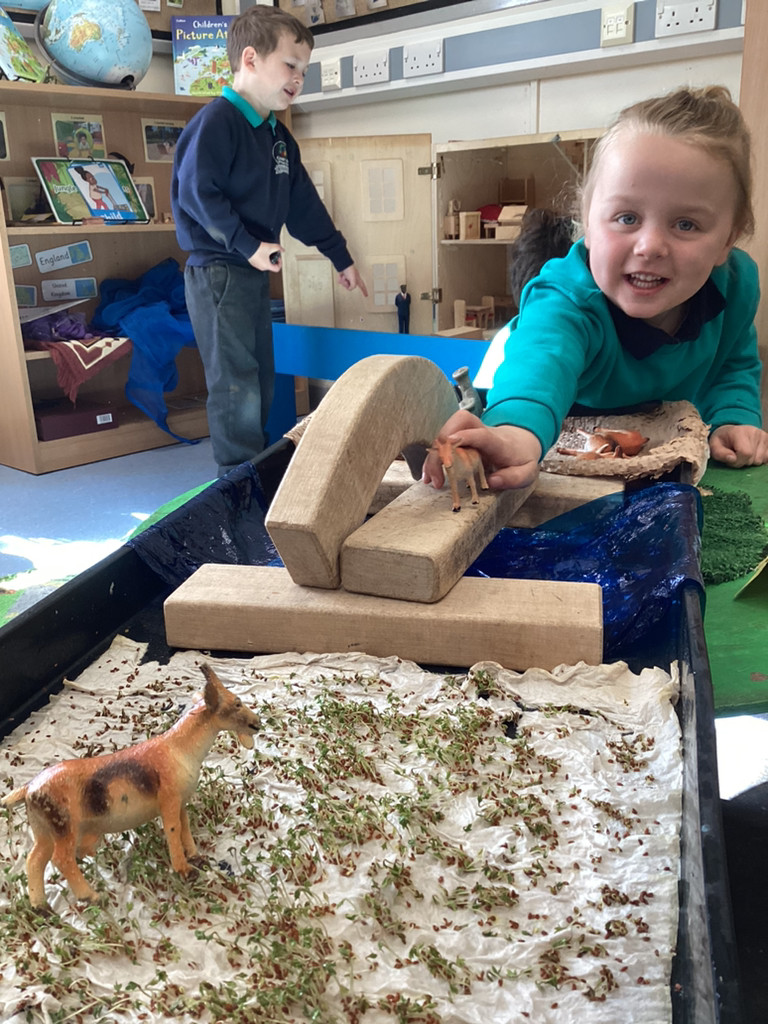 It’s been a full and fun-packed week again in Reception! We have continued our topic of ‘Let it Grow’ by tending to our plants and checking on their progress, despite the Spring weather proving reliably unreliable. The children have added to their bean diary booklets to record the progress since planting their bean last week, and we are starting to see small seedlings from the radish seeds we planted outside too. We also built a small-world play set up to roleplay the story of the Three Billy Goats Gruff. To create a meadow of ‘fresh green grass’ the children all helped to sprinkle cress seeds and helped to keep them watered all week as they sprouted. The children have then been tasked with building a bridge to help the goats cross the river (and avoid the troll!) to reach the new growth! Of course these were toy goats, our Cookridge goats Doughnut and Nigel did make a cameo on our nature walk during Thursday’s Forest Schools session – but more of that later!