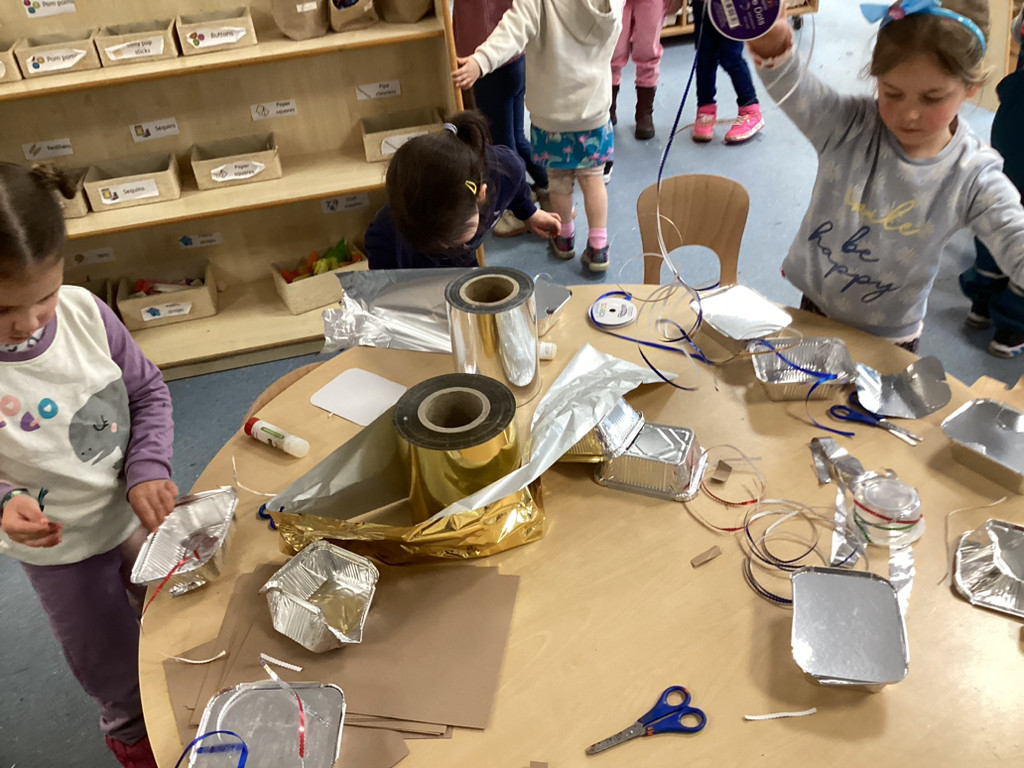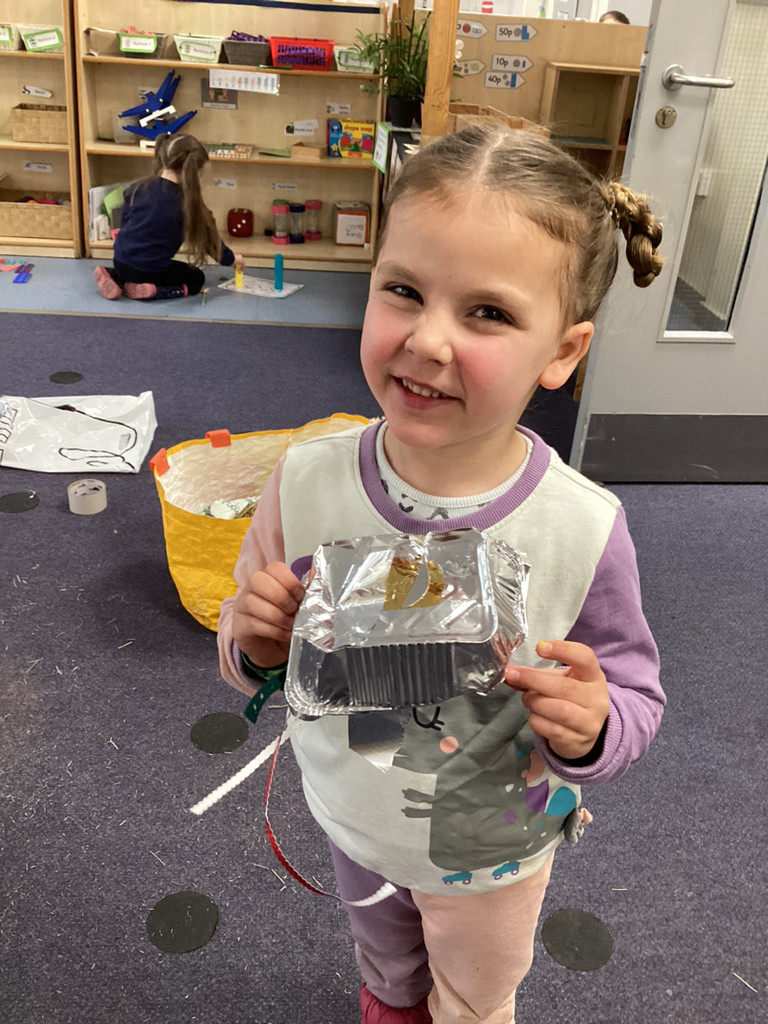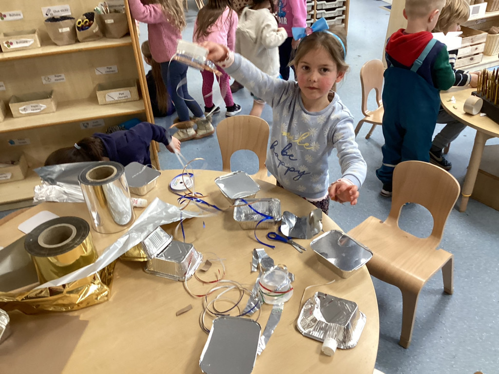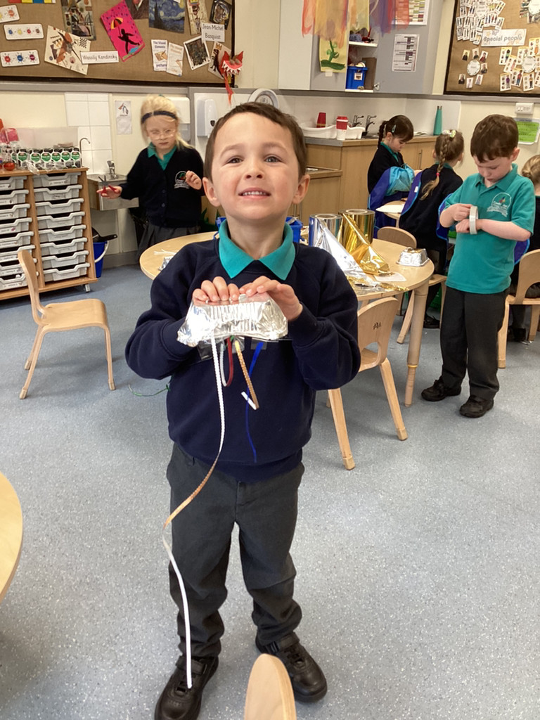 While thinking of all our precious seedlings, we got to talking about how farmers have protected their crops through the years. From employing children armed with stones, and building traditional straw scarecrows to more modern methods of using rotating bird-scarers and movement-sensitive water sprinklers we saw how plants have been guarded from pesky birds. This was all prompted by an invitation to enter a scarecrow into the upcoming Cookridge Scarecrow trail. Lots of children have worked together to help begin building our (as-yet-unnamed) scarecrow and we shall add the finishing touches next week before sending them off to frighten the birds. To guard our own seedling in the Reception garden, the children were encouraged to try putting together their own bird-scarers from shiny tins, containers, ribbons and foil. There were some fabulous efforts, and with these blowing in the breeze, our radishes are surely safe from curious crows.