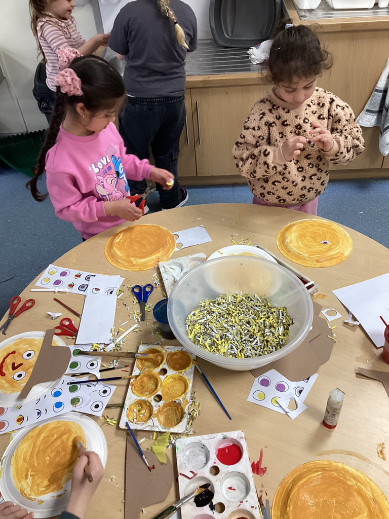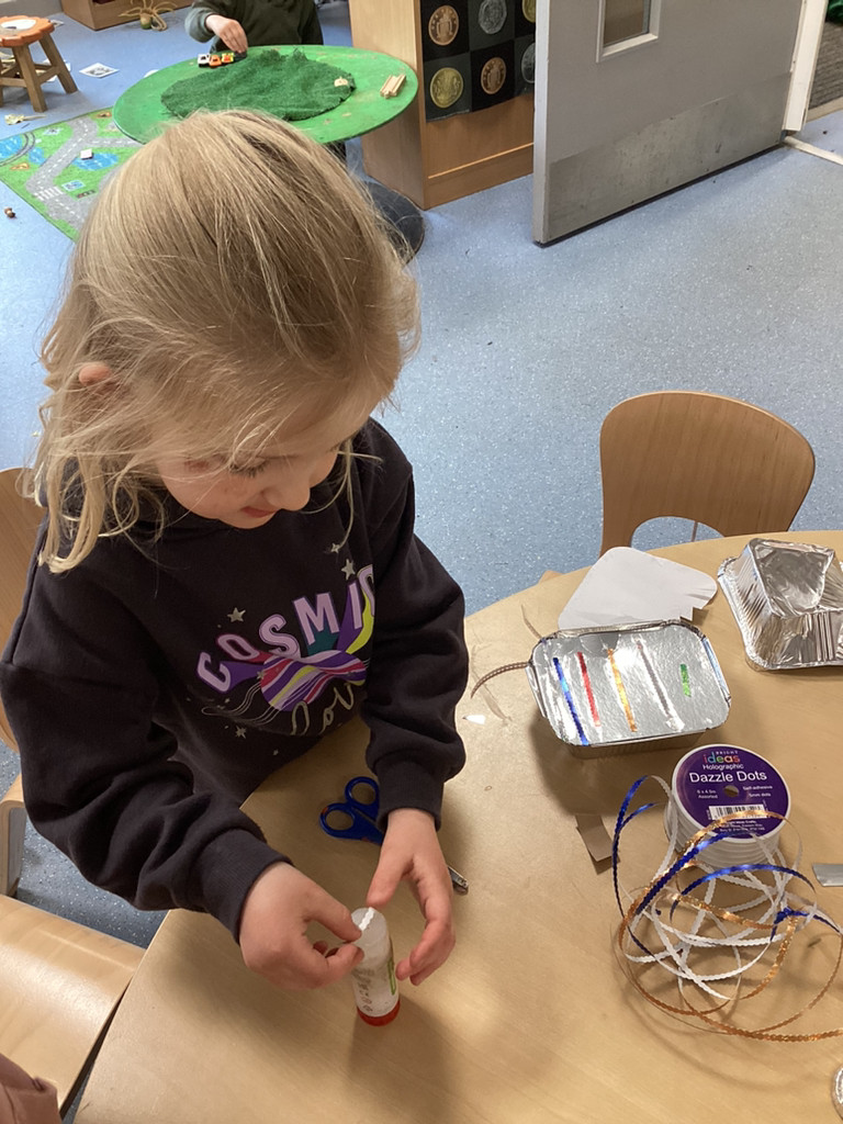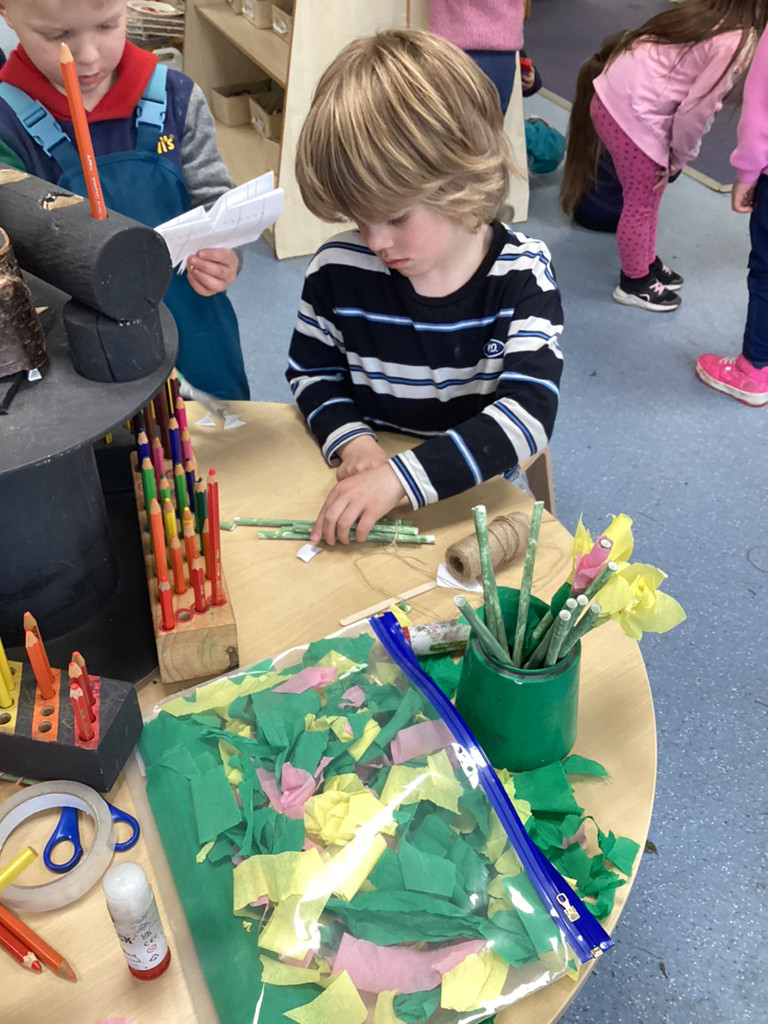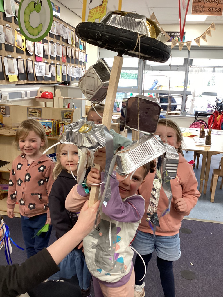 While thinking of all our precious seedlings, we got to talking about how farmers have protected their crops through the years. From employing children armed with stones, and building traditional straw scarecrows to more modern methods of using rotating bird-scarers and movement-sensitive water sprinklers we saw how plants have been guarded from pesky birds. This was all prompted by an invitation to enter a scarecrow into the upcoming Cookridge Scarecrow trail. Lots of children have worked together to help begin building our (as-yet-unnamed) scarecrow and we shall add the finishing touches next week before sending them off to frighten the birds. To guard our own seedling in the Reception garden, the children were encouraged to try putting together their own bird-scarers from shiny tins, containers, ribbons and foil. There were some fabulous efforts, and with these blowing in the breeze, our radishes are surely safe from curious crows.