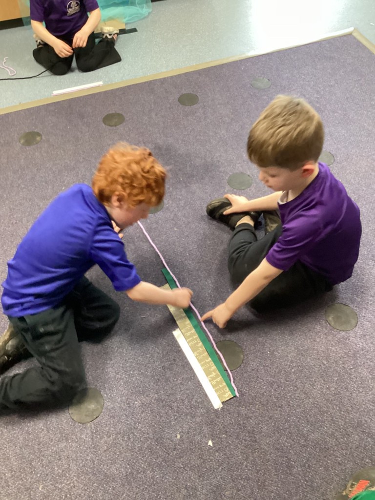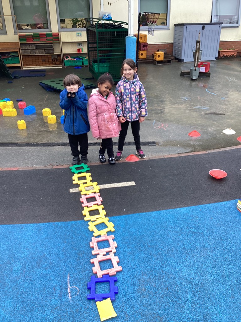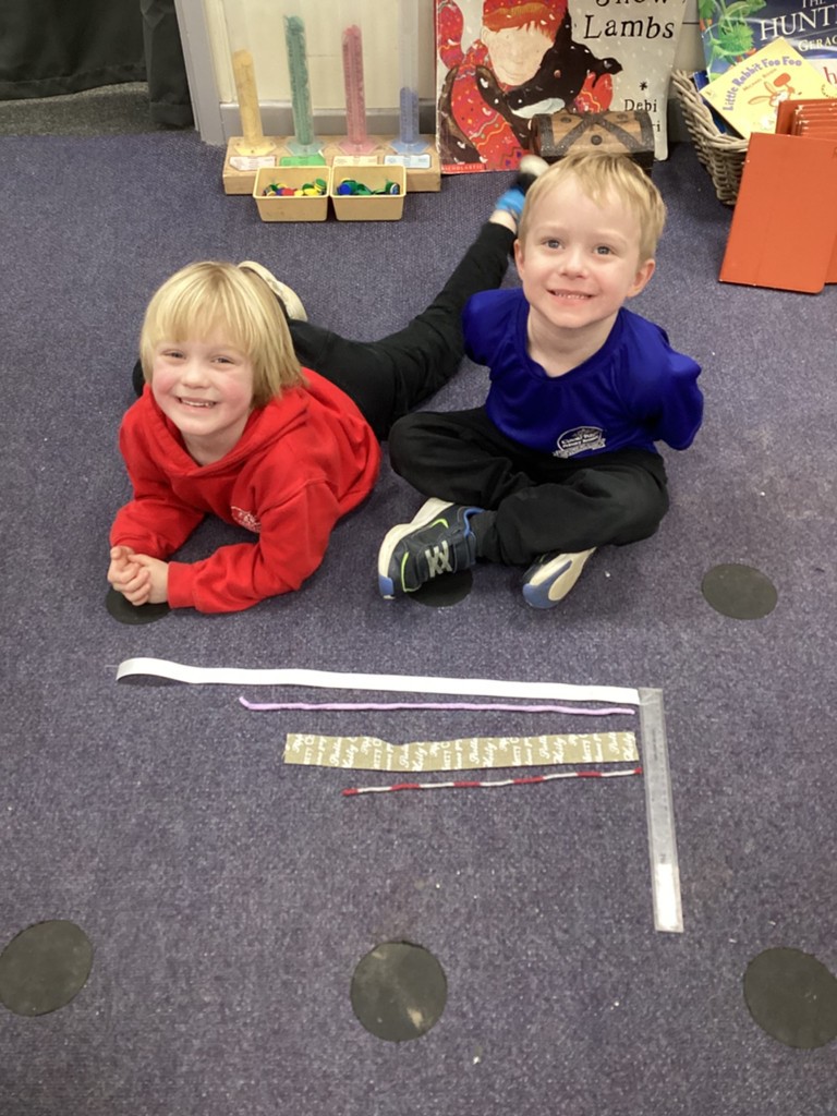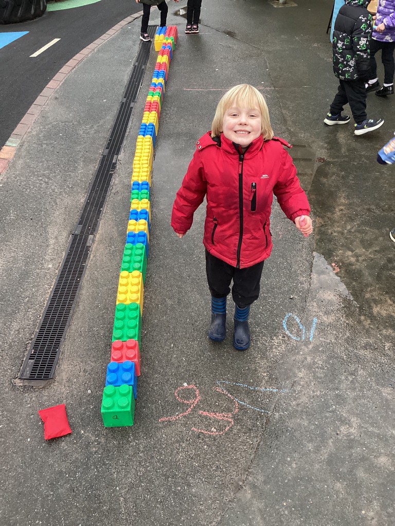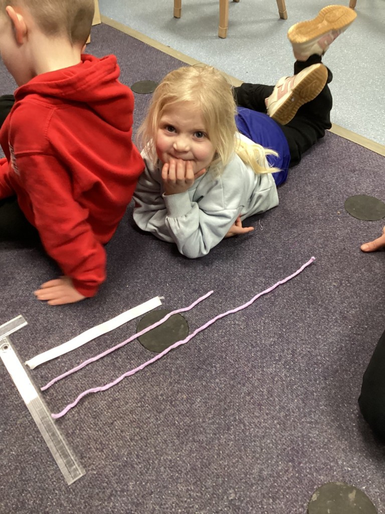 Maths this week has seen us investigating measurement again and the vocabulary around comparing sizes in different ways. One activity saw the children comparing lengths of string and ribbon and putting them in order from shortest to longest; another saw children measuring height in non-standard measures by using cubes to see how tall different objects were; and outside the children threw bean bags and then measured the distance by using their own footsteps to see who threw the farthest.