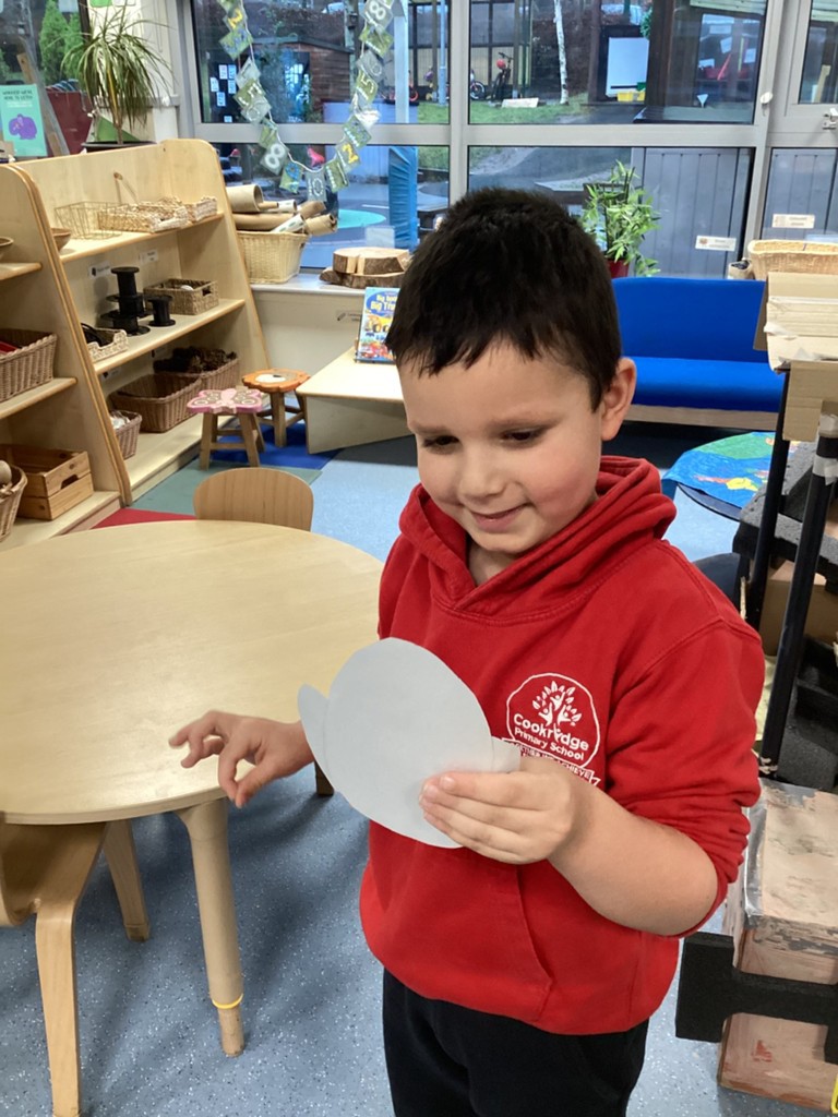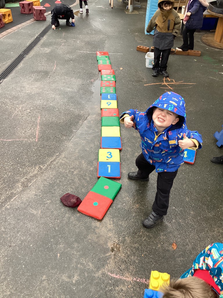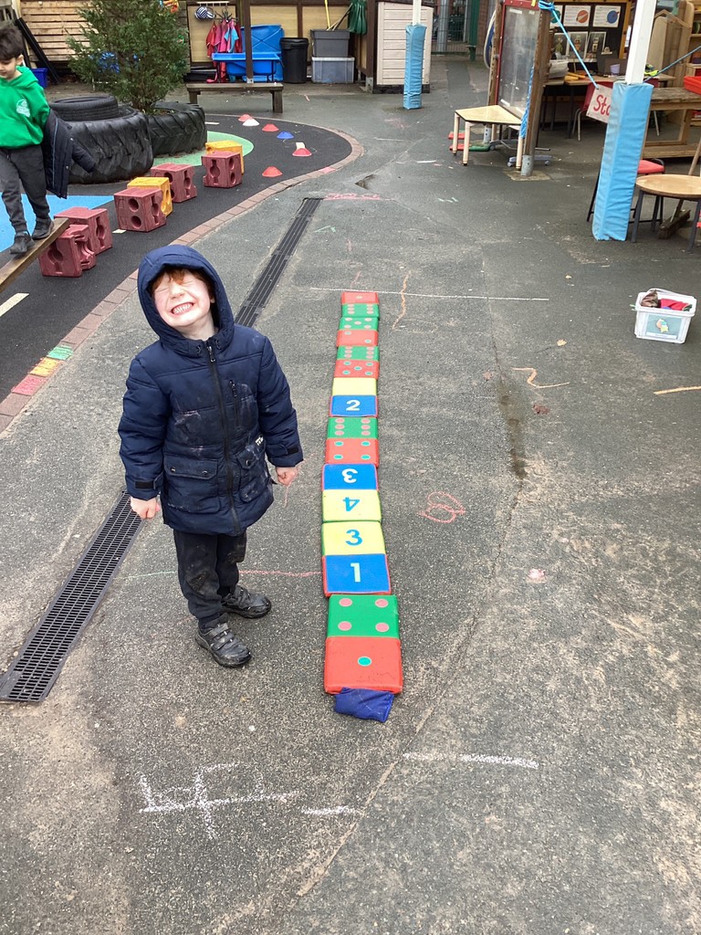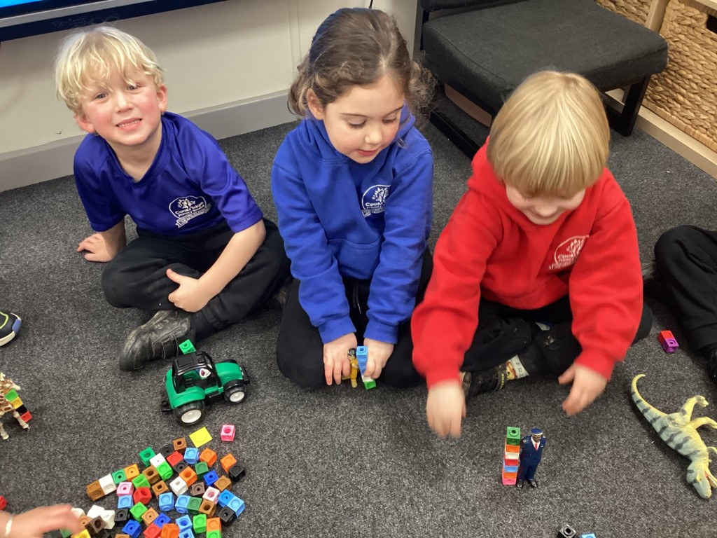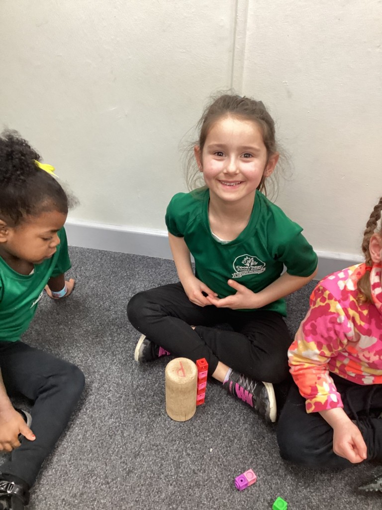 Maths this week has seen us investigating measurement again and the vocabulary around comparing sizes in different ways. One activity saw the children comparing lengths of string and ribbon and putting them in order from shortest to longest; another saw children measuring height in non-standard measures by using cubes to see how tall different objects were; and outside the children threw bean bags and then measured the distance by using their own footsteps to see who threw the farthest.