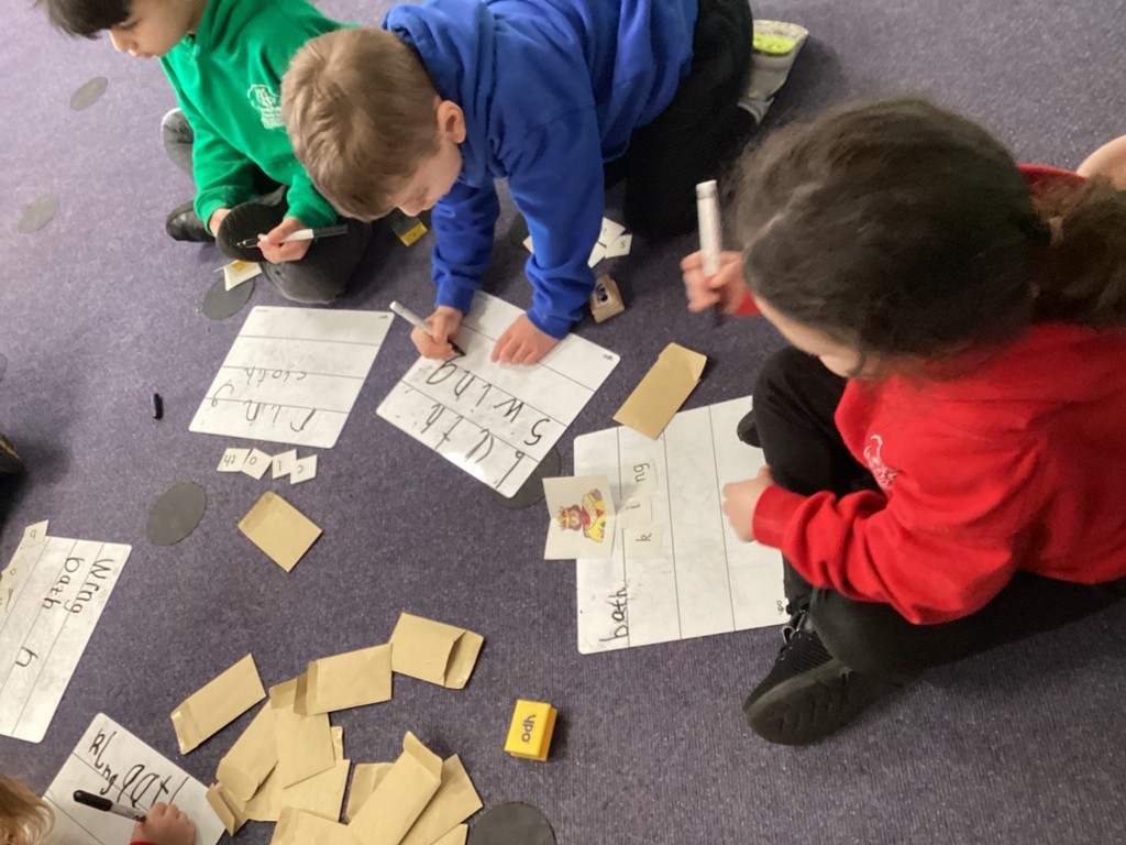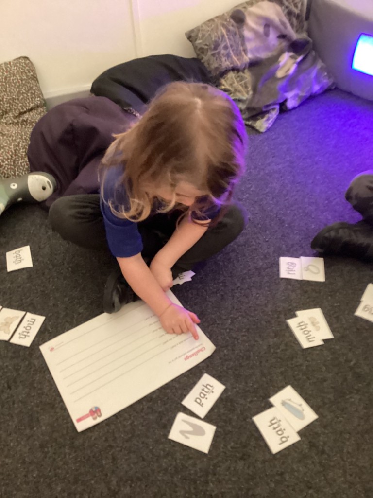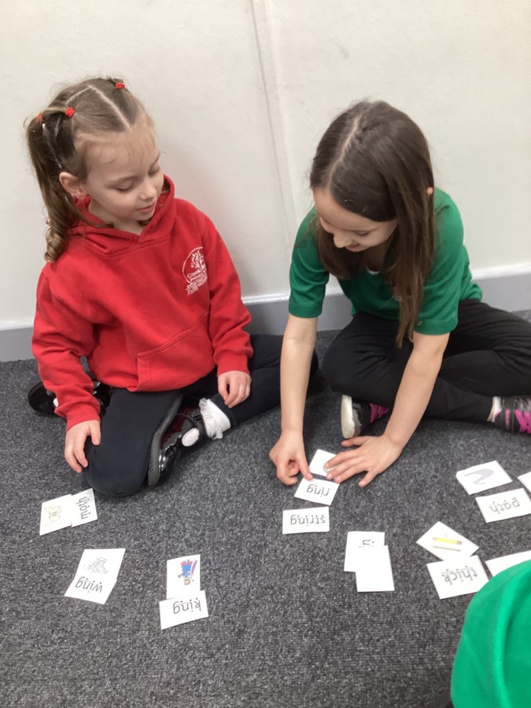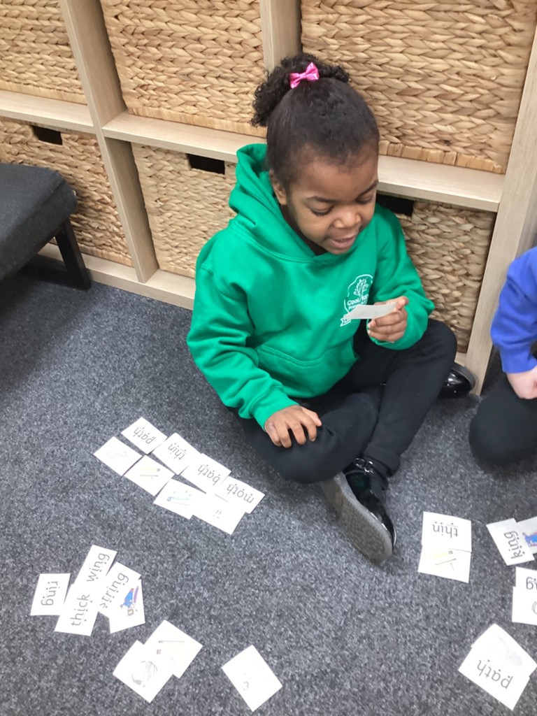 In our phonics sessions this week, we have introduced the Phase 3 digraphs ‘ng’ (ring) th (moth) and th (feather). The digraphs (where two letters together make one sound) can appear at the beginning, in the middle or at the end of words, so the children need to be able to recognise them and the sounds they make. For each of these digraphs the children have rehearsed recognising them, writing them accurately and reading them within words and sentences. The children read words carefully and matched the to corresponding pictures and took to their writing books to practise spelling out words featuring the new digraphs. Most fun of all however was the game of ‘Thing in a Ring’ where players were tasked to throw a ‘thing’ into a ring in order to win letters for their team. When they had gathered enough letters the team had to arrange them to make words featuring the ‘ng’ digraph and then find the matching picture.