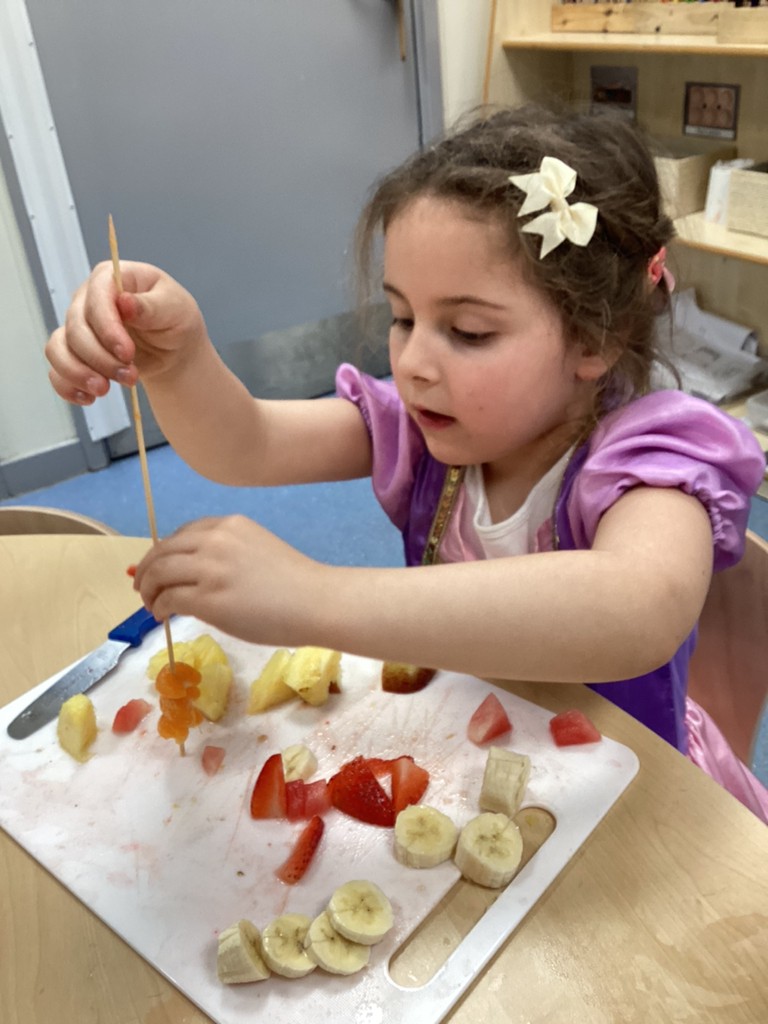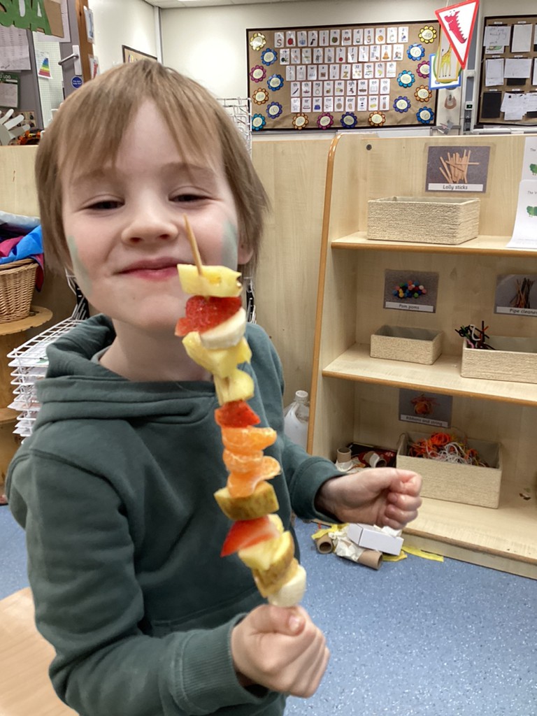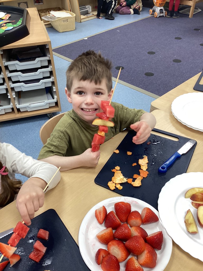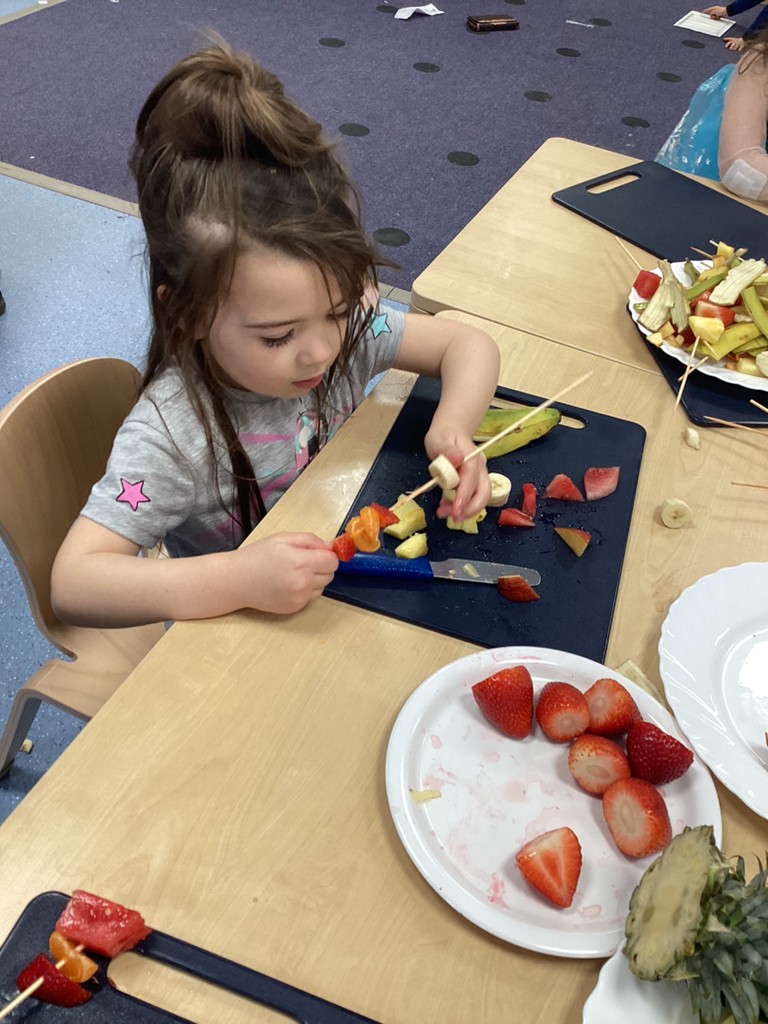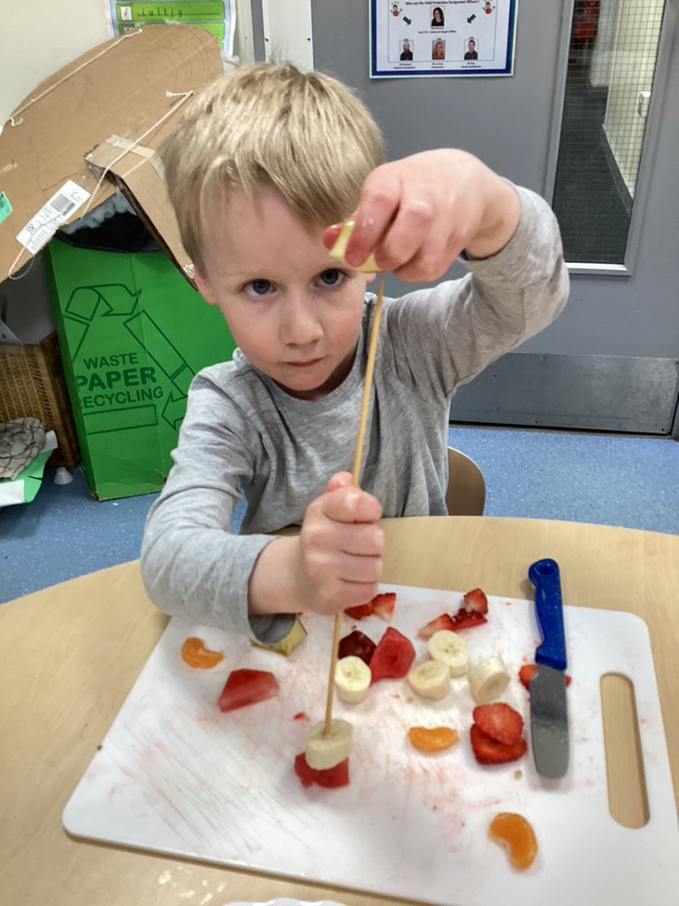 In the afternoon we learnt how to use a knife safely to chop fruit and used this skill to make (and then eat) our own fruit kebabs!