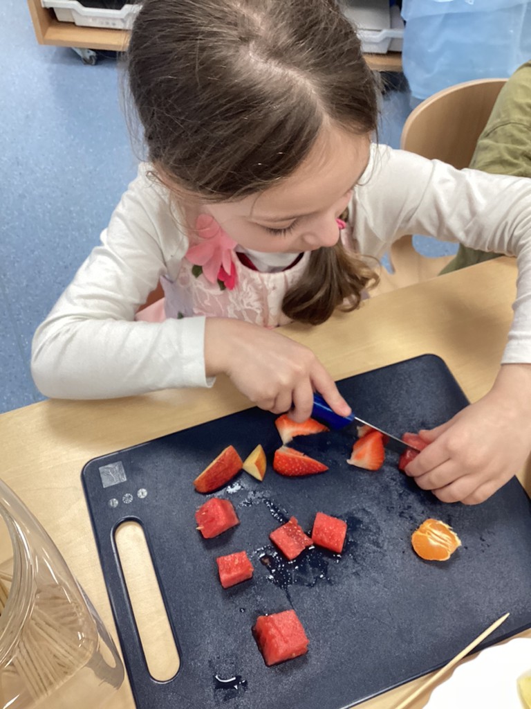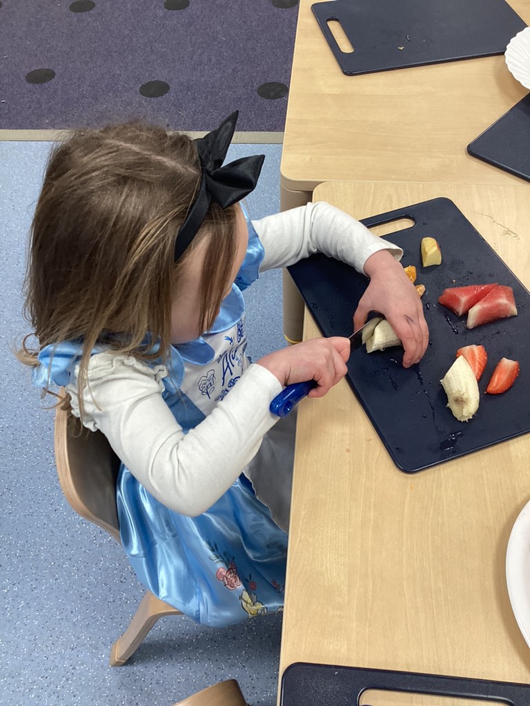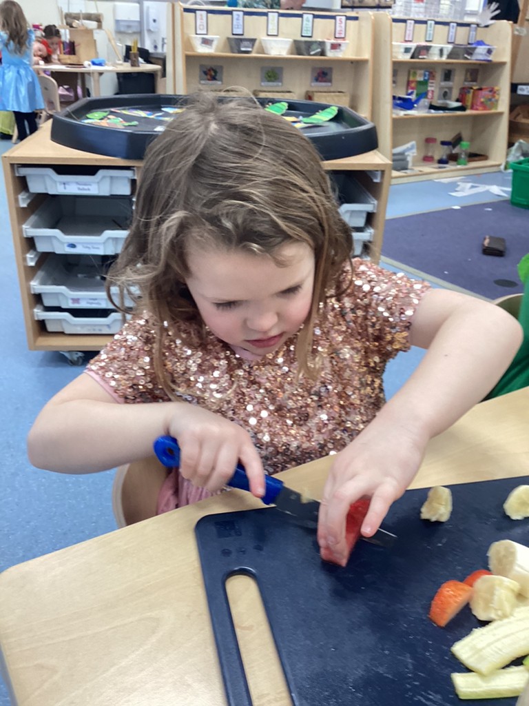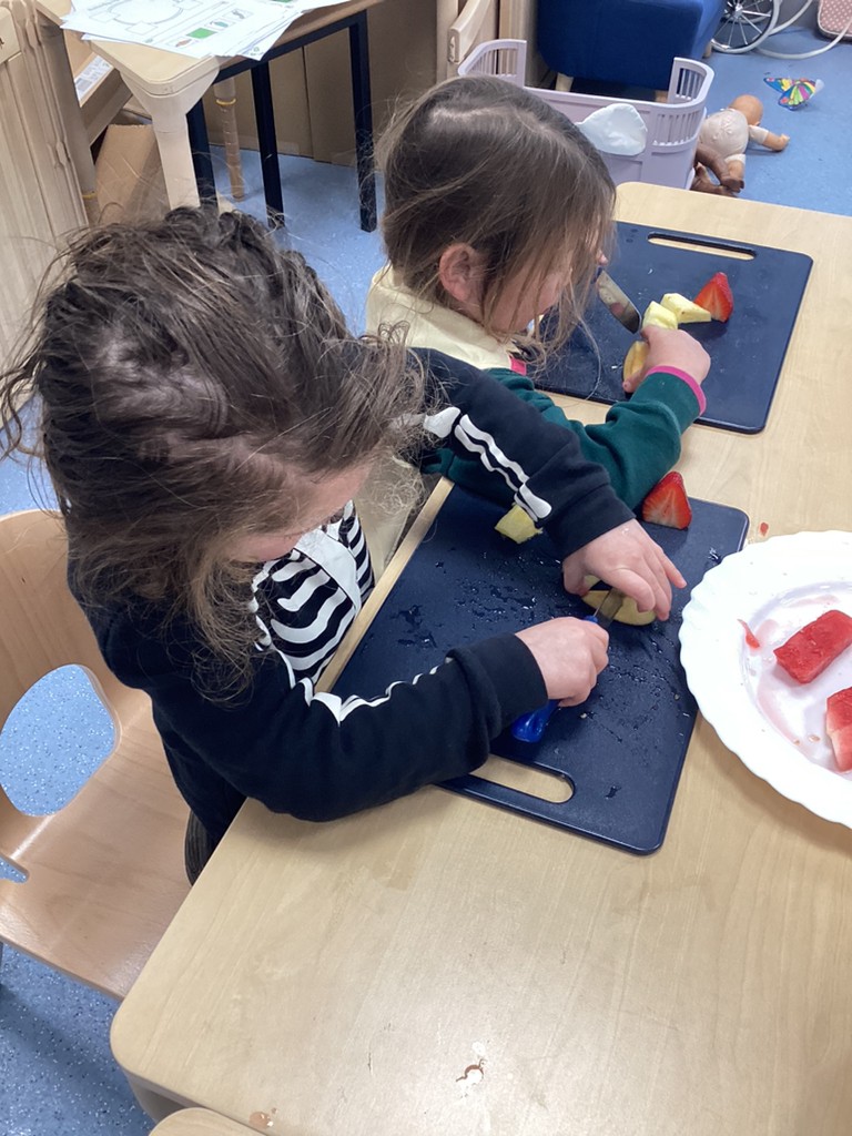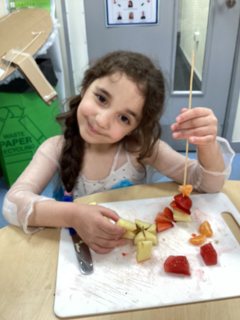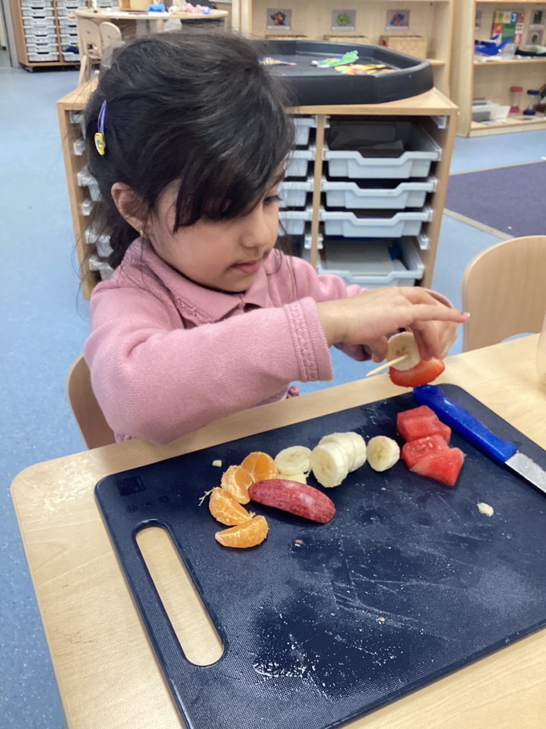 In the afternoon we learnt how to use a knife safely to chop fruit and used this skill to make (and then eat) our own fruit kebabs!