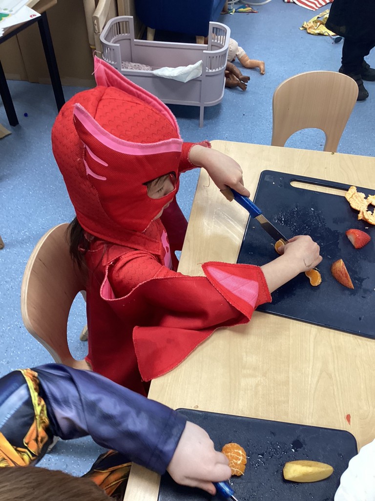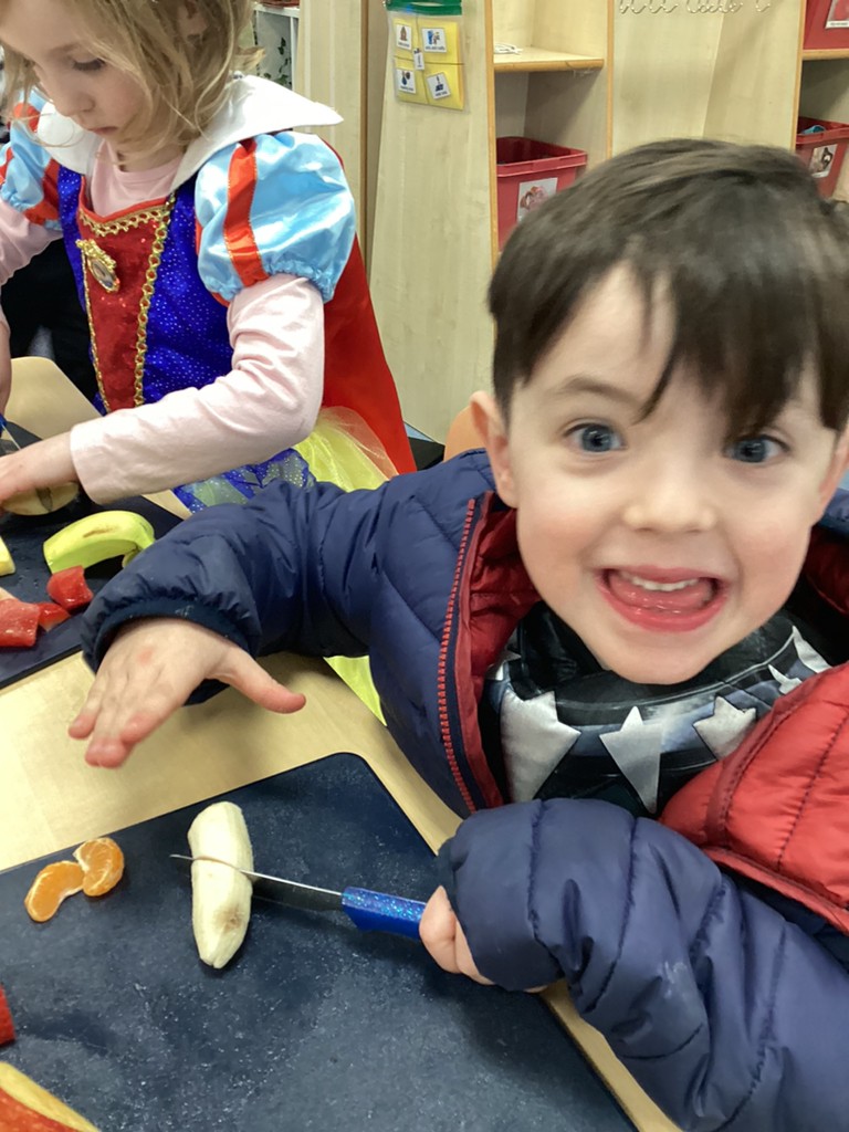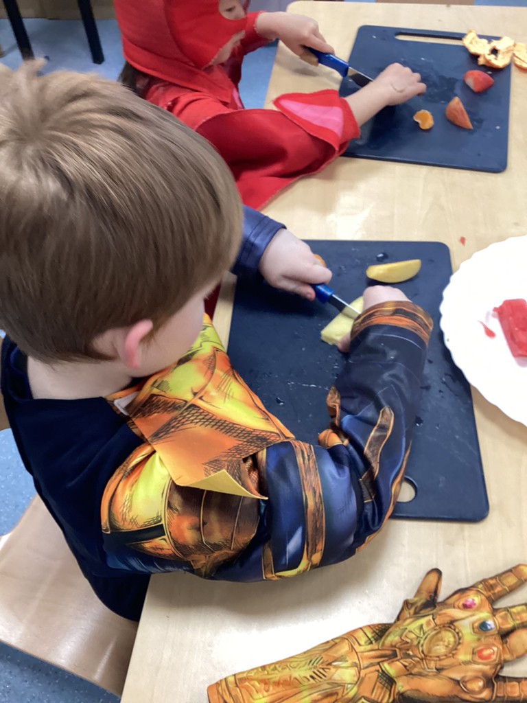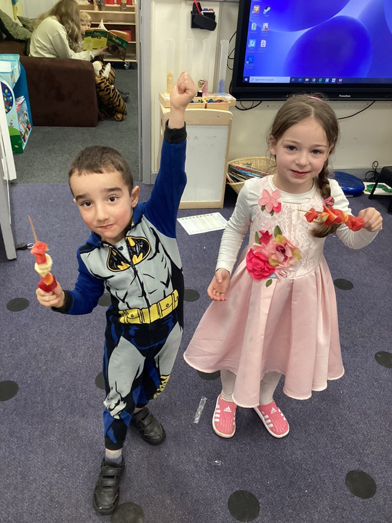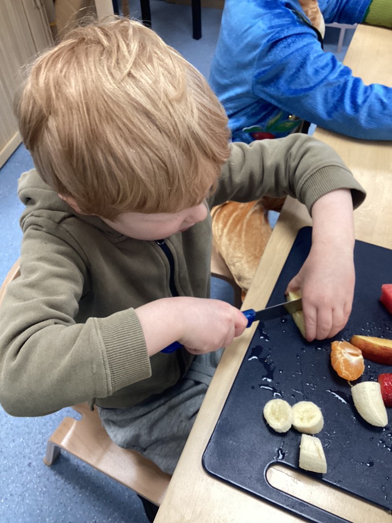 In the afternoon we learnt how to use a knife safely to chop fruit and used this skill to make (and then eat) our own fruit kebabs!