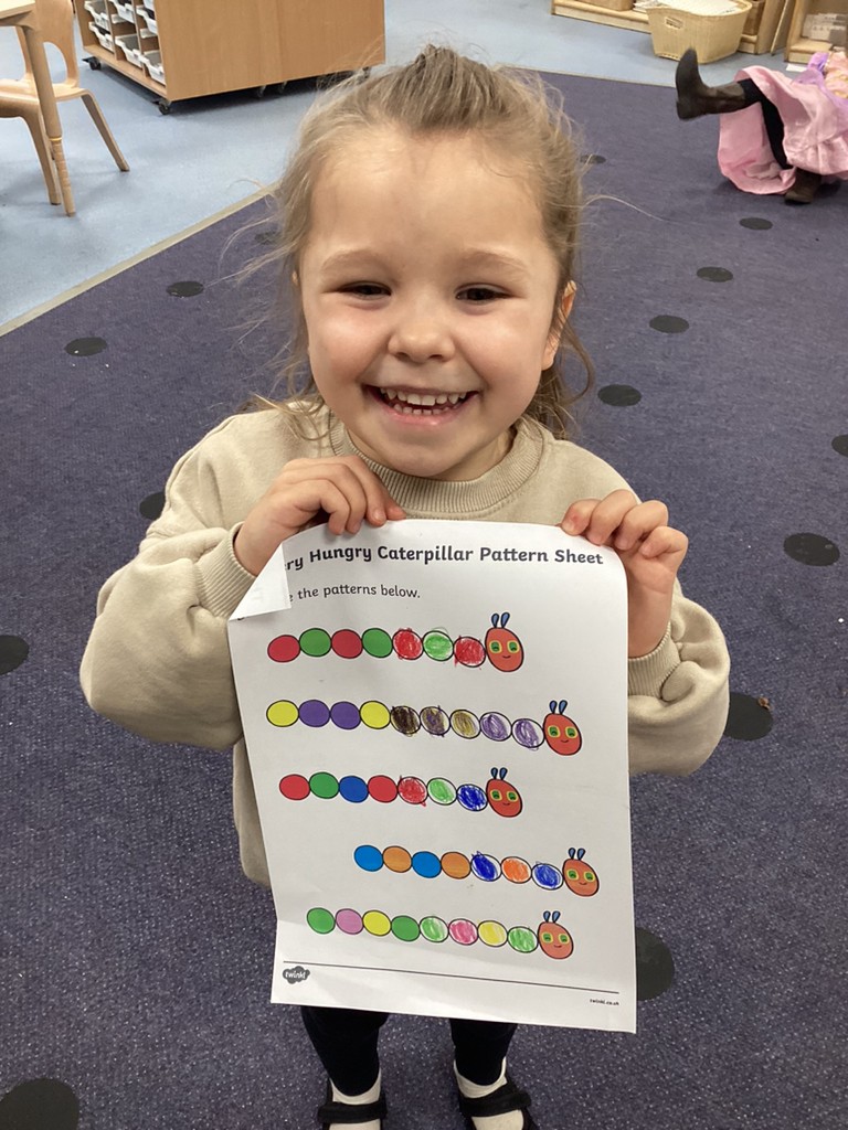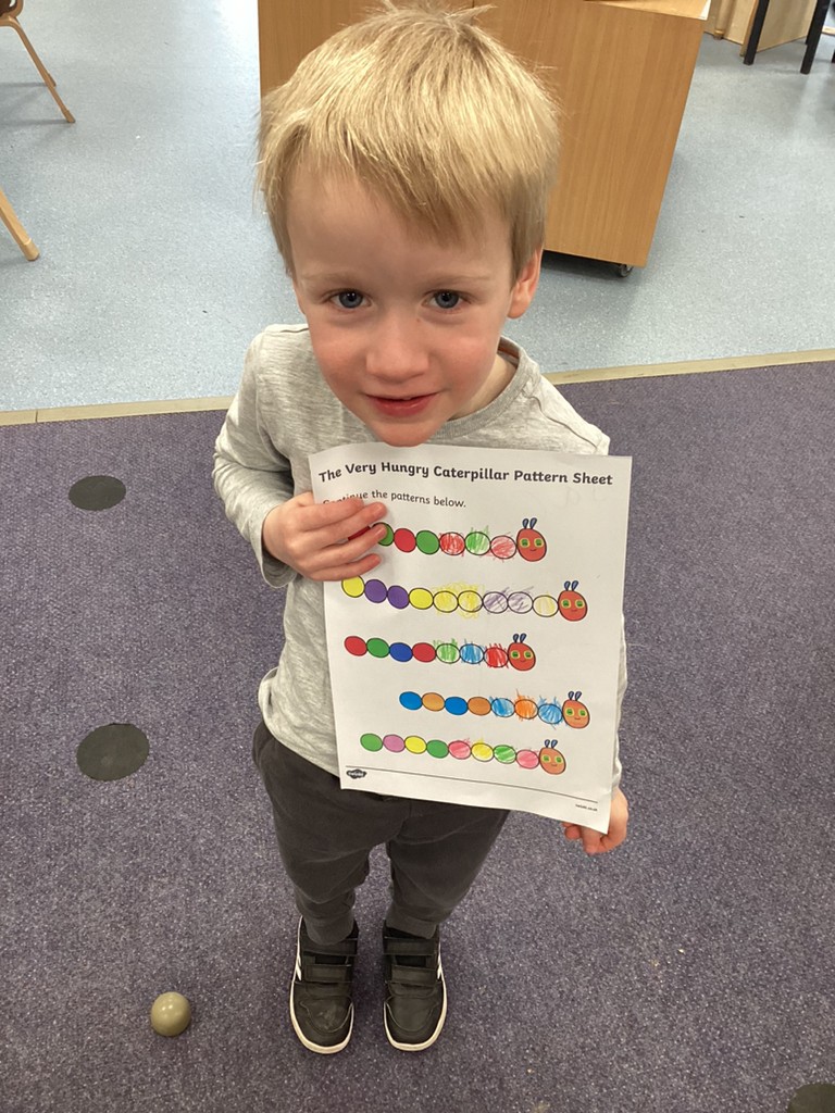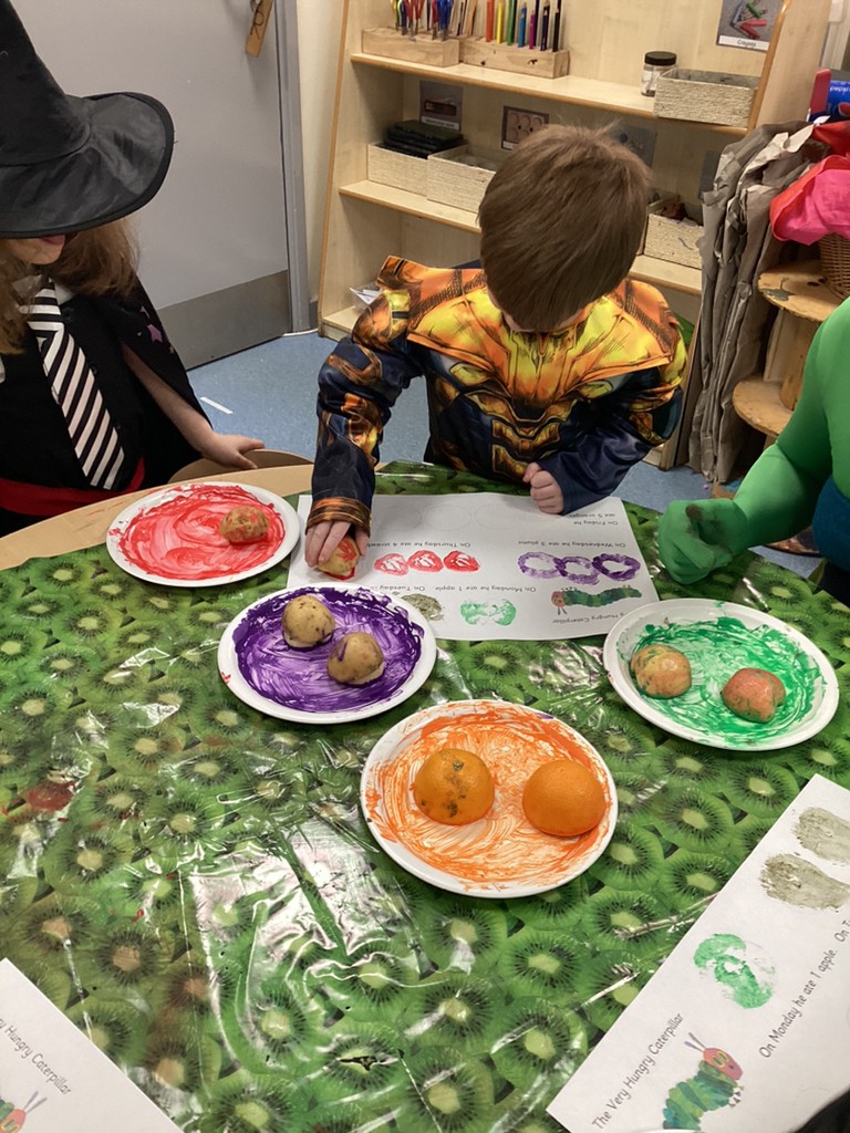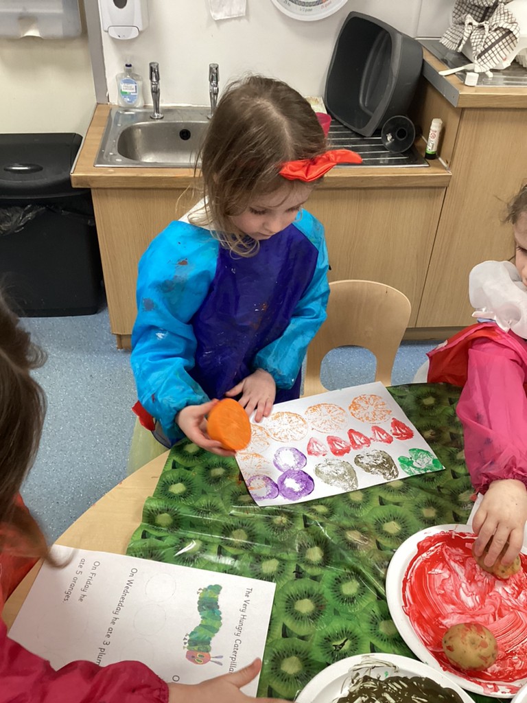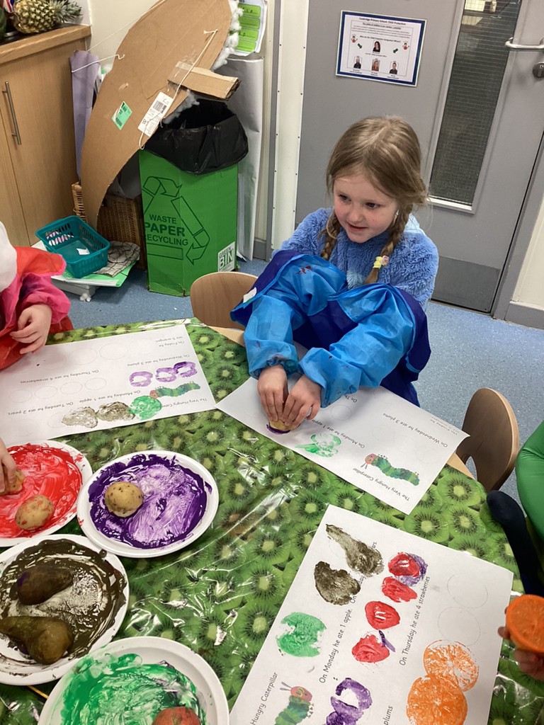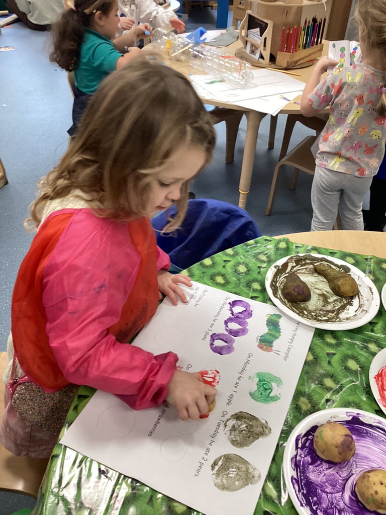 During the day we showed what the caterpillar had eaten by printing using fruit and carved potatoes, and coloured in caterpillar pictures using repeating patterns. We also learnt about the lifecycle of a caterpillar and ordered pictures to show the different steps to becoming a butterfly!