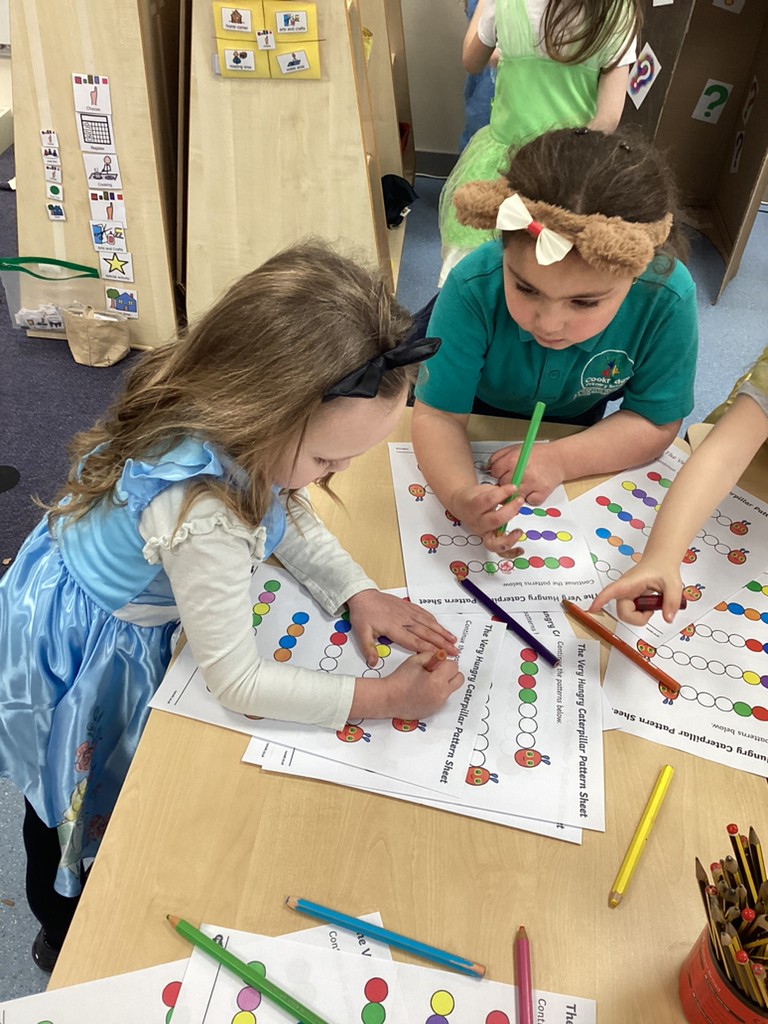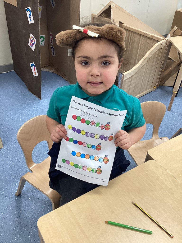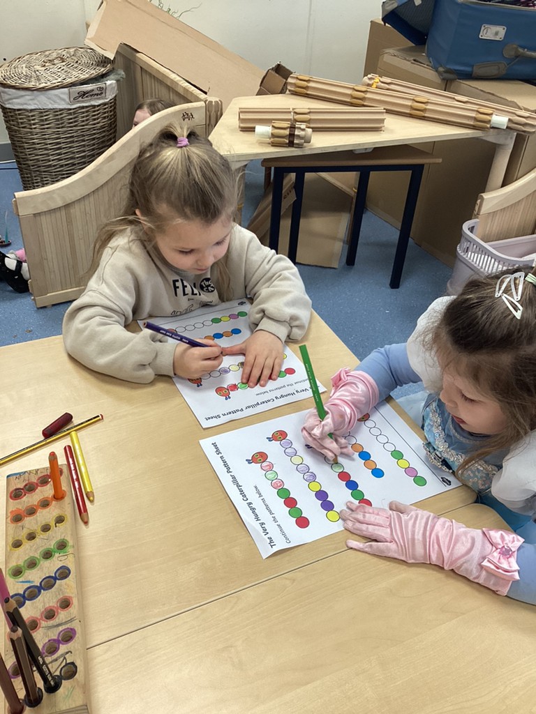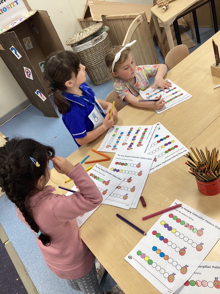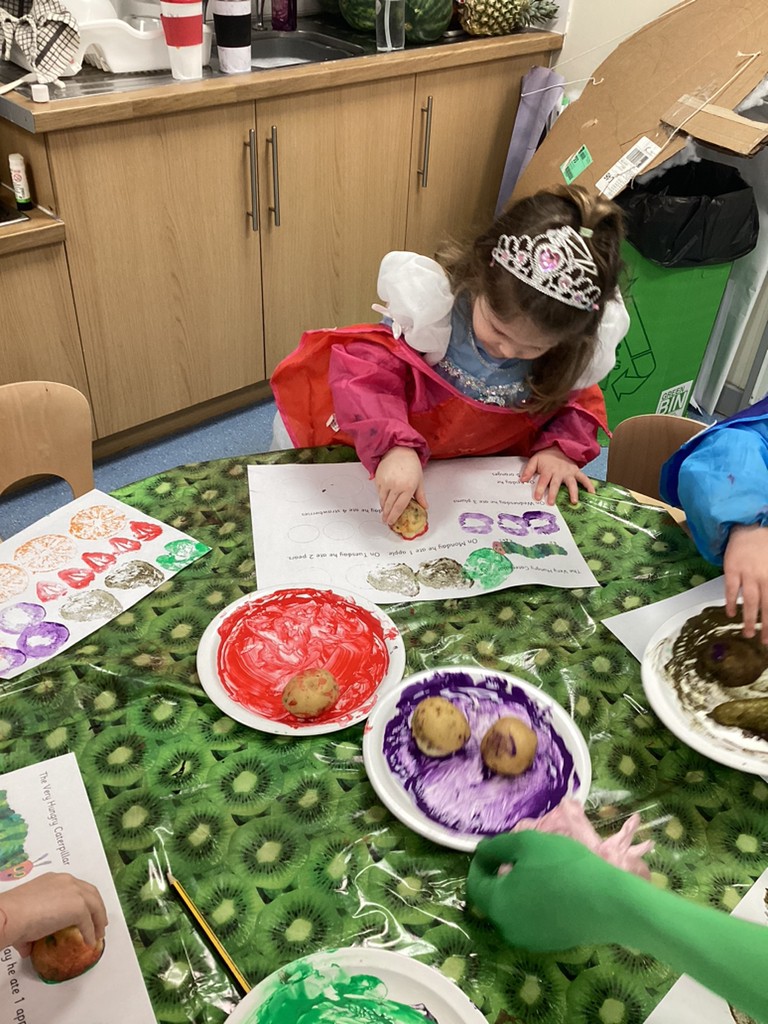 During the day we showed what the caterpillar had eaten by printing using fruit and carved potatoes, and coloured in caterpillar pictures using repeating patterns. We also learnt about the lifecycle of a caterpillar and ordered pictures to show the different steps to becoming a butterfly!