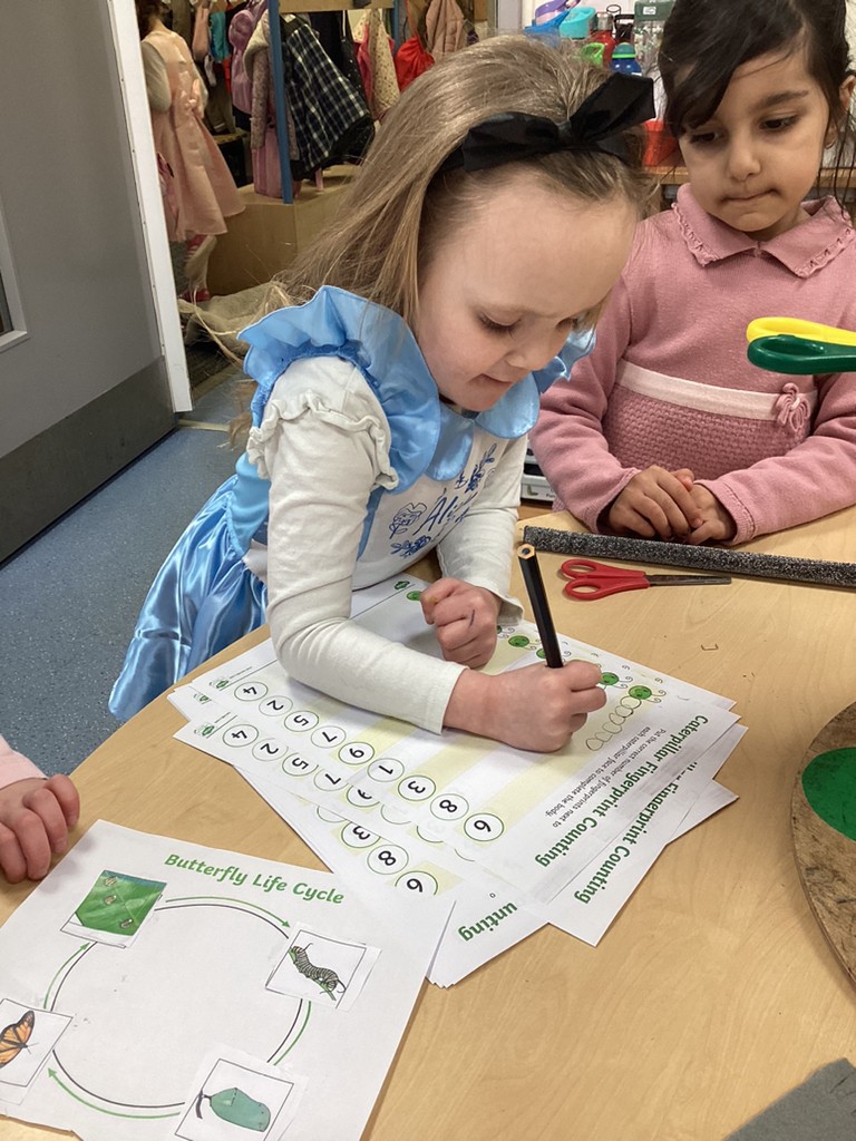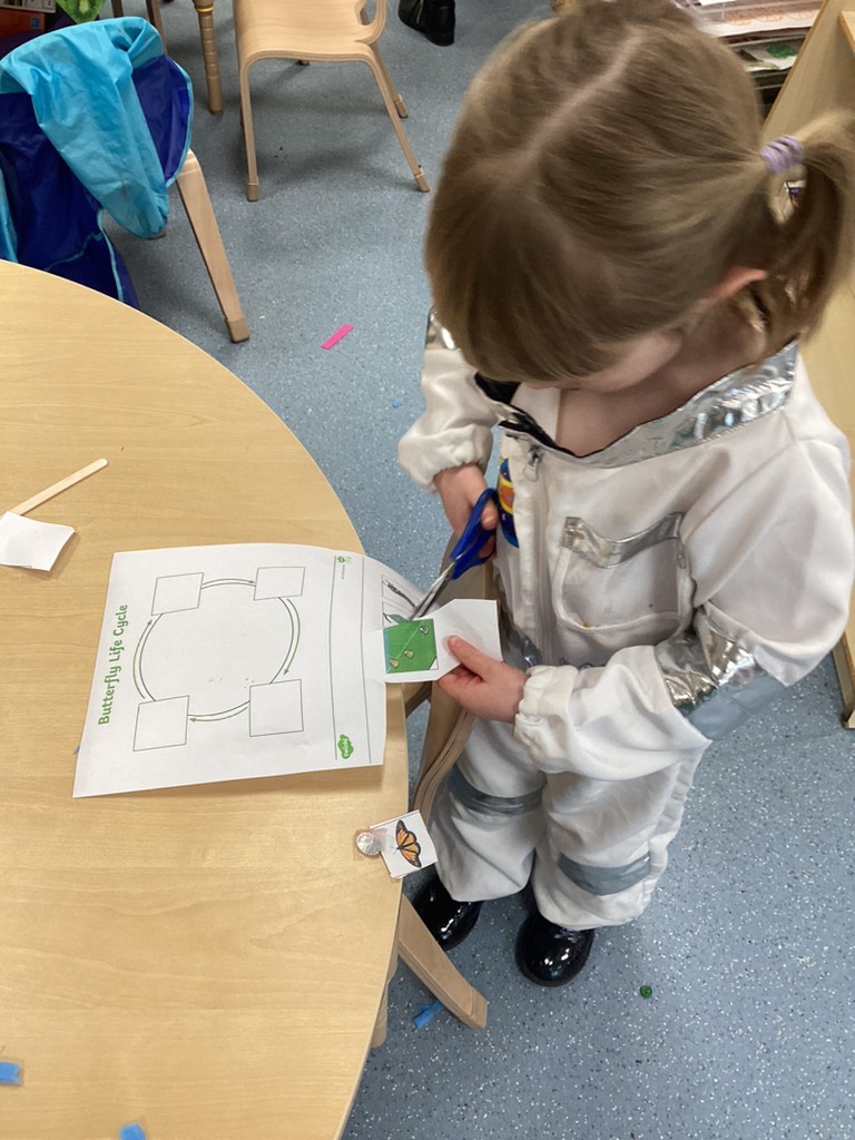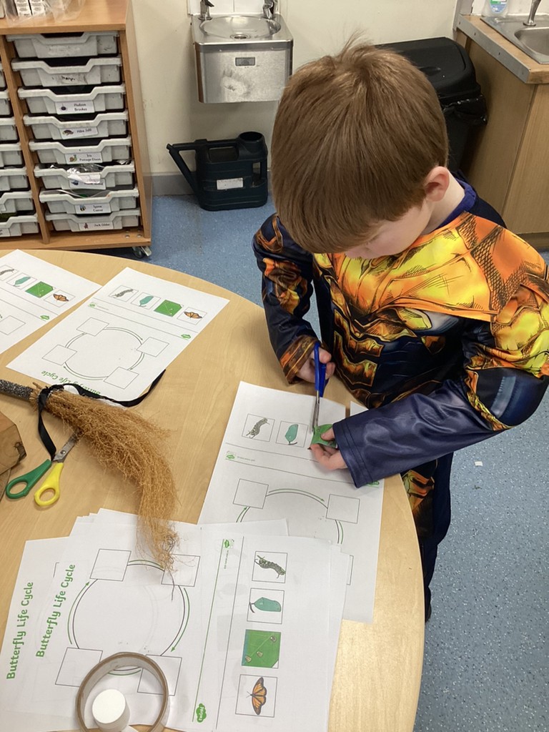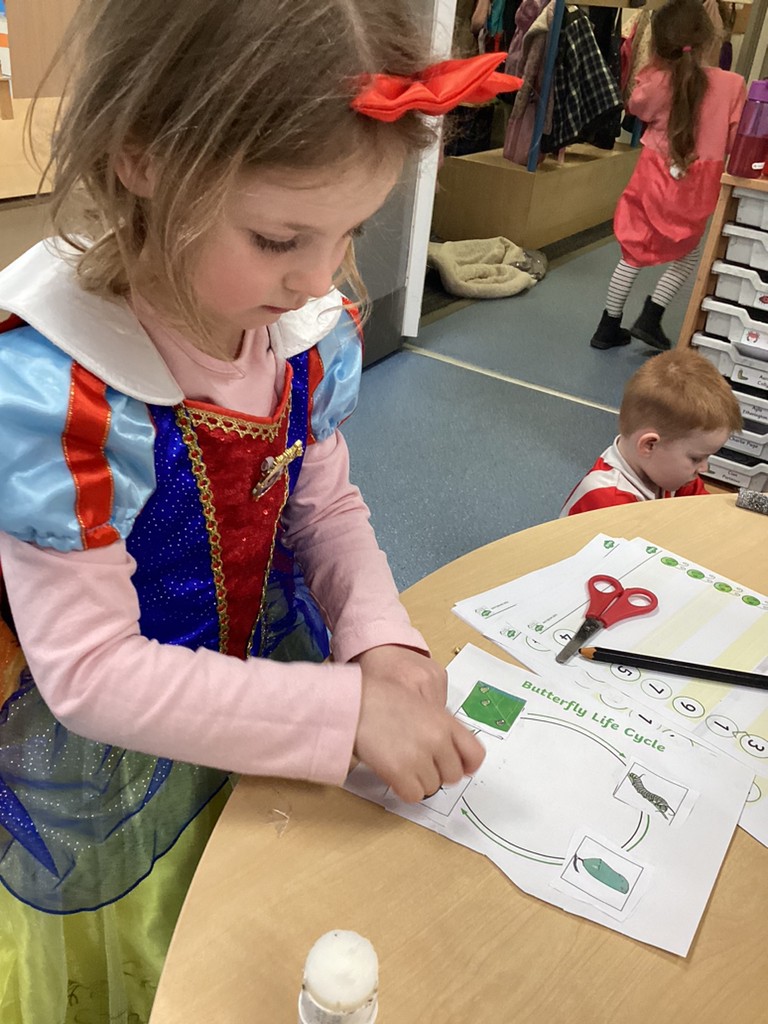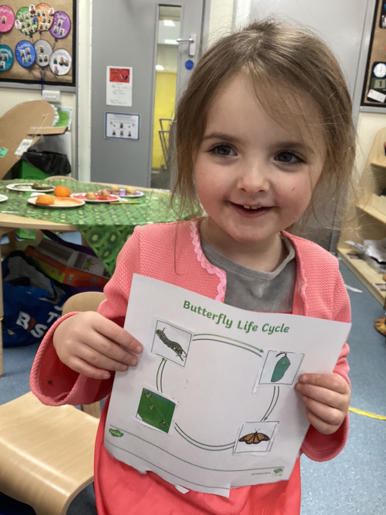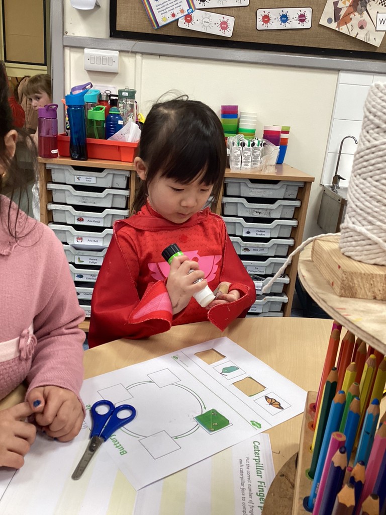 During the day we showed what the caterpillar had eaten by printing using fruit and carved potatoes, and coloured in caterpillar pictures using repeating patterns. We also learnt about the lifecycle of a caterpillar and ordered pictures to show the different steps to becoming a butterfly!
