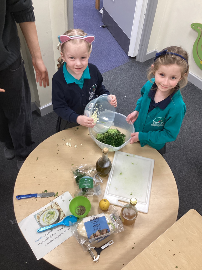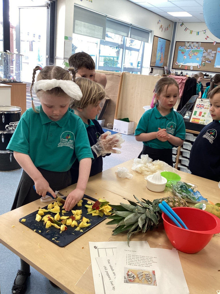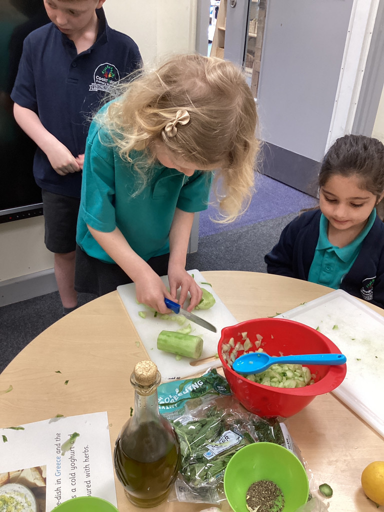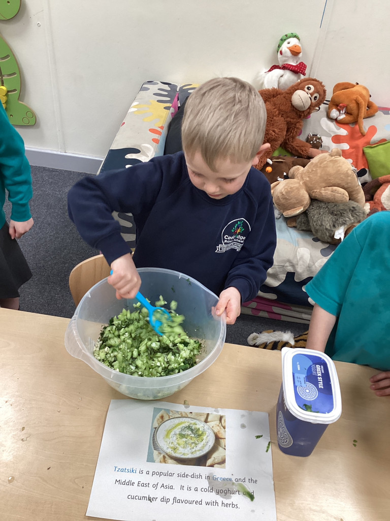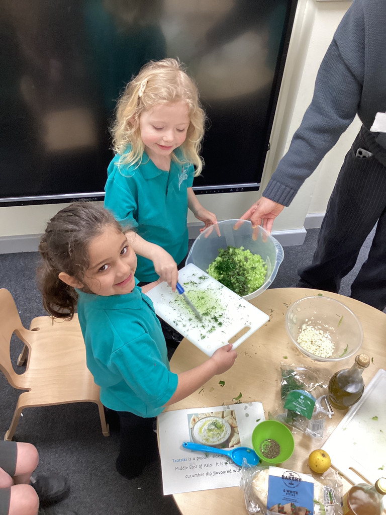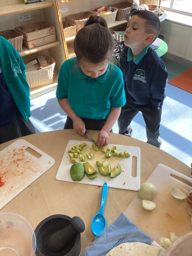We started the morning discussing our favourite foods and where in the world they are grown. We then took inspiration from the Tiny Chef and his culinary skills before discussing the importance of hygiene (we washed our hands a LOT!) and of safe handling of our equipment. Then the children split into four kitchens. The purple team went to Asia and prepared a Thai Fruit Salad, using some delicious tropical fruits and finishing it with salt and chopped basil. The green team went to Africa and made Egyptian falafel and hummus from chickpeas and lots of exotic spices. The blue team travelled to Mexico and helped prepare some quesadillas with a filling of cheese and peppers, plus a side of guacamole. Finally the purple team helped to make the Greek dip tzatziki. The children all worked well together and followed instructions brilliantly while practising peeling, chopping, mixing and shaping different elements until all was prepared.