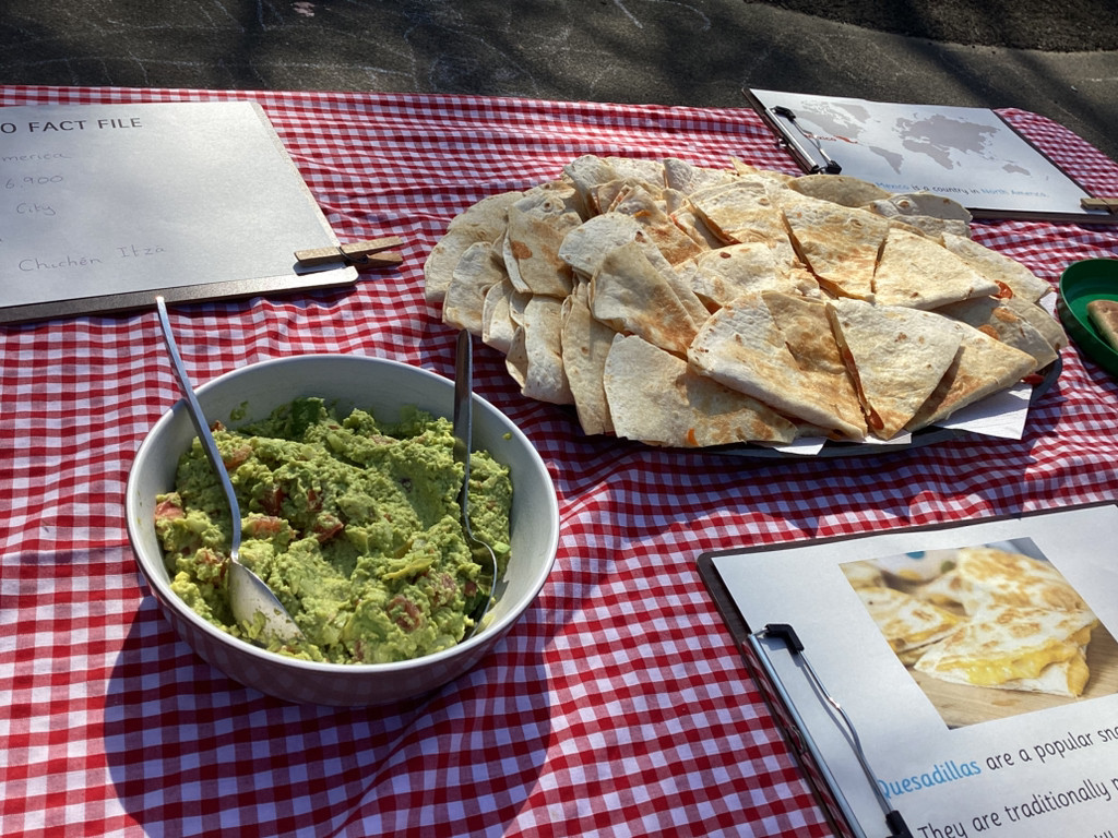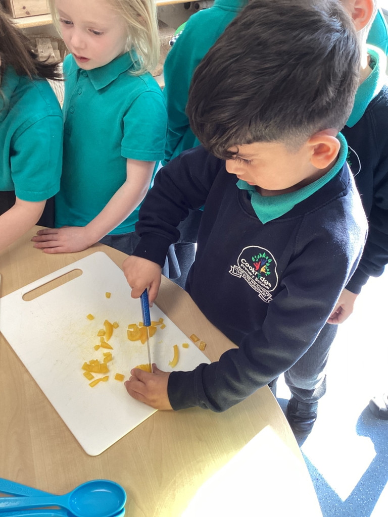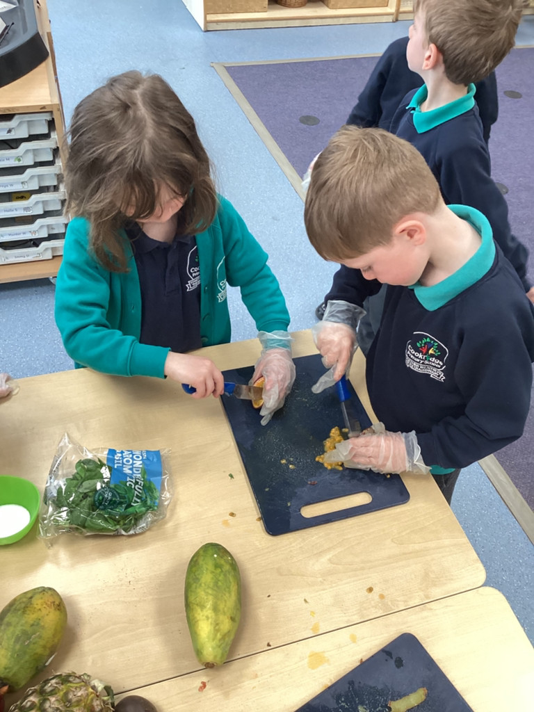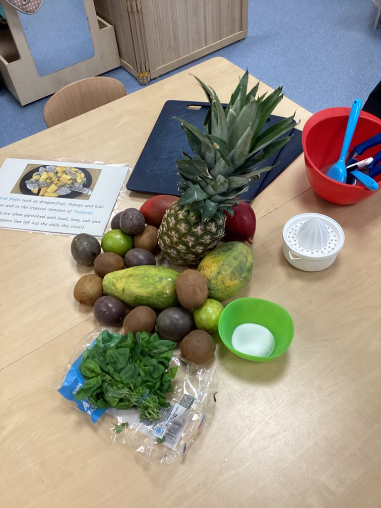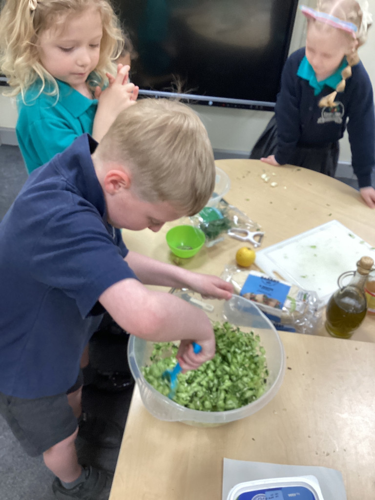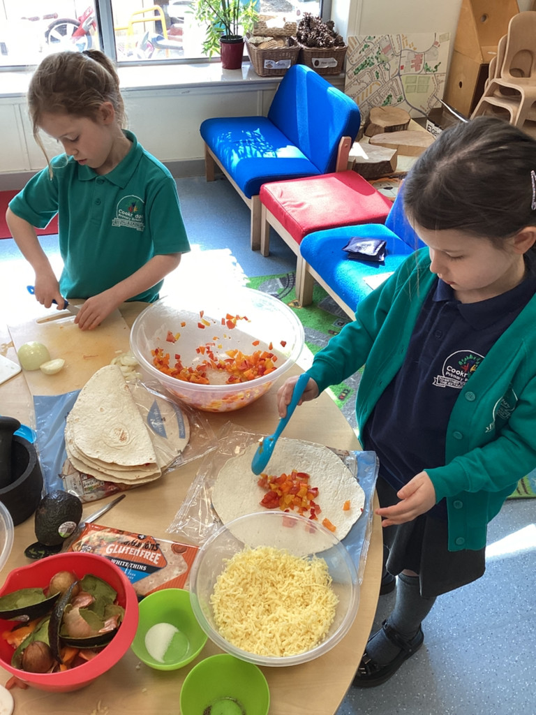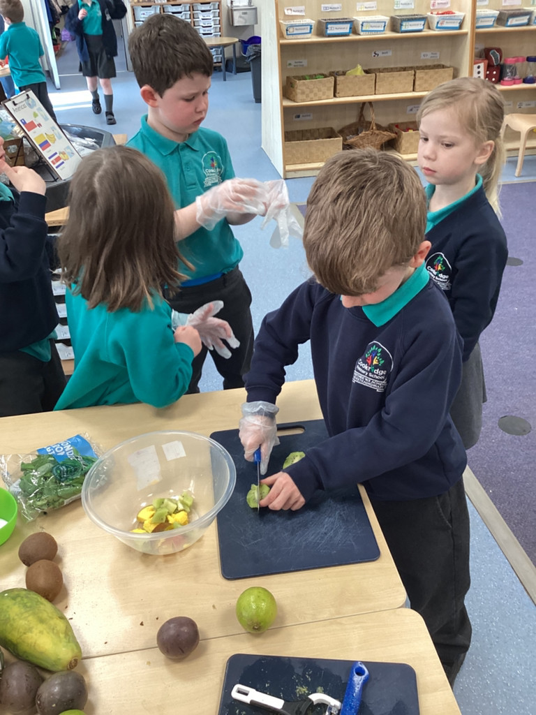 We started the morning discussing our favourite foods and where in the world they are grown. We then took inspiration from the Tiny Chef and his culinary skills before discussing the importance of hygiene (we washed our hands a LOT!) and of safe handling of our equipment. Then the children split into four kitchens. The purple team went to Asia and prepared a Thai Fruit Salad, using some delicious tropical fruits and finishing it with salt and chopped basil. The green team went to Africa and made Egyptian falafel and hummus from chickpeas and lots of exotic spices. The blue team travelled to Mexico and helped prepare some quesadillas with a filling of cheese and peppers, plus a side of guacamole. Finally the purple team helped to make the Greek dip tzatziki. The children all worked well together and followed instructions brilliantly while practising peeling, chopping, mixing and shaping different elements until all was prepared.