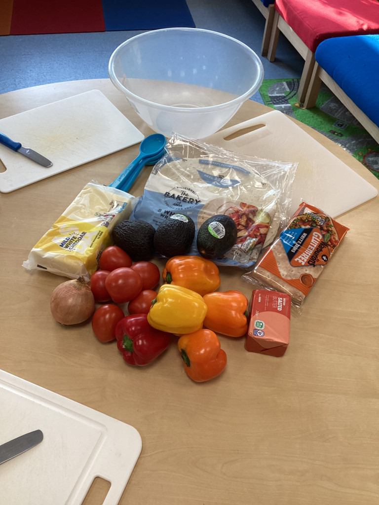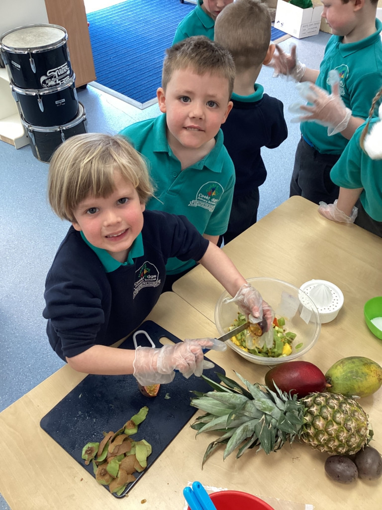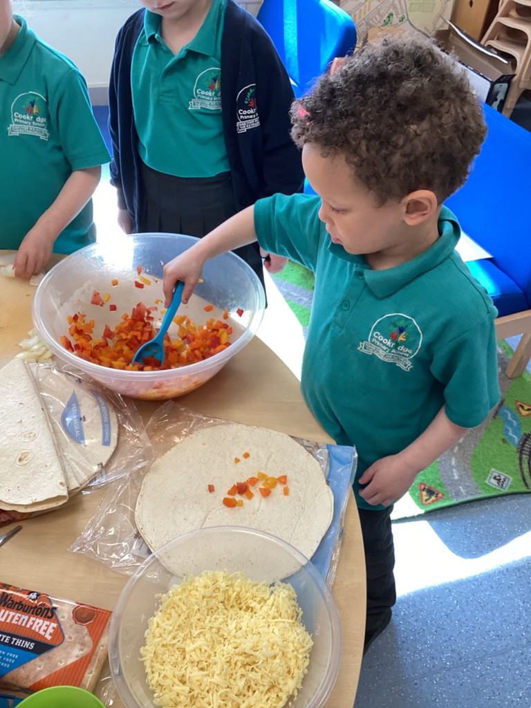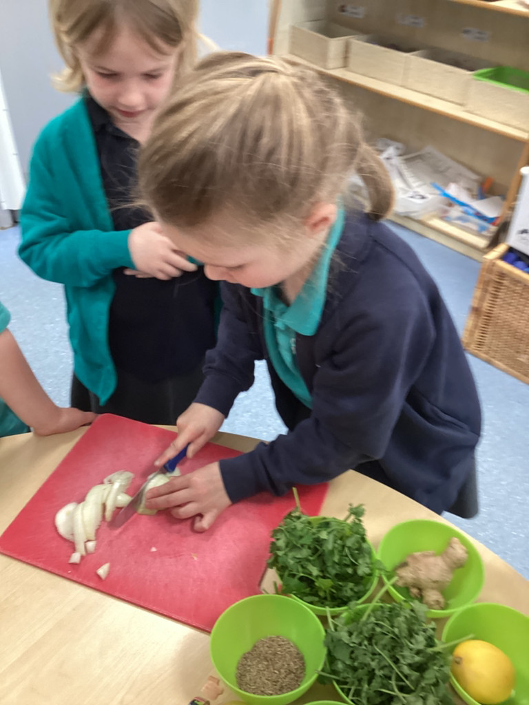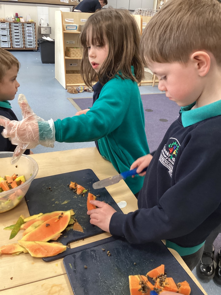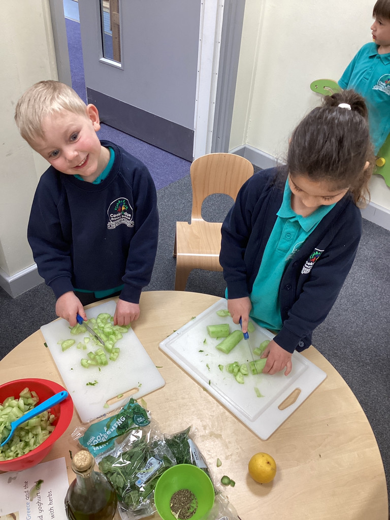 We started the morning discussing our favourite foods and where in the world they are grown. We then took inspiration from the Tiny Chef and his culinary skills before discussing the importance of hygiene (we washed our hands a LOT!) and of safe handling of our equipment. Then the children split into four kitchens. The purple team went to Asia and prepared a Thai Fruit Salad, using some delicious tropical fruits and finishing it with salt and chopped basil. The green team went to Africa and made Egyptian falafel and hummus from chickpeas and lots of exotic spices. The blue team travelled to Mexico and helped prepare some quesadillas with a filling of cheese and peppers, plus a side of guacamole. Finally the purple team helped to make the Greek dip tzatziki. The children all worked well together and followed instructions brilliantly while practising peeling, chopping, mixing and shaping different elements until all was prepared.