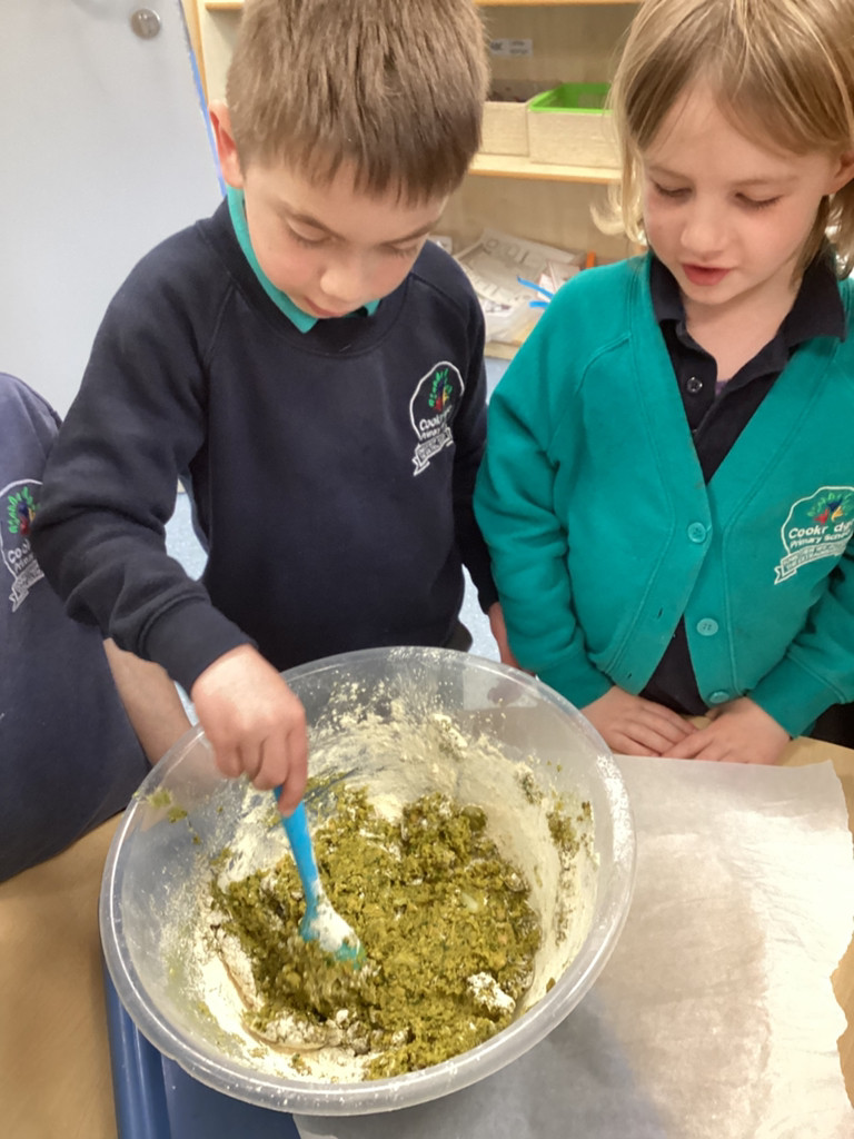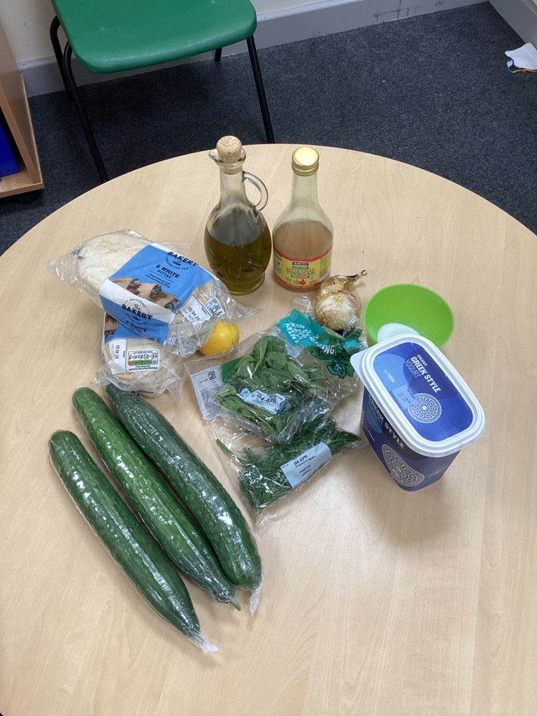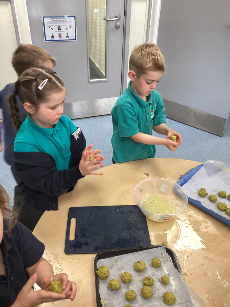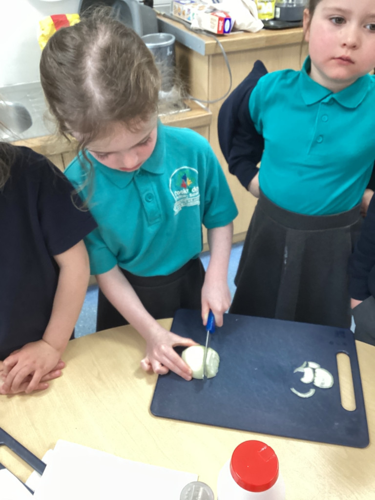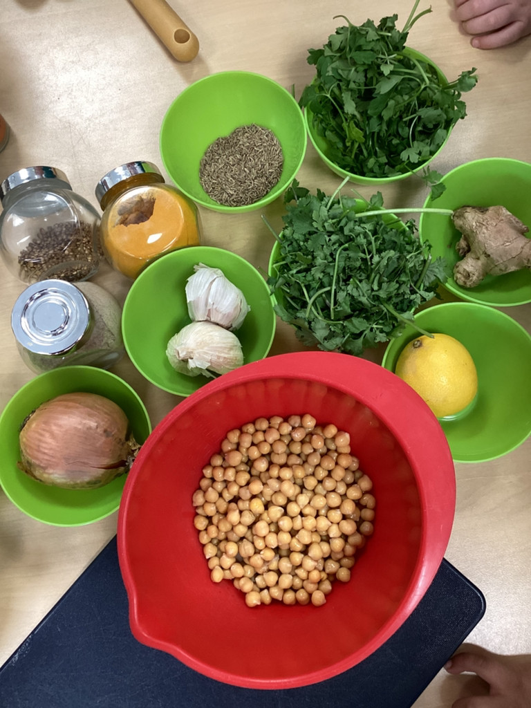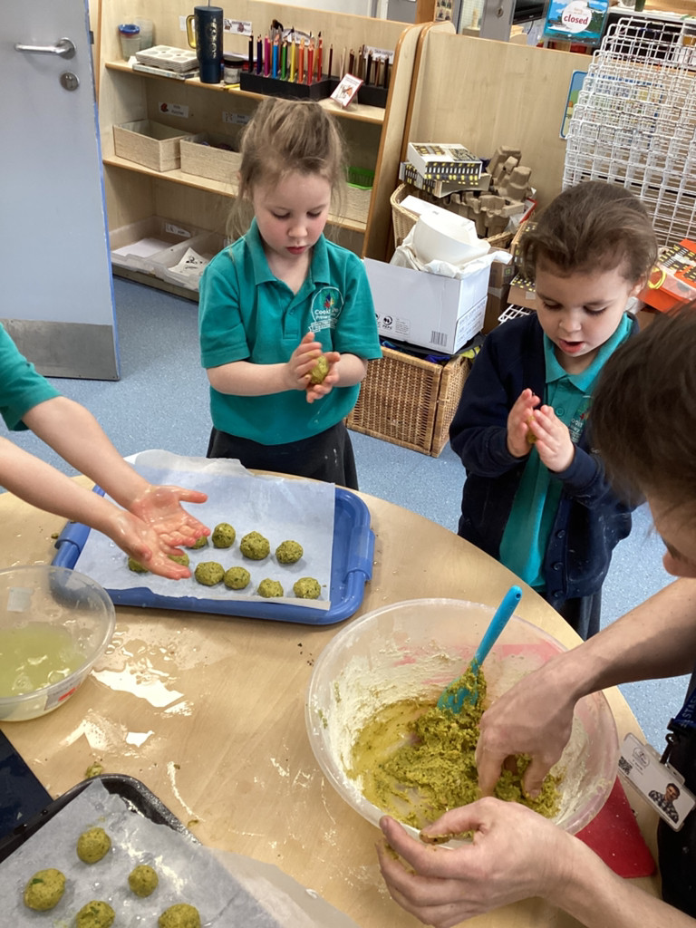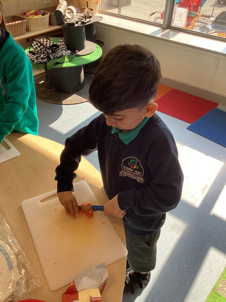 We started the morning discussing our favourite foods and where in the world they are grown. We then took inspiration from the Tiny Chef and his culinary skills before discussing the importance of hygiene (we washed our hands a LOT!) and of safe handling of our equipment. Then the children split into four kitchens. The purple team went to Asia and prepared a Thai Fruit Salad, using some delicious tropical fruits and finishing it with salt and chopped basil. The green team went to Africa and made Egyptian falafel and hummus from chickpeas and lots of exotic spices. The blue team travelled to Mexico and helped prepare some quesadillas with a filling of cheese and peppers, plus a side of guacamole. Finally the purple team helped to make the Greek dip tzatziki. The children all worked well together and followed instructions brilliantly while practising peeling, chopping, mixing and shaping different elements until all was prepared.