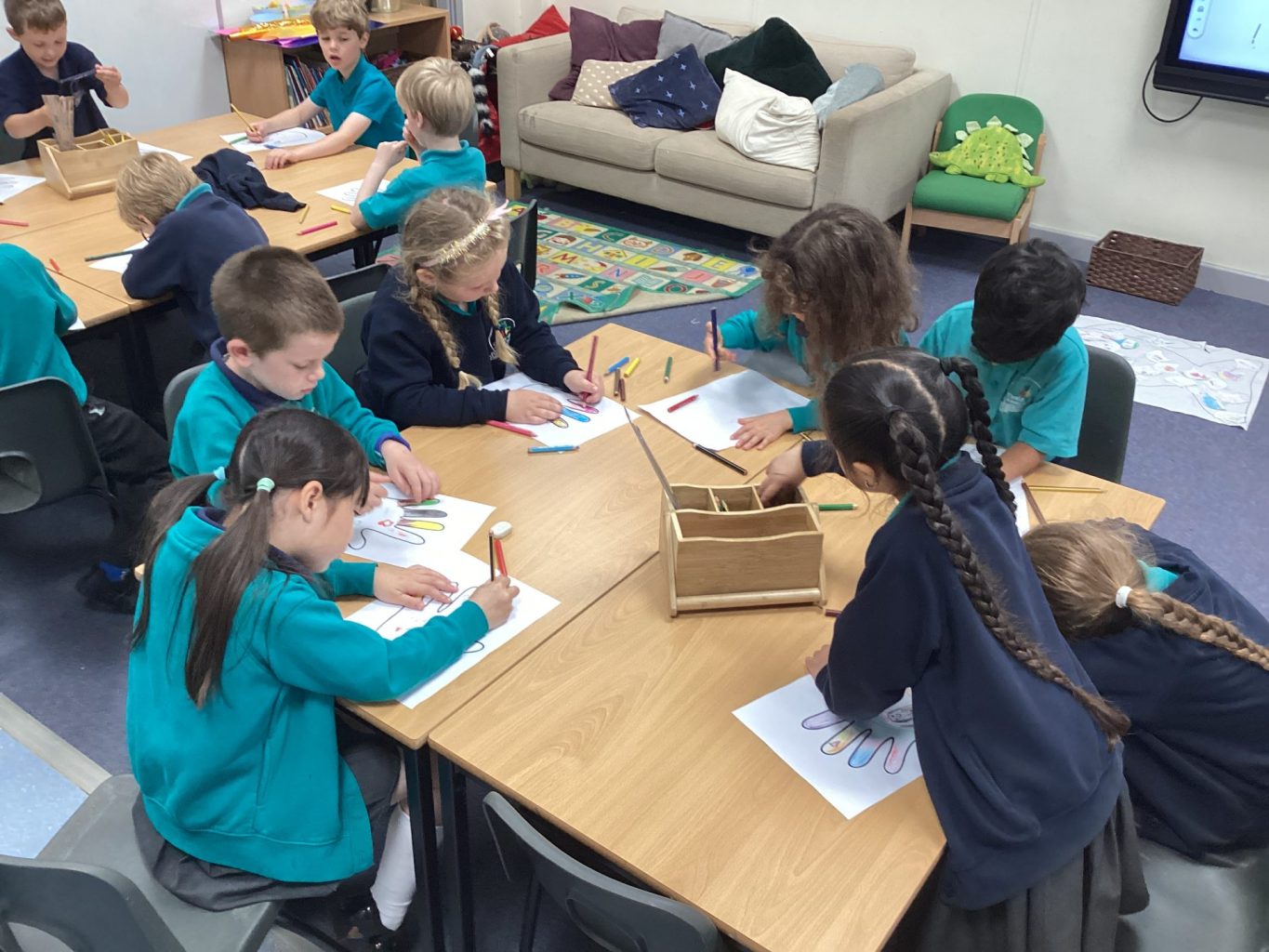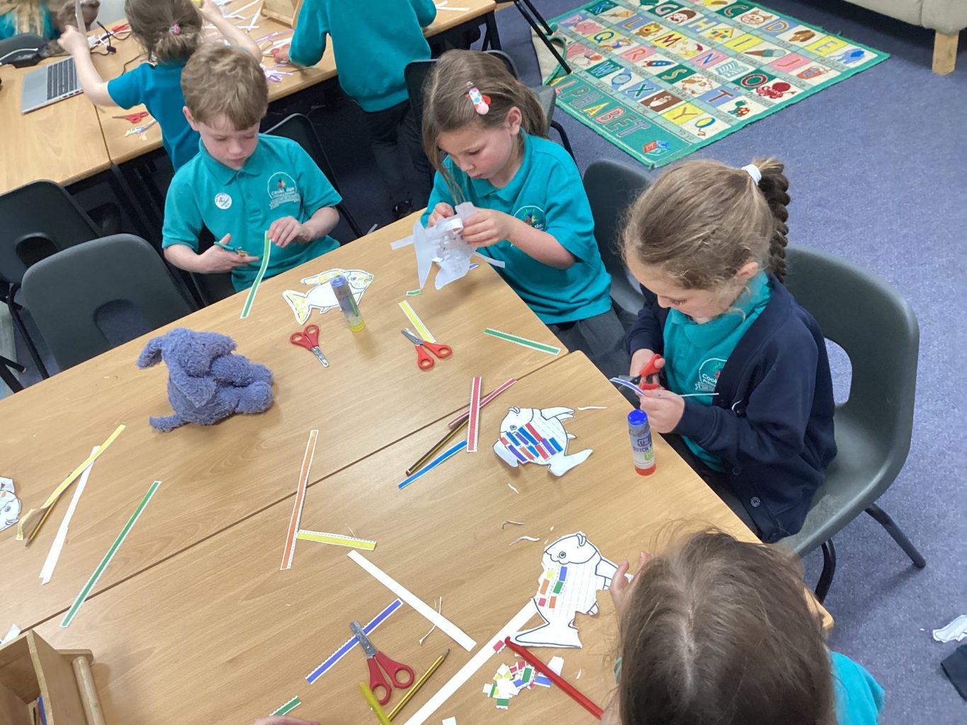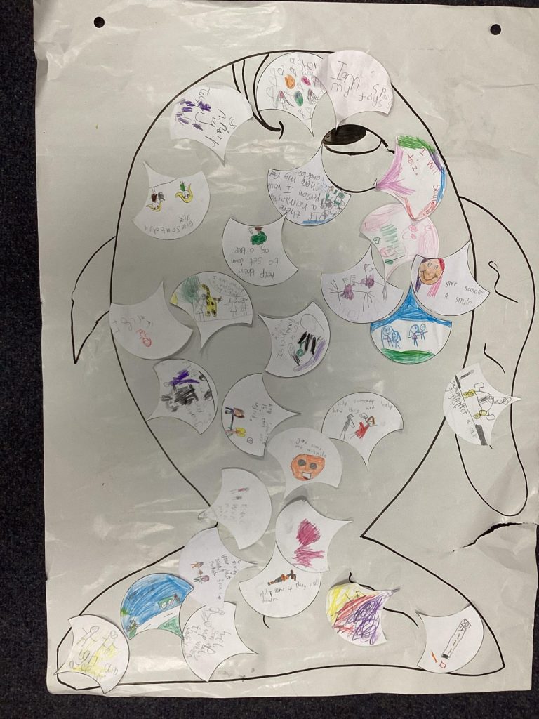 We played lots of team games and completed some team challenges. Miss Devine read us lots of stories but we especially looked at ‘The Rainbow Fish’. We crafted our own special fish, re-told the story and listened to an under the sea ‘Now > Press > Play’.