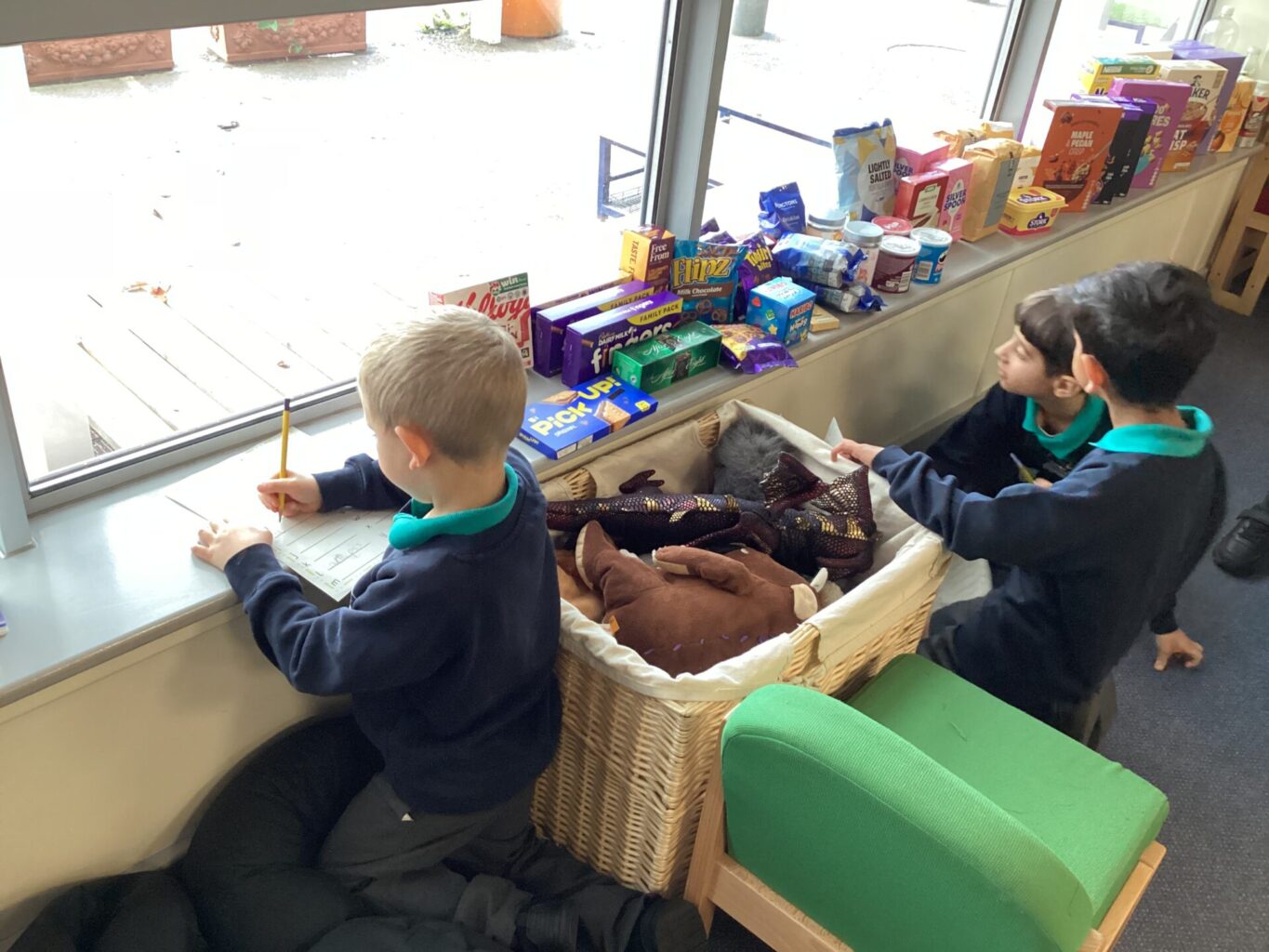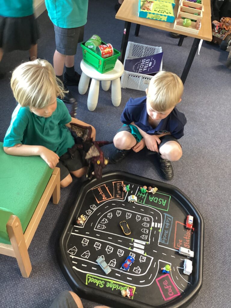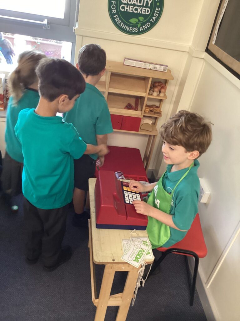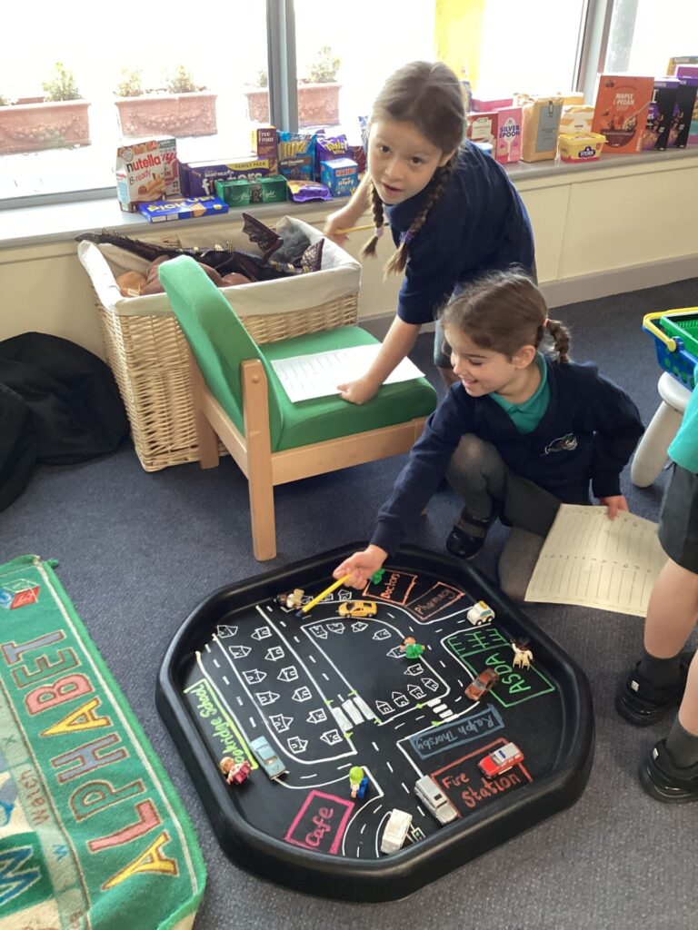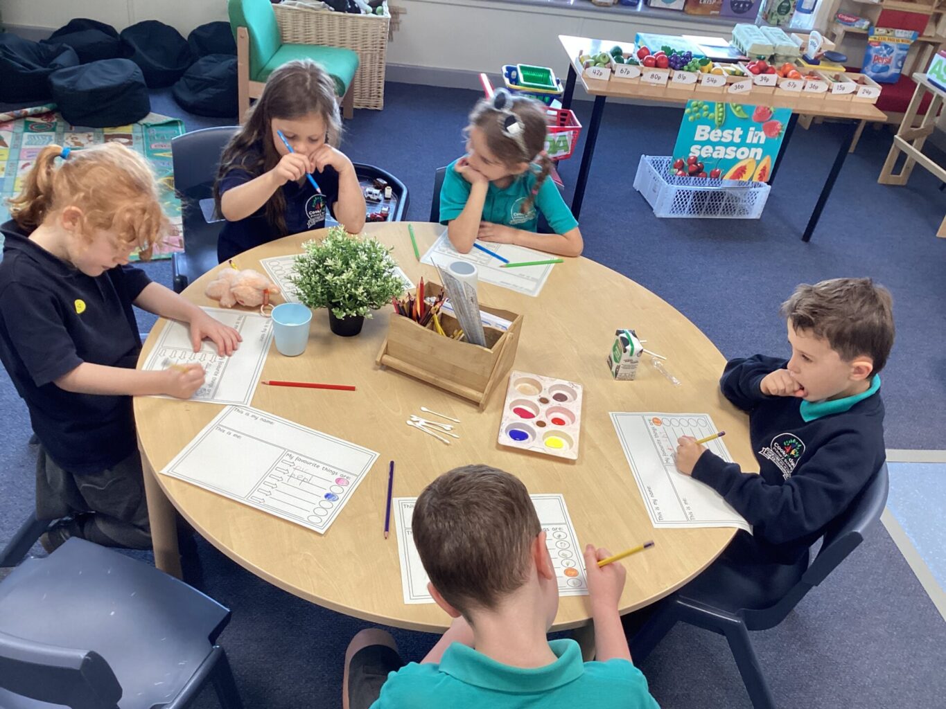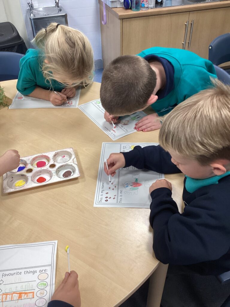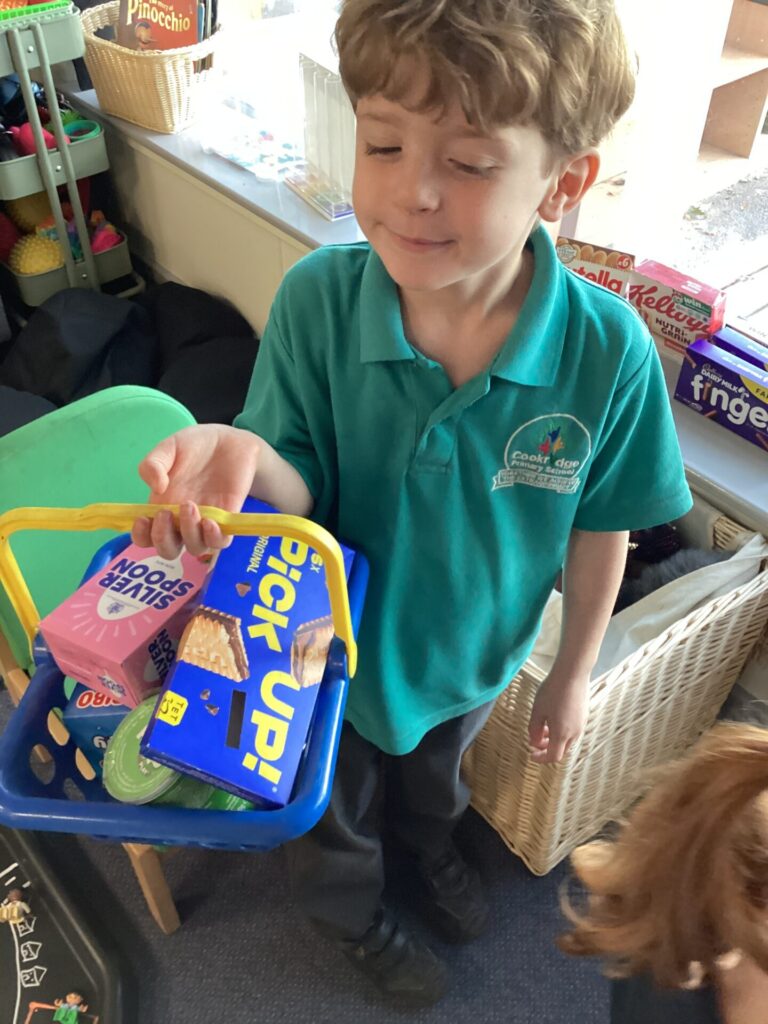 We started the day with a check-in and and a scavenger hunt of our classroom to find out where everything belongs before having a chance to have a play with all the toys in our classroom. Next, we had did an ‘all about me’ page where we wrote about all of our favourite things, drew a self portrait and even tried to write our name with spots and dots. After that, we had some choosing time in the classroom. Some of us painted, a few played with the cars and others built a zoo, but the new ASDA roleplay area was a definite favourite! Finally, we joined the rest of Key Stage one at forest schools to share some stories and found and collected lots of natural crafting materials to bring back to the classroom so we can use them to help with our arts and crafts for the rest of the week.
