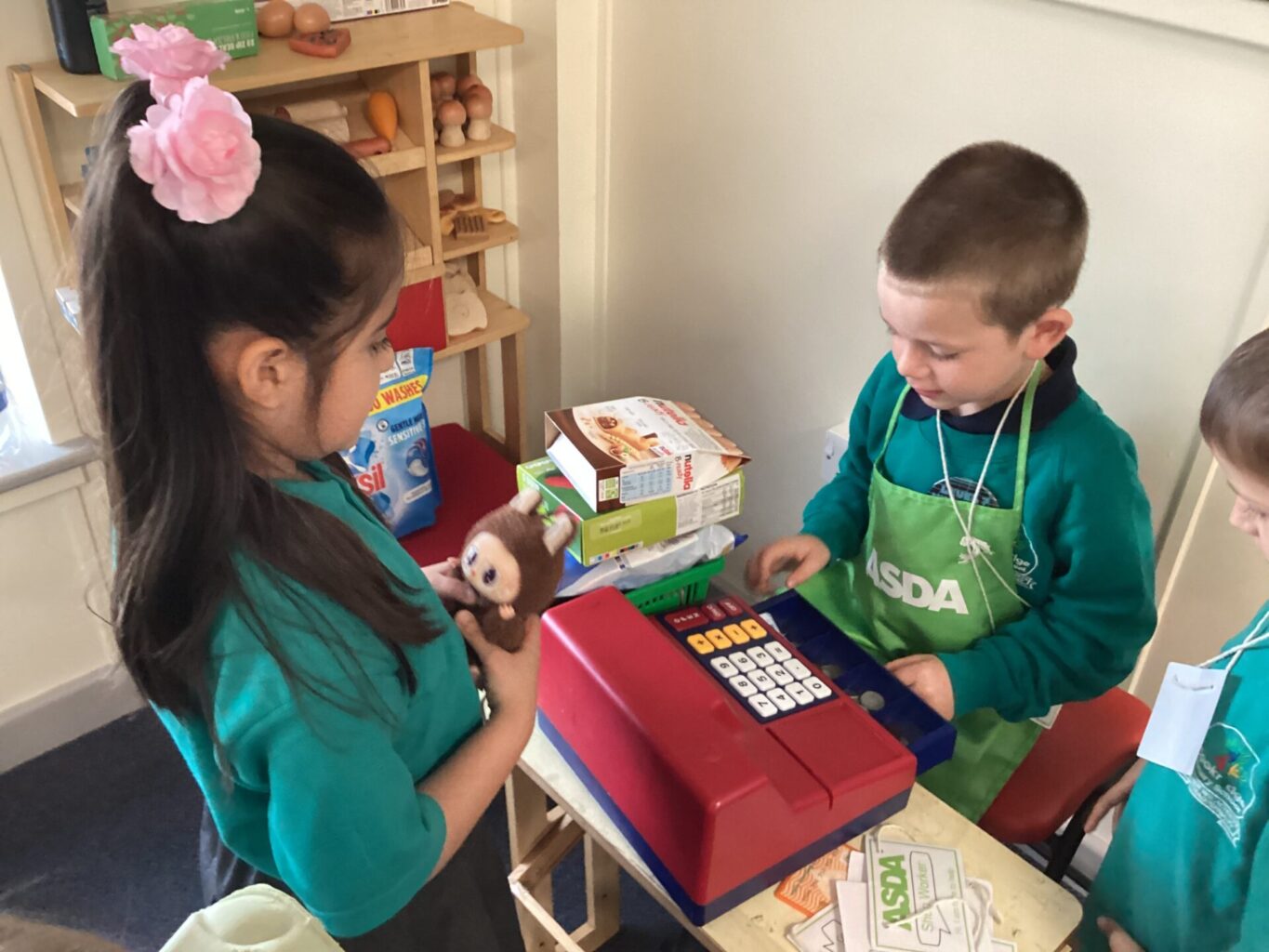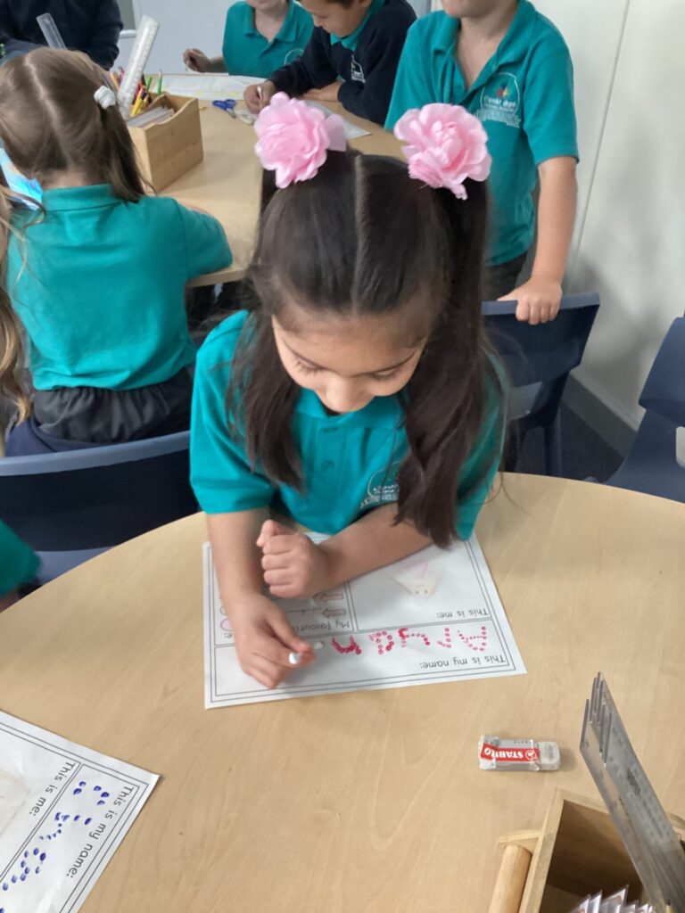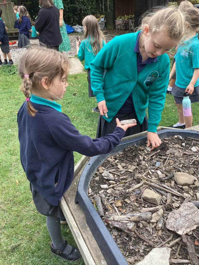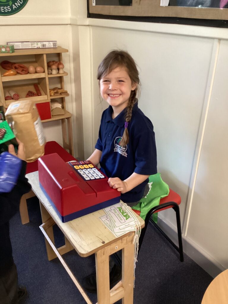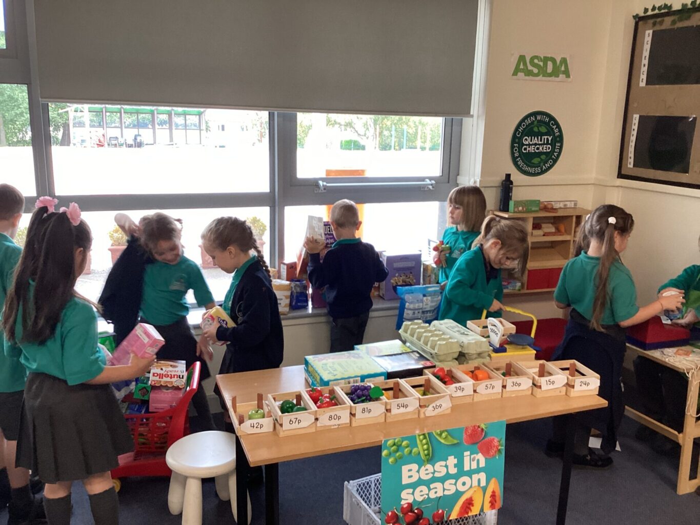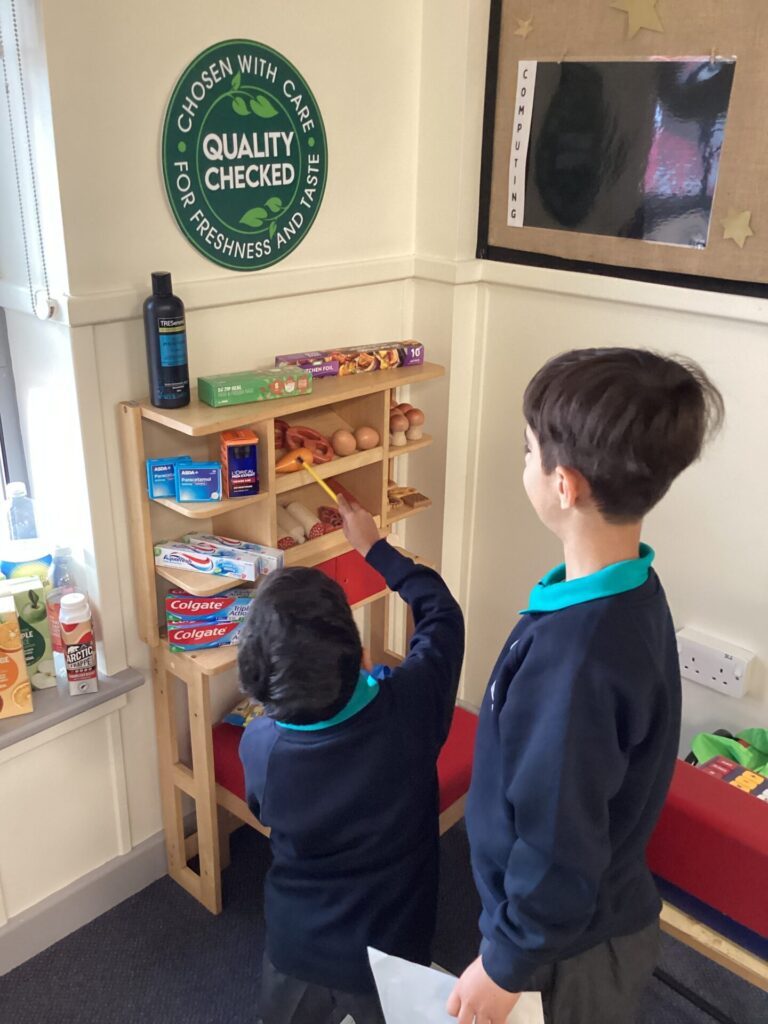 We started the day with a check-in and and a scavenger hunt of our classroom to find out where everything belongs before having a chance to have a play with all the toys in our classroom. Next, we had did an ‘all about me’ page where we wrote about all of our favourite things, drew a self portrait and even tried to write our name with spots and dots. After that, we had some choosing time in the classroom. Some of us painted, a few played with the cars and others built a zoo, but the new ASDA roleplay area was a definite favourite! Finally, we joined the rest of Key Stage one at forest schools to share some stories and found and collected lots of natural crafting materials to bring back to the classroom so we can use them to help with our arts and crafts for the rest of the week.