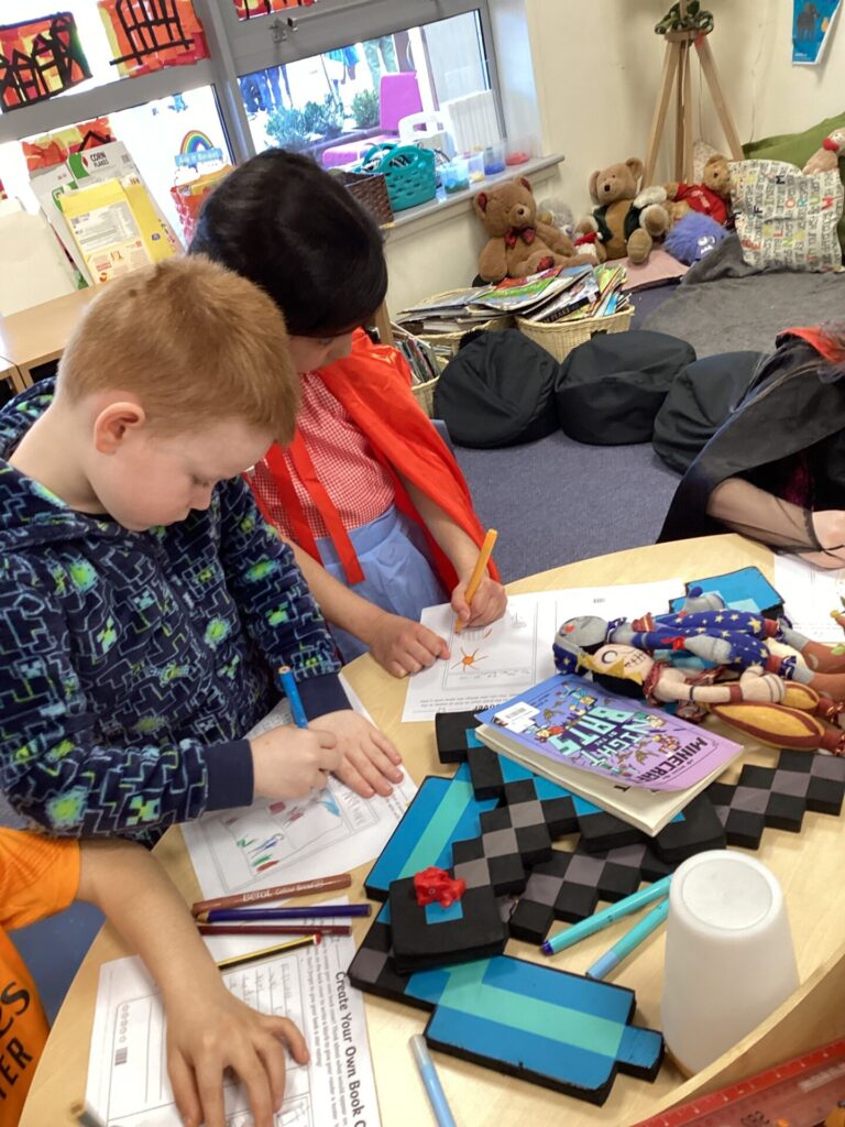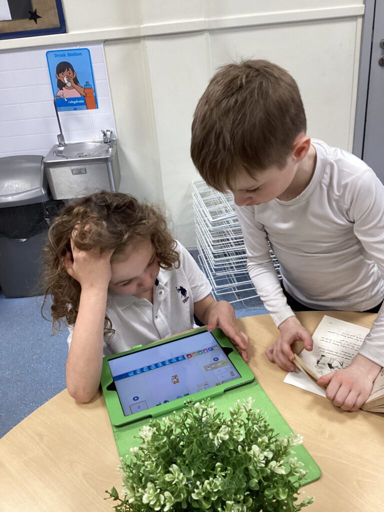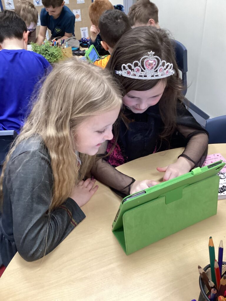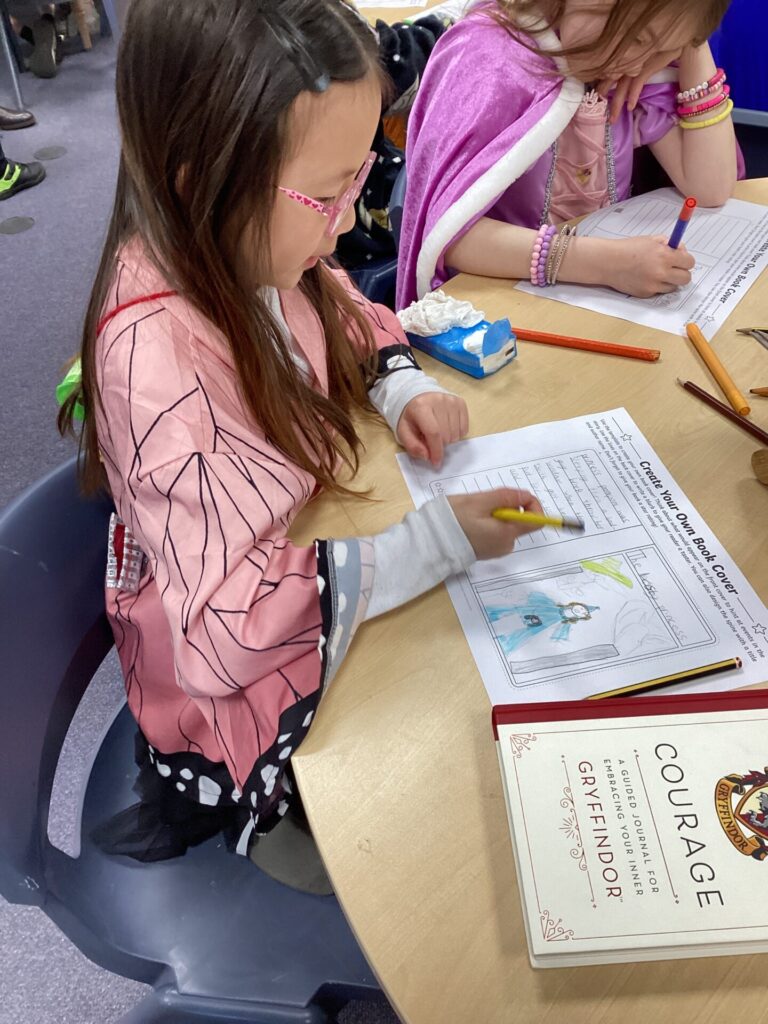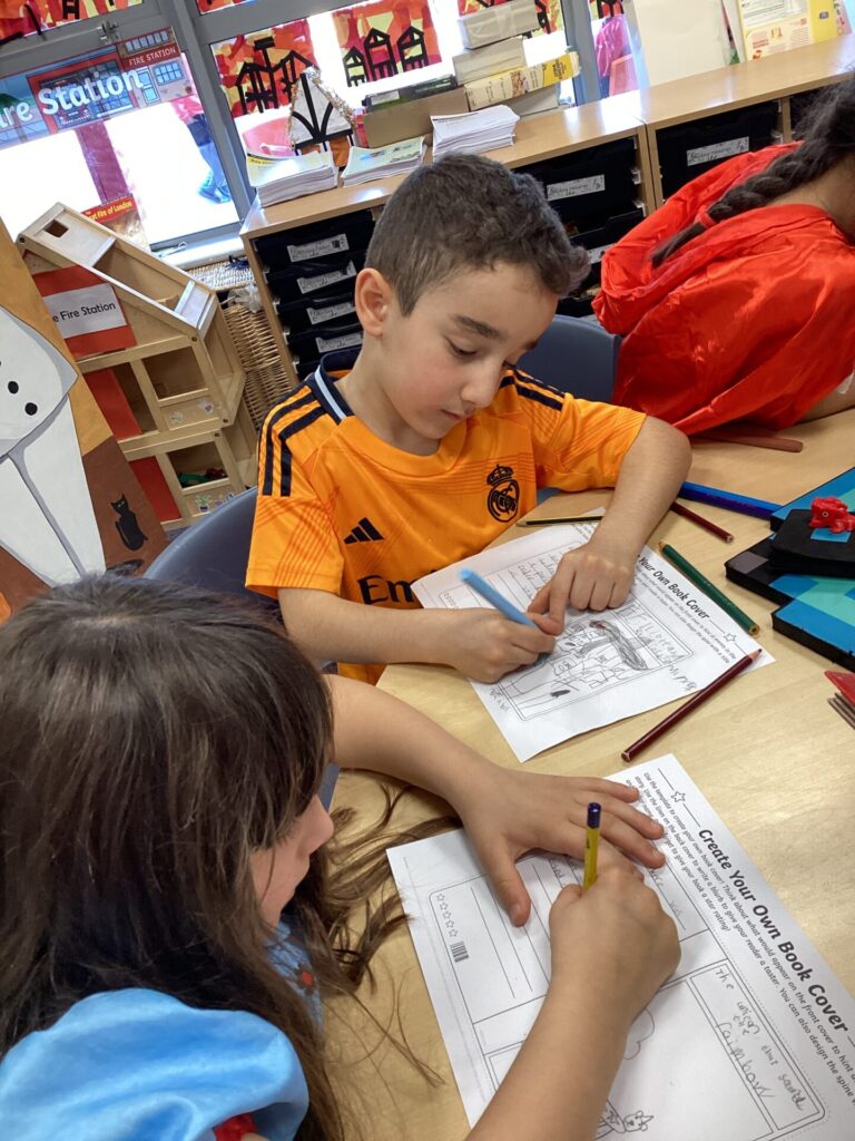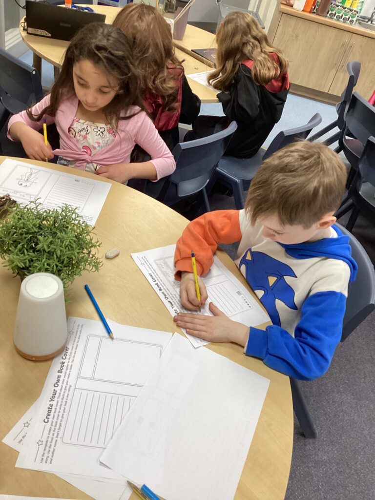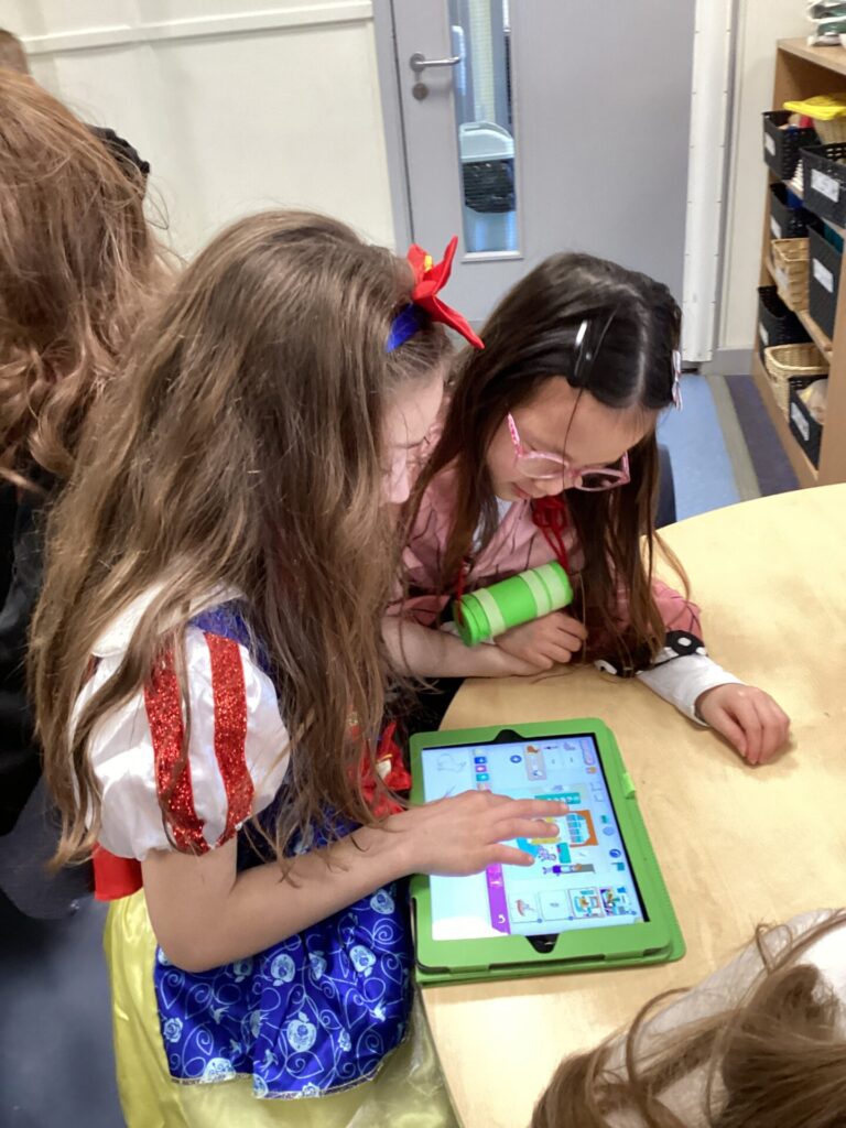 Then, we designed a front cover and wrote a blurb for our very own book. We brought our stories and characters to life using Scratch Jr on the iPads.