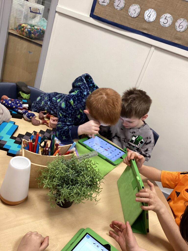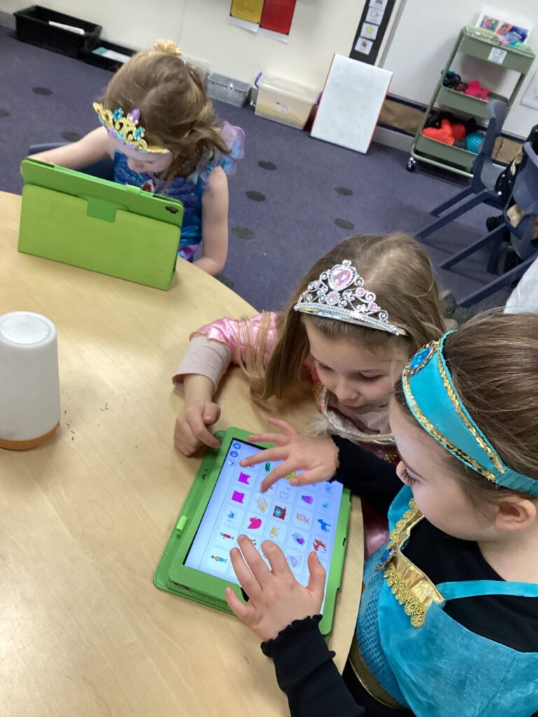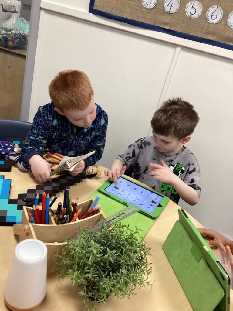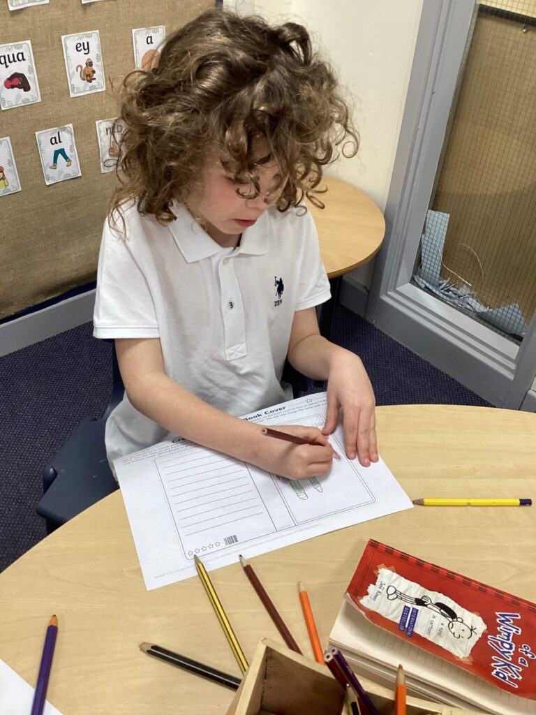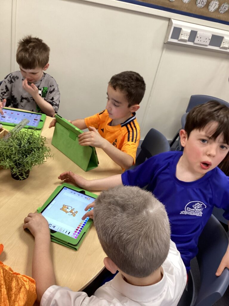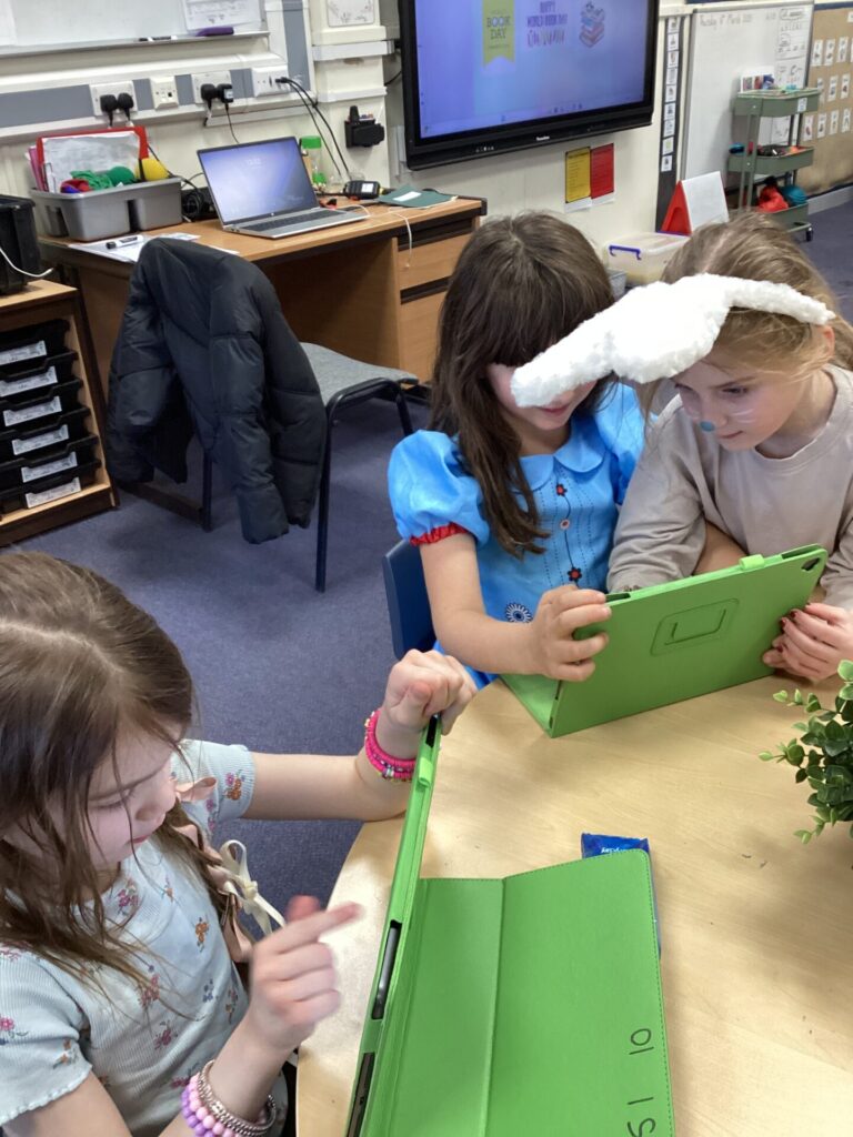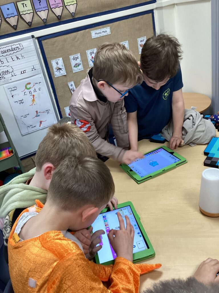 Then, we designed a front cover and wrote a blurb for our very own book. We brought our stories and characters to life using Scratch Jr on the iPads.