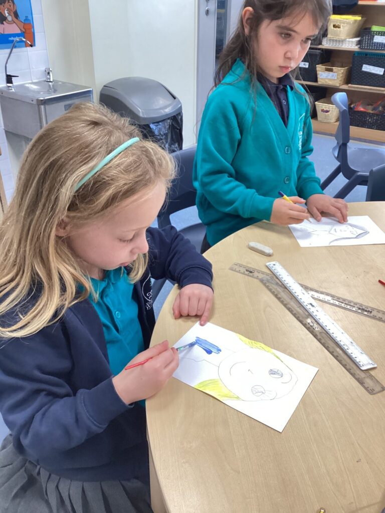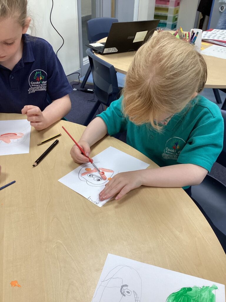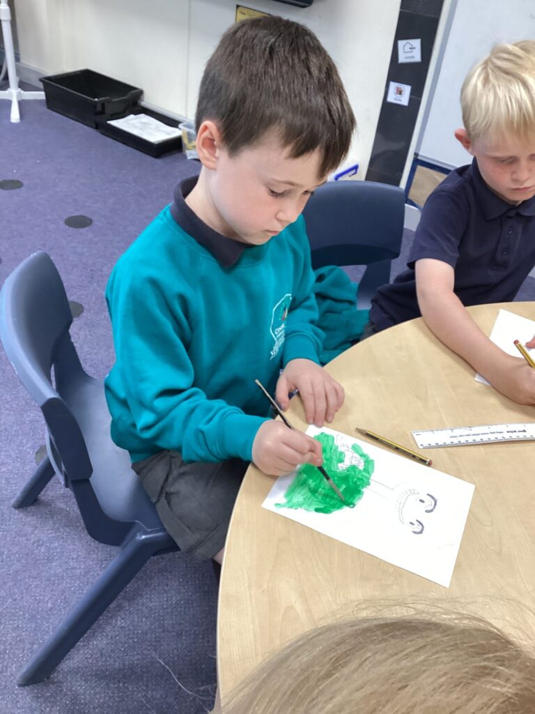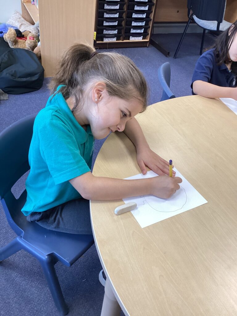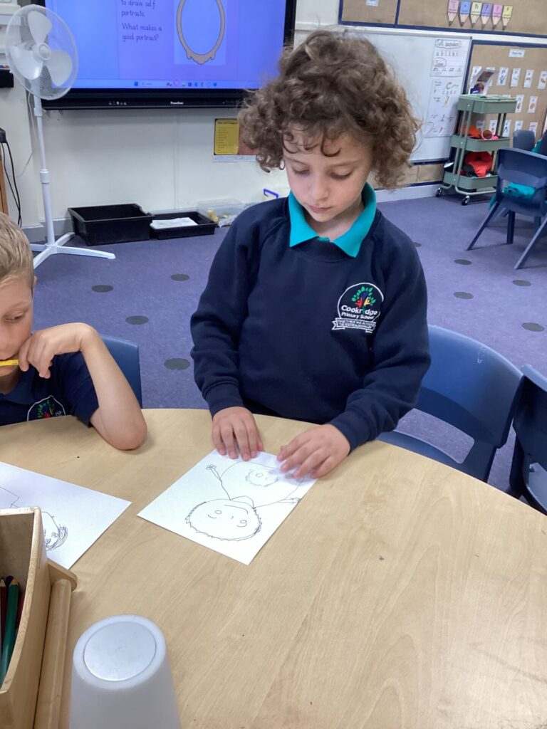 After lunch, we used our wonderful drawing skills to create a self portrait and then we painted it very carefully. We were very happy with what we produced.