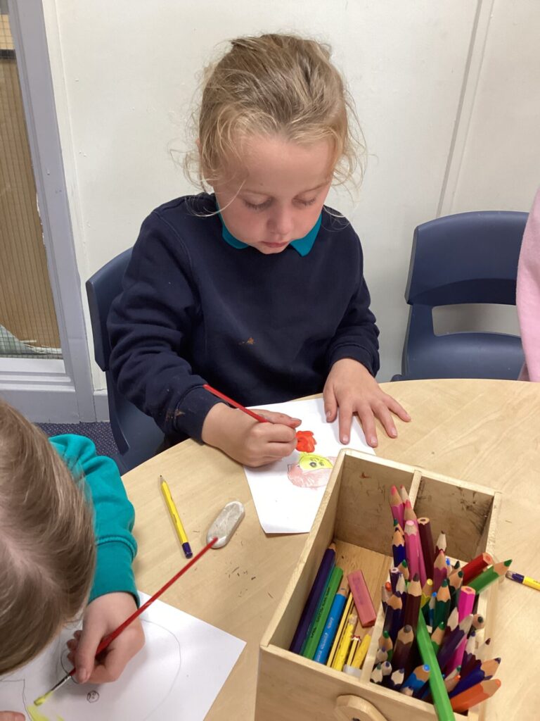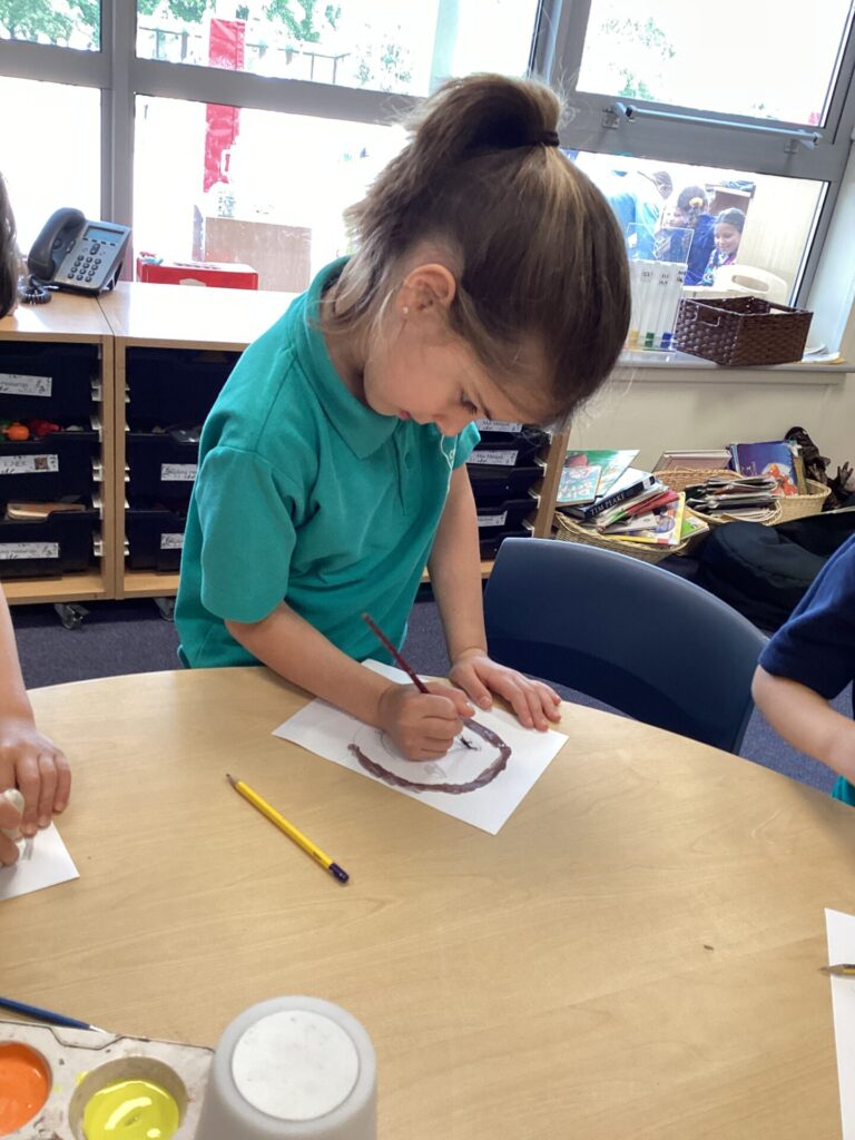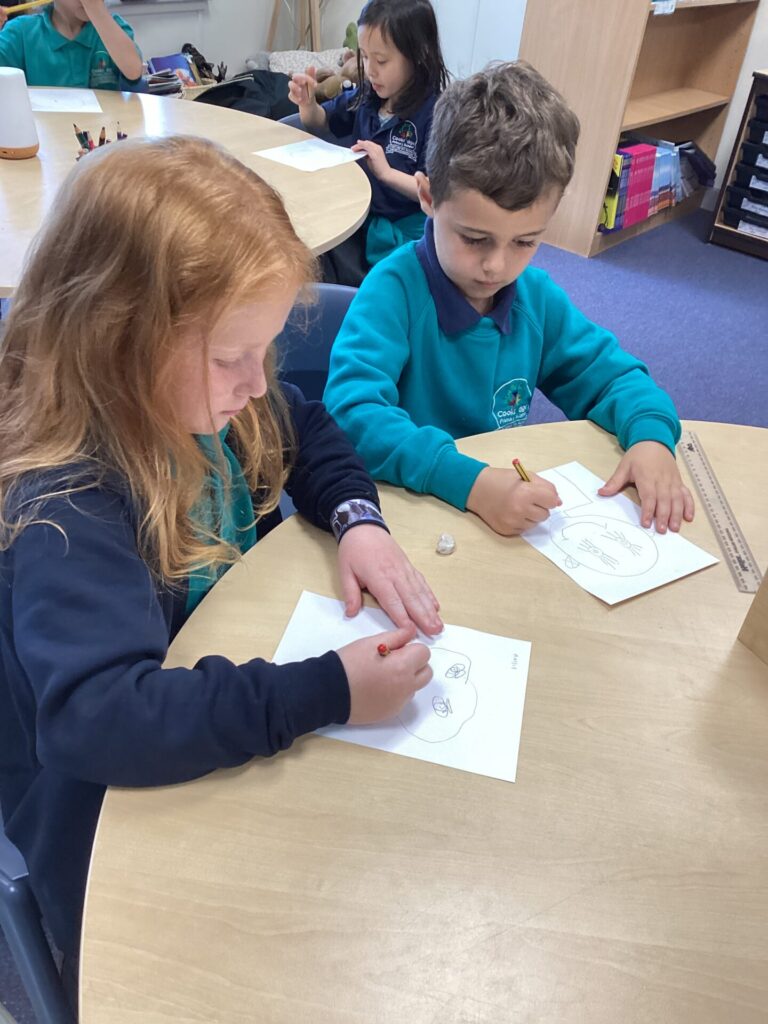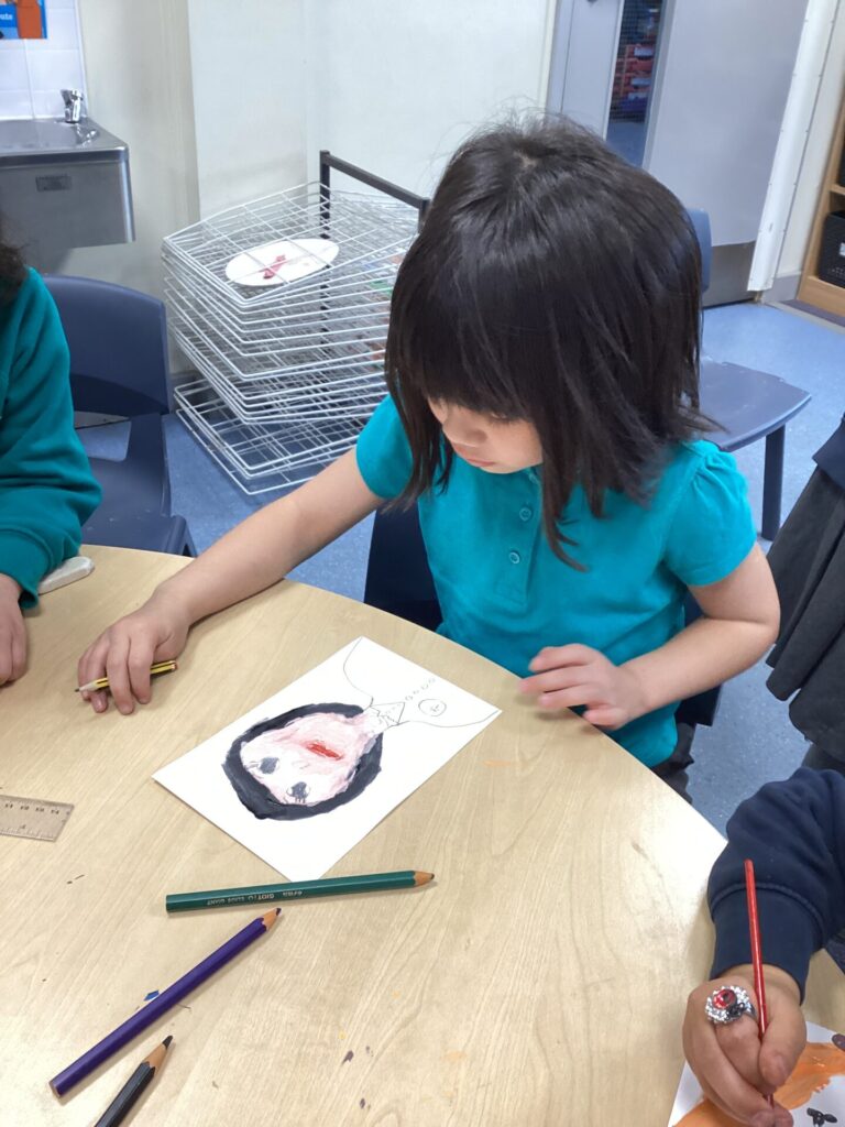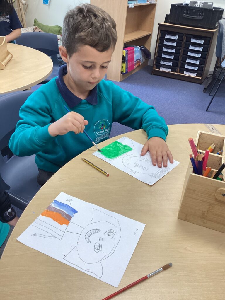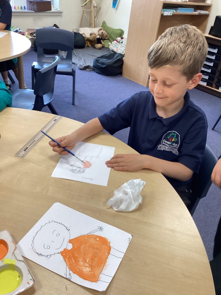 After lunch, we used our wonderful drawing skills to create a self portrait and then we painted it very carefully. We were very happy with what we produced.