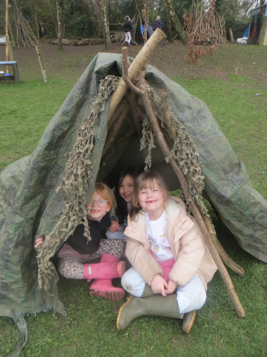 Today in Forest School, pupils in Key Stage 1 put their shelter making skills to the ultimate test on a day with mixed weather to say the least! After several sessions on experimenting with ‘A-Frame’, ‘Lean-To’ and ‘Tepee’ dens, groups had to build one today using a tarp with the aim of keeping them dry and warm. Their den would have to fit every team member inside and provide protection from the wind as well as rain. After a quick discussion where we reviewed and revisited previous learning, challenges and successes, teams got to work finding an appropriate site to build on, sourcing den building sticks that suited their type of den and worked together to attach their tarp. Once completed, teams had some time to decorate and furnish their dens using loose parts and tell jokes and stories. To end the session, we reviewed the series of lessons on den building and shared what we’d learned over the past six weeks; this included comments on different types of dens, teamwork, problem solving and the importance of communication. Well done KS1!