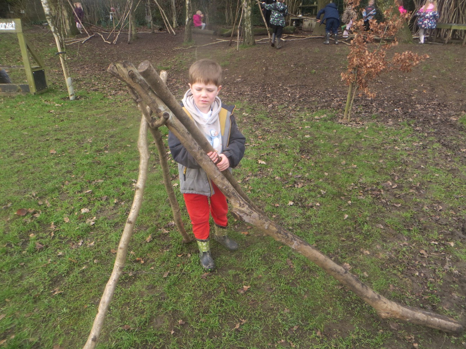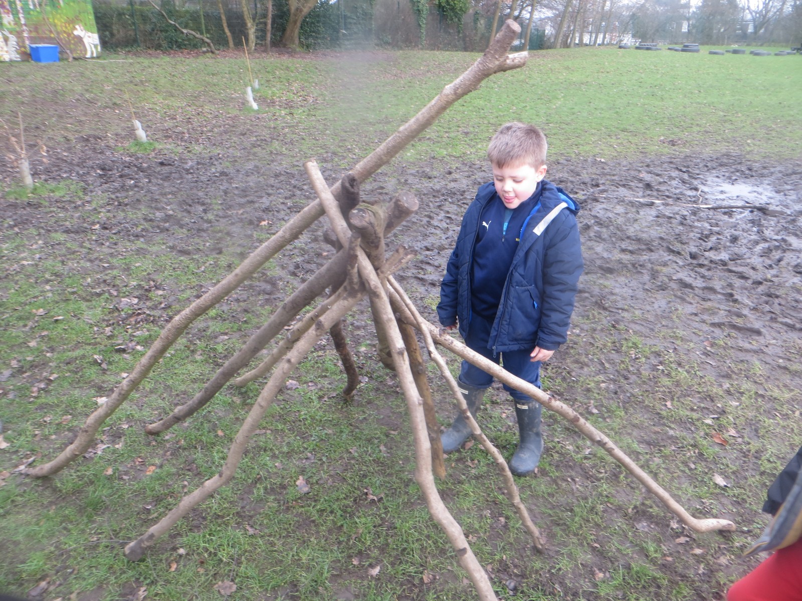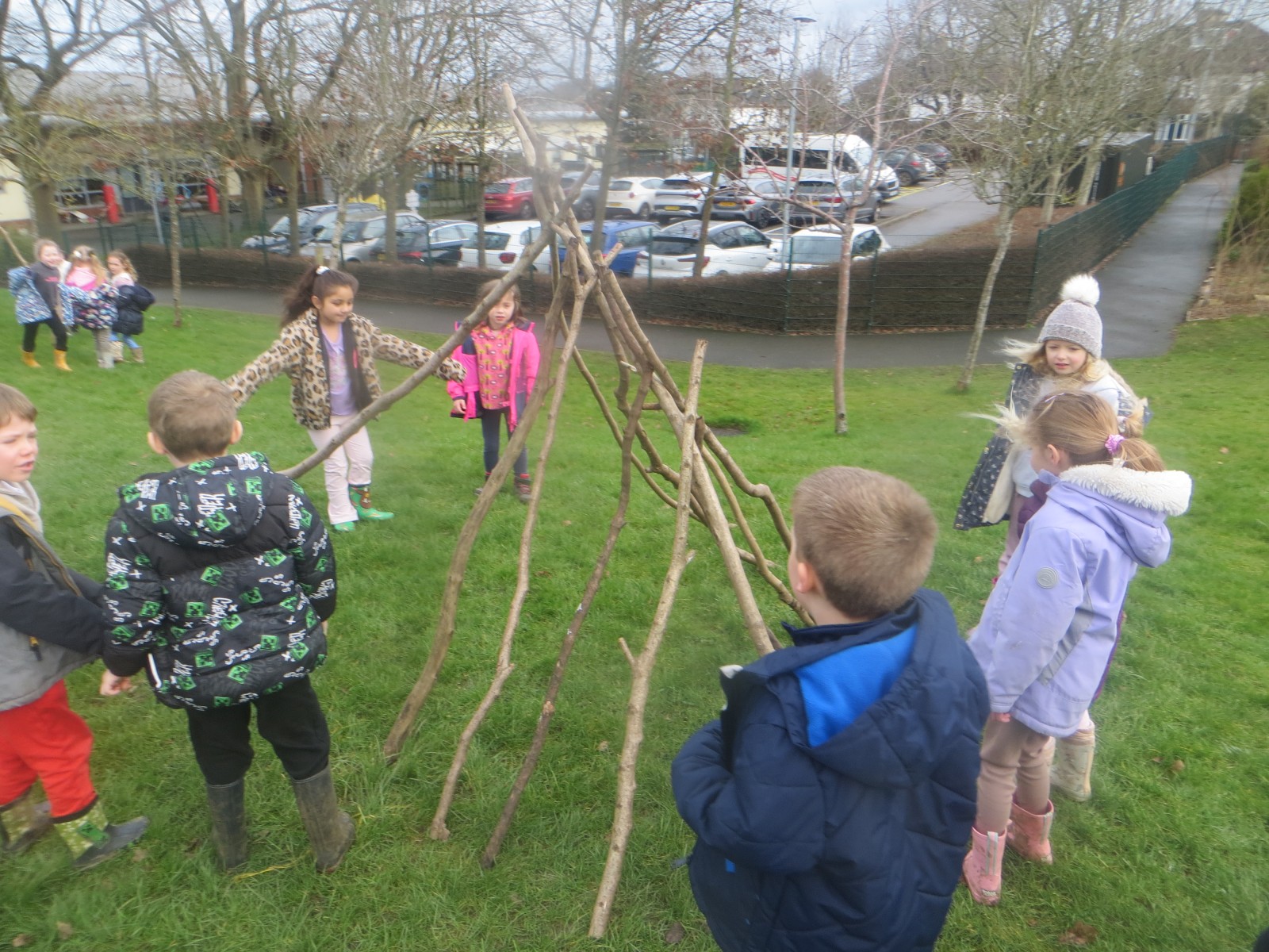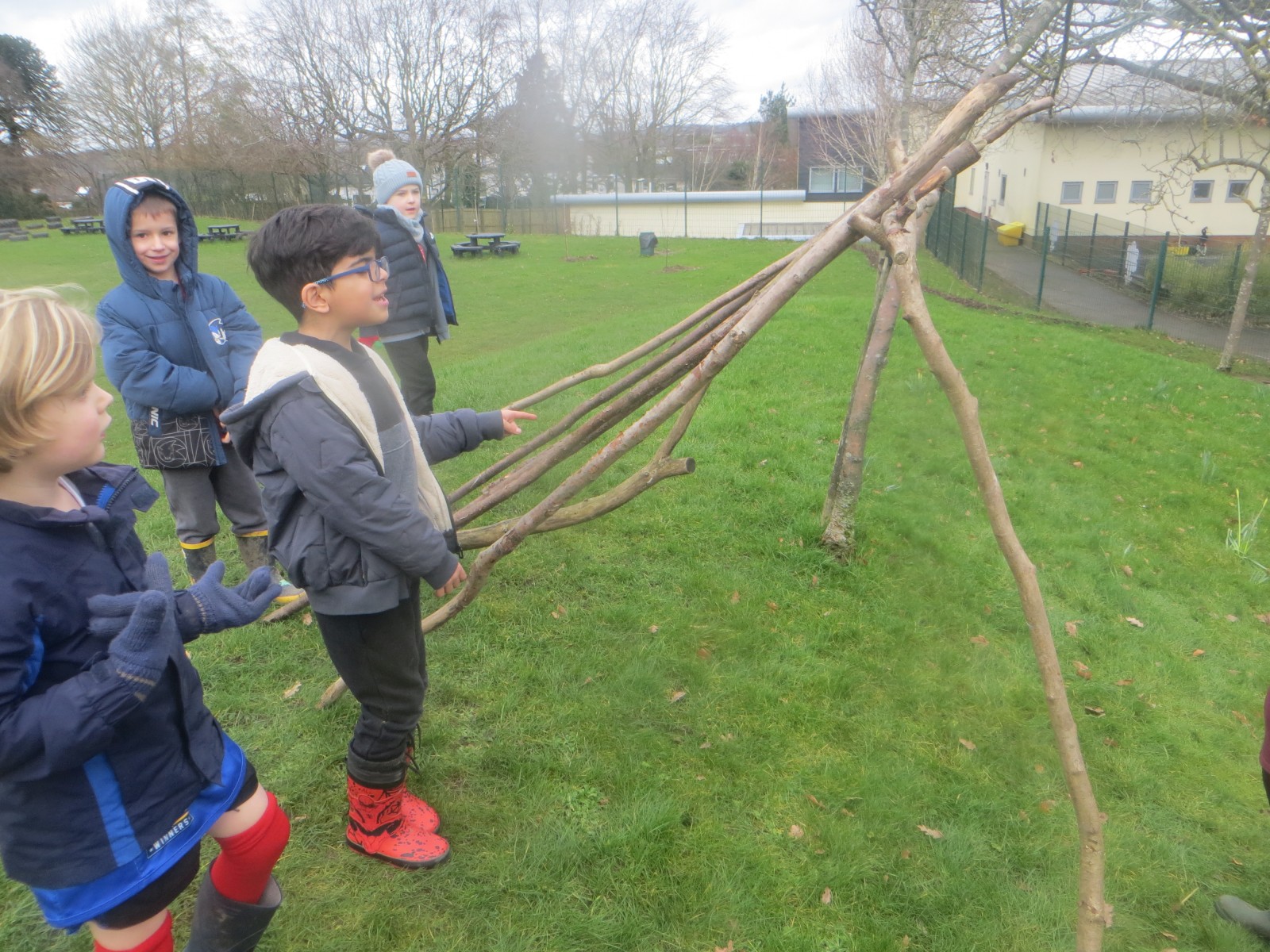 Today in our Forest School sessions, pupils in KS1 began learning about building dens. To start with, children looked at three different types of dens already built on the school field called ‘A-Frame’, ‘Lean-To’ and ‘Tepee.’ Pupils discussed each one, looking at their features and what similarities and differences they all had. After a crash course in how to construct each type, children organised themselves into groups to explore and investigate building all three types of dens. Along the way, they had to work together, communicate effectively and problem solve and, once complete, safely take down their den before re-building a different type. They reflected on which ones were easier or harder to construct as well as highlighting things that didn’t go to plan and how they overcame challenges when building them – a great day KS1 – well done everyone on your first session of den building.