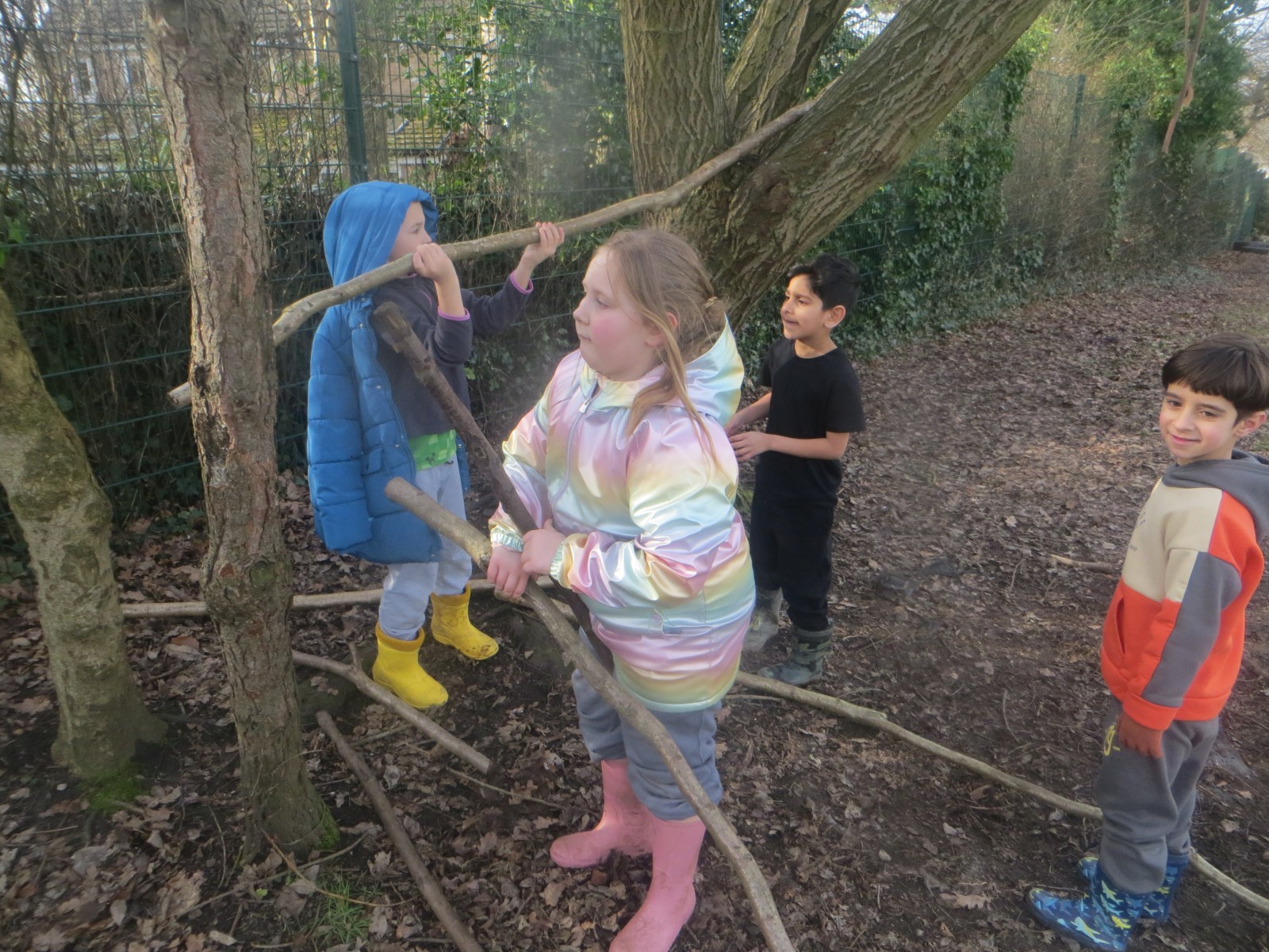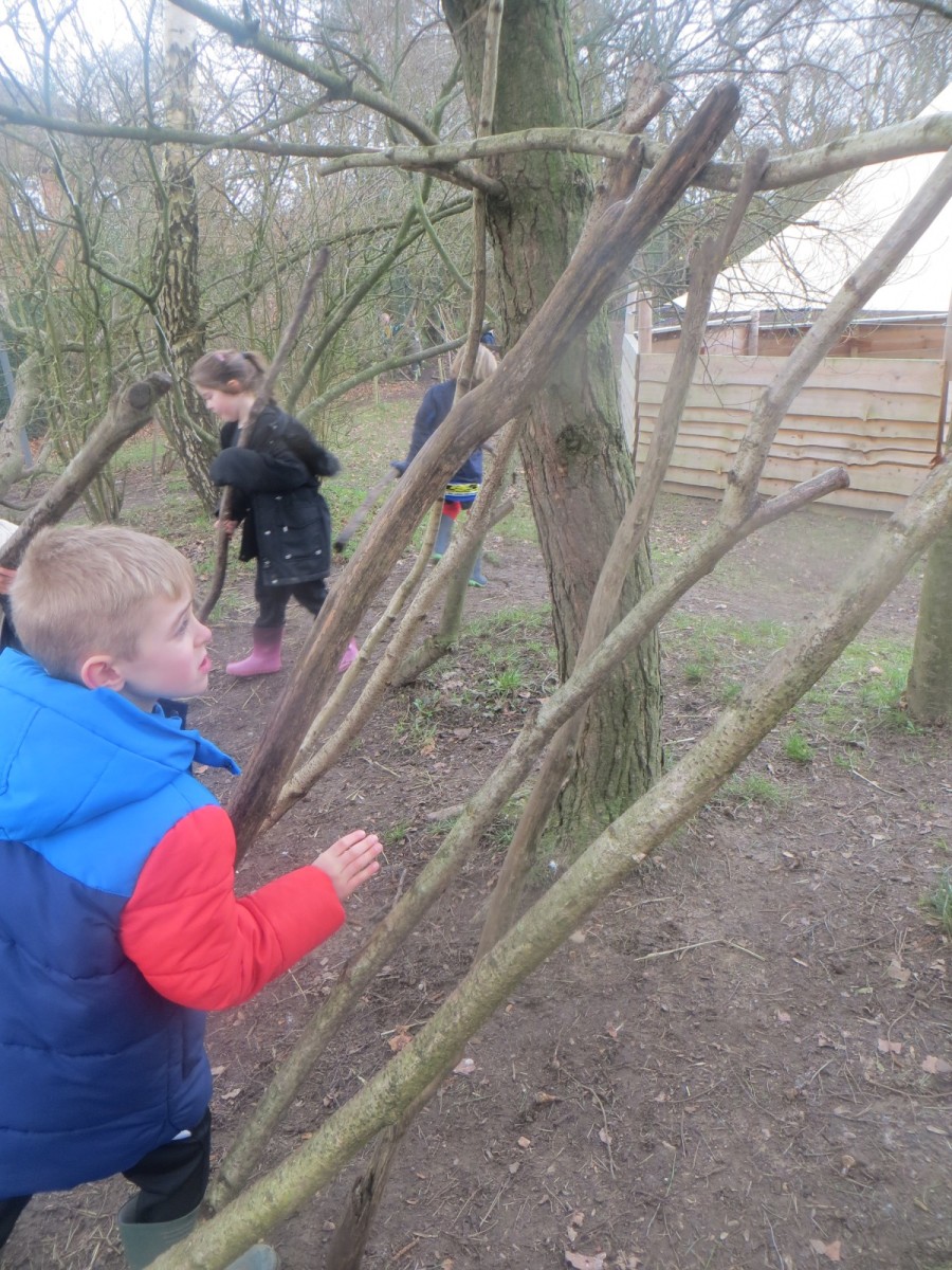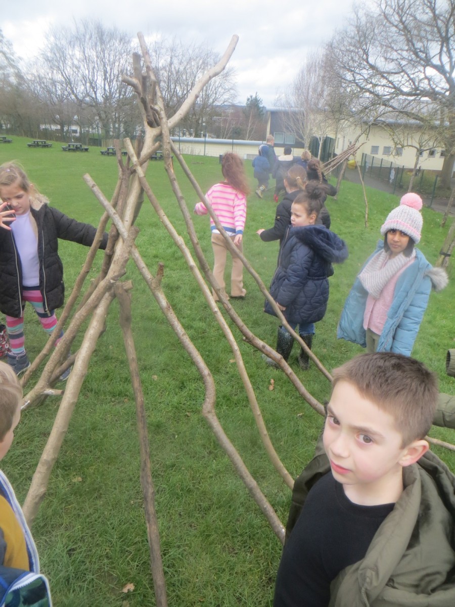 Today in our Forest School sessions, pupils in KS1 began learning about building dens. To start with, children looked at three different types of dens already built on the school field called ‘A-Frame’, ‘Lean-To’ and ‘Tepee.’ Pupils discussed each one, looking at their features and what similarities and differences they all had. After a crash course in how to construct each type, children organised themselves into groups to explore and investigate building all three types of dens. Along the way, they had to work together, communicate effectively and problem solve and, once complete, safely take down their den before re-building a different type. They reflected on which ones were easier or harder to construct as well as highlighting things that didn’t go to plan and how they overcame challenges when building them – a great day KS1 – well done everyone on your first session of den building.
