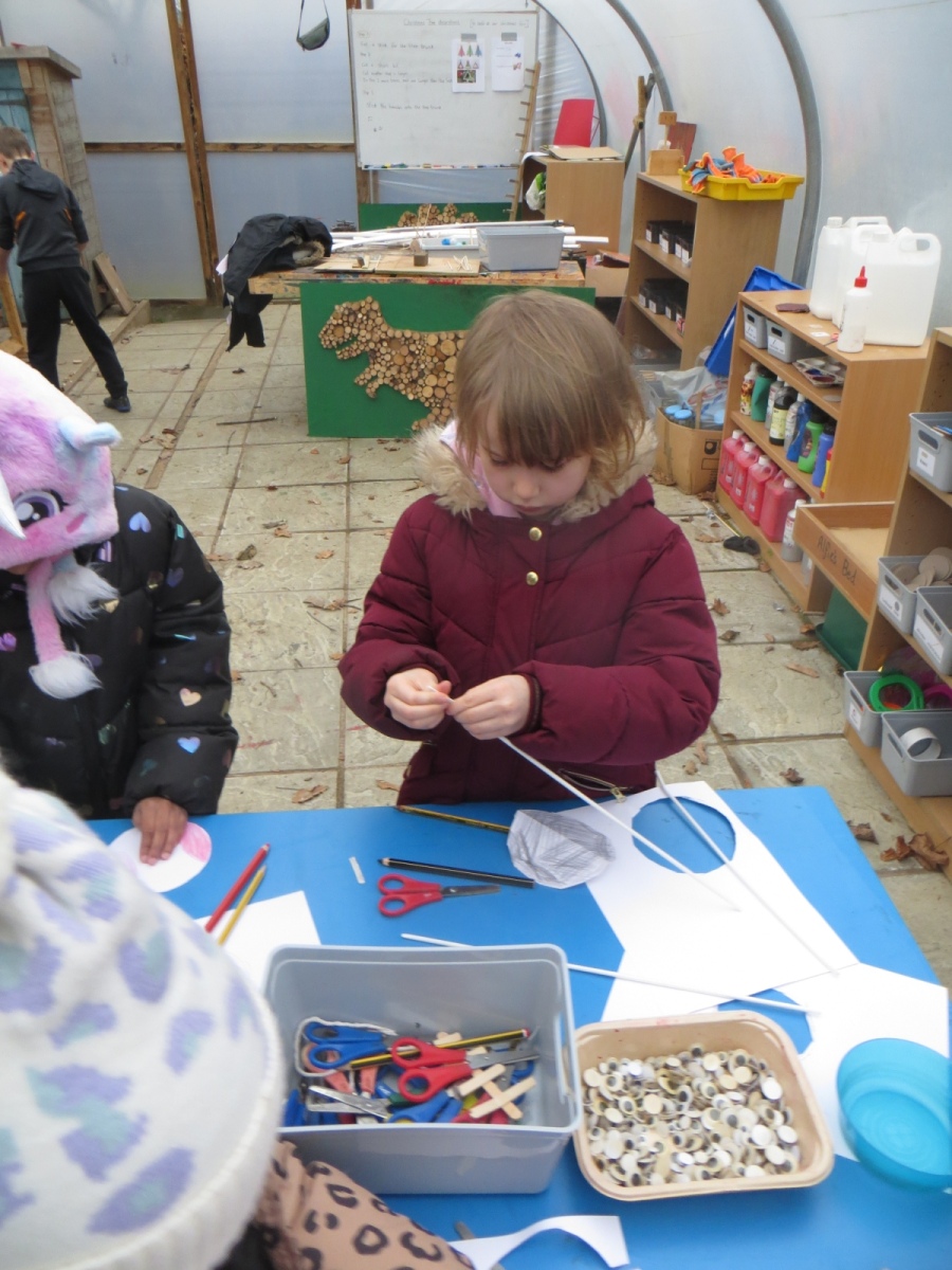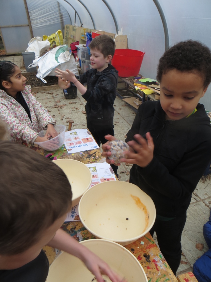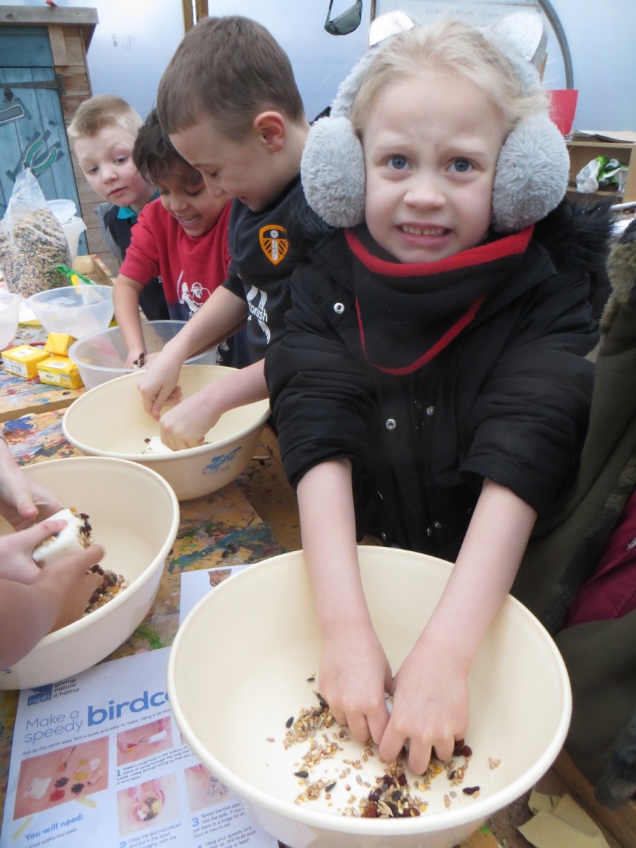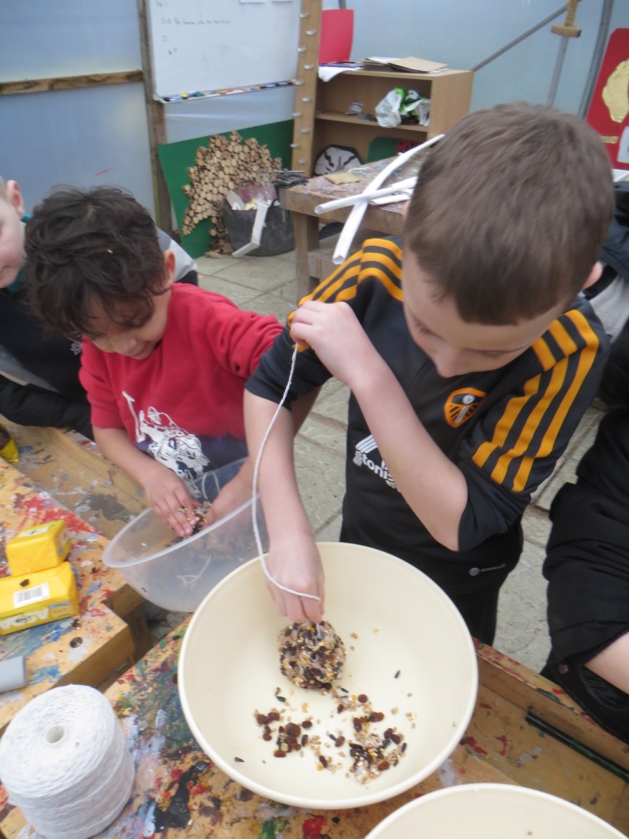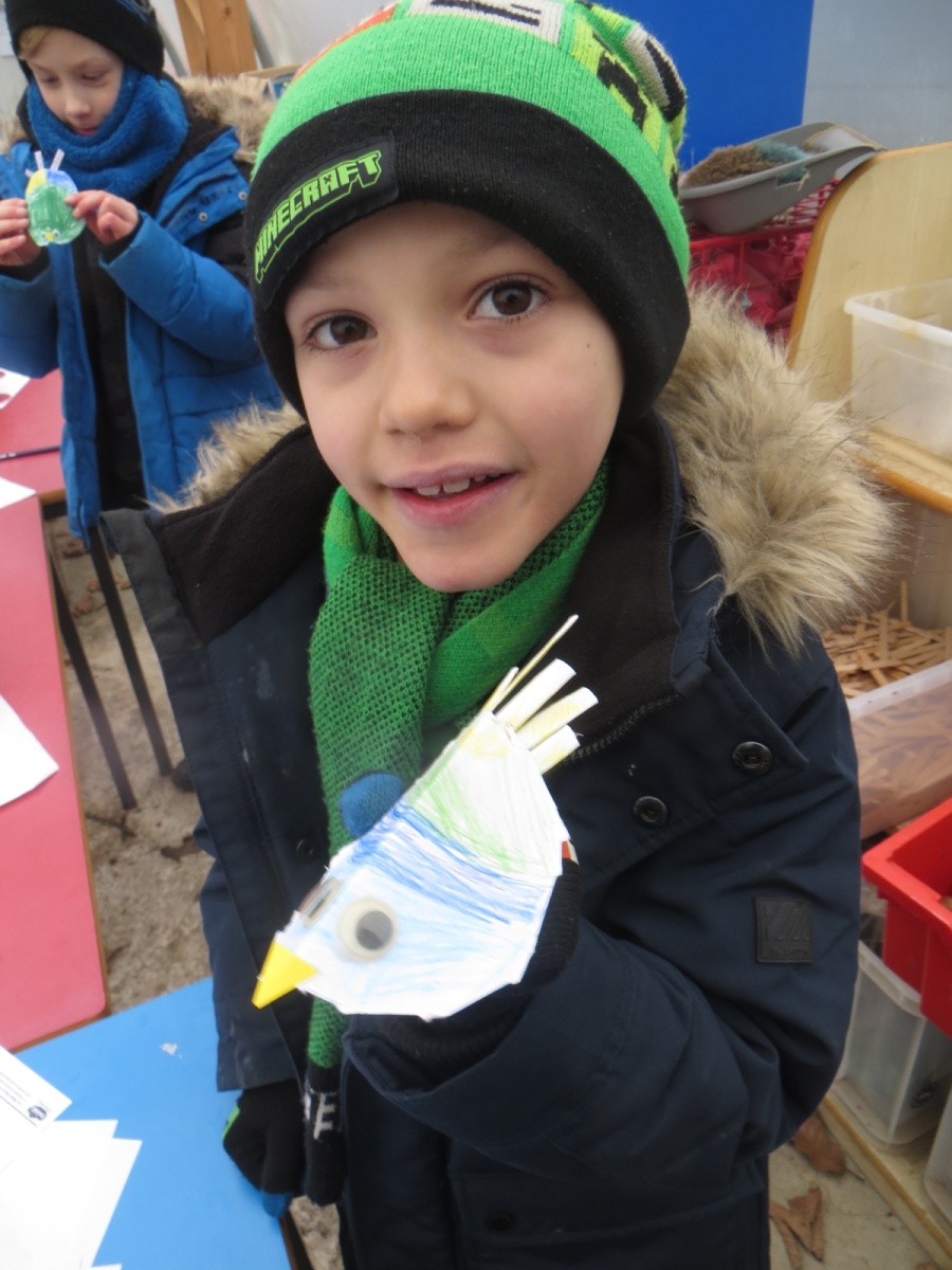 This weekend it is the RSPB’s 25th Big Garden Birdwatch and it’s the world’s largest garden wildlife survey. In preparation for this, KS1 pupils have been learning all about birds today in their Forest School sessions. Pupils have led their own learning by choosing to make bird cakes using lard, seeds, raisins and dried fruit with string attached to hang them from trees to feed our feathered friends an energy boosting snack. Pupils also made birds using cardboard, scissors, glue and pencil crayons. After carefully drawing round a bowl to give them a circular shape, children cut out their bird, coloured it in, created a beak using card and tail feathers using straws. Finally, children added eyes to their birds before creating their own stories and games involving them. The final activity involved learning about some common garden birds and their coloured markings. Pupils could choose one and do some mindful colouring either matching the colours of the bird to their picture or they could be creative and add their own colour scheme – we had some very bright and wonderfully coloured birds!