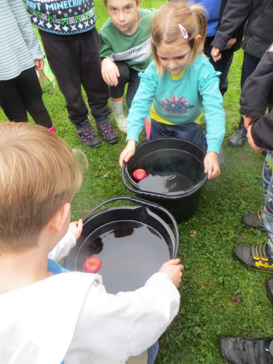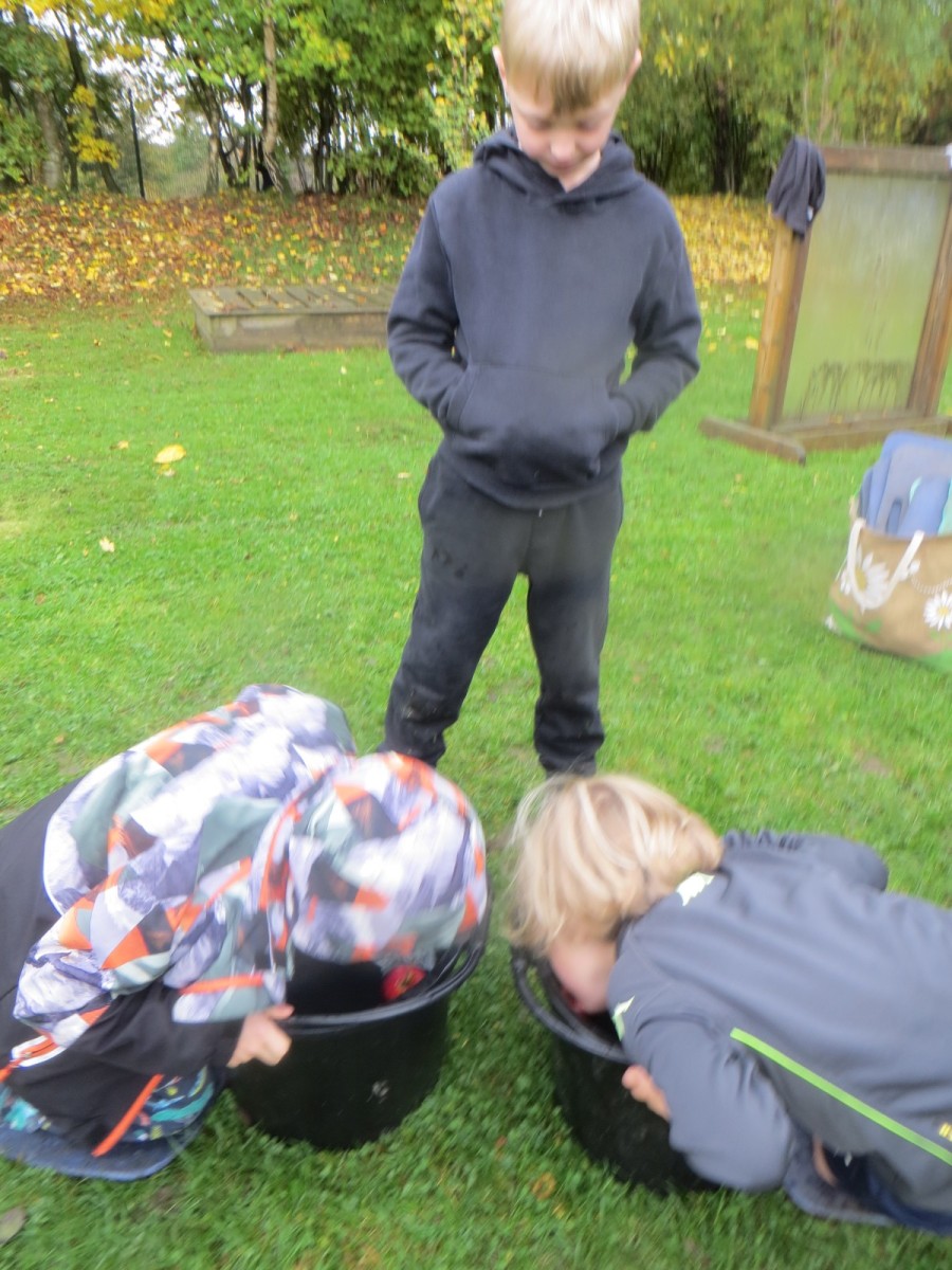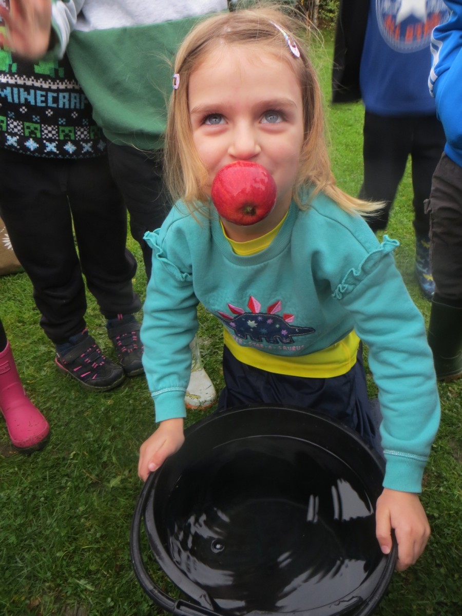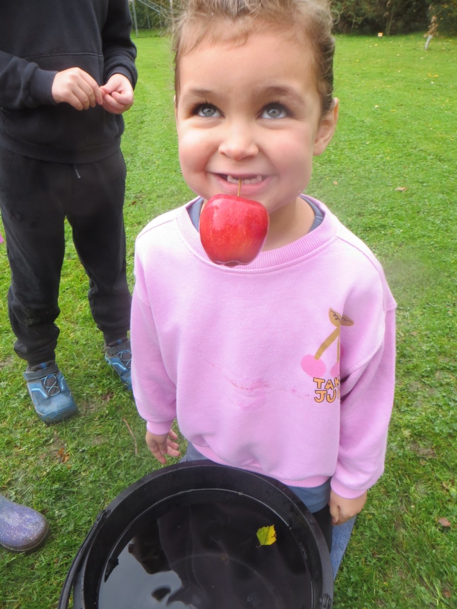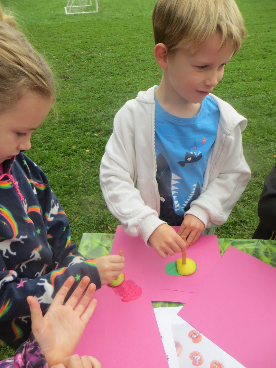 Today KS1 pupils have been celebrating National Apple Day which falls every year on 21st October. To begin with, children started with some team games using apples that helped to focus their listening, problem solving and teamwork skills whilst trying to finish quicker than the other team. Afterwards, pupils led their own learning by choosing from a range of apple related activities on offer. First, they could try the traditional game of apple bobbing. Pupils were eager to throw their faces into the buckets at first but, after some time, they developed strategies and techniques for grabbing the apple as quickly as they could before their opponent. The second activity was apple printing to make pictures. Using poster paint, apples, sticks and their own fingers, pupils created some lovely animal paintings of the creatures we see and hear on the school grounds. Pupils could also make apple collages out of loose parts and glue as well as try some different varieties of apples including Pippin, Golden Delicious and Royal Gala. The final activity linked back to our work on loose parts again and children were tasked with creating the scariest, most terrifying apple monstersthey could using only loose parts. Pupils had to be resilient, creative and continually problem solve in order to attach parts without the use of tools. A special guest judge chose the scariest! Well done to all the winners!