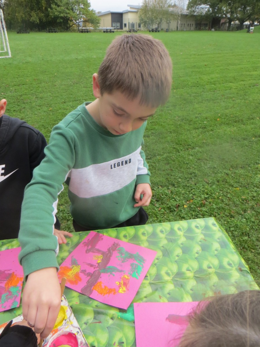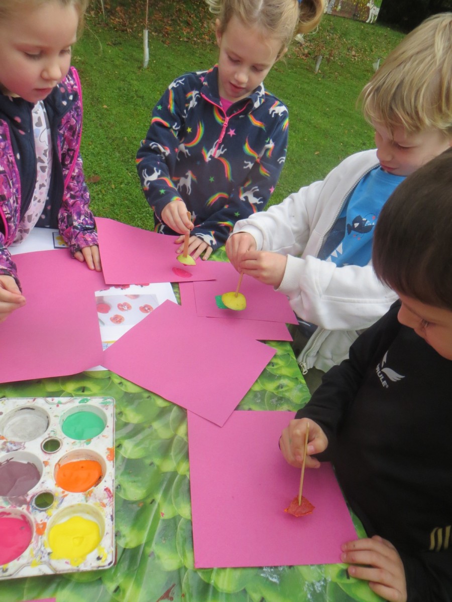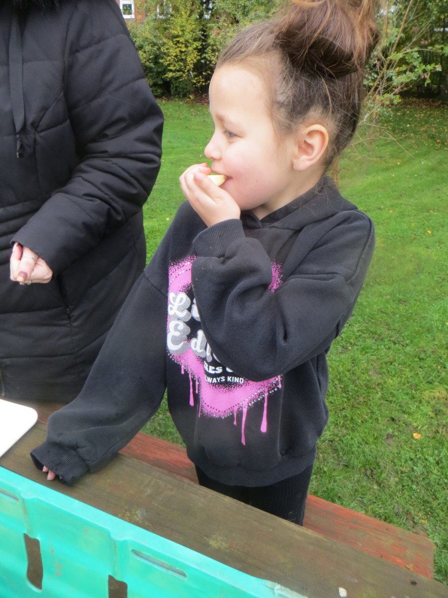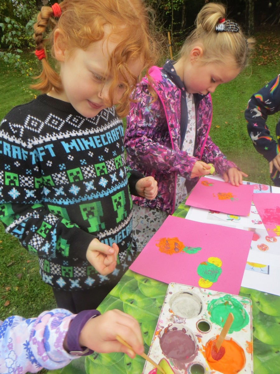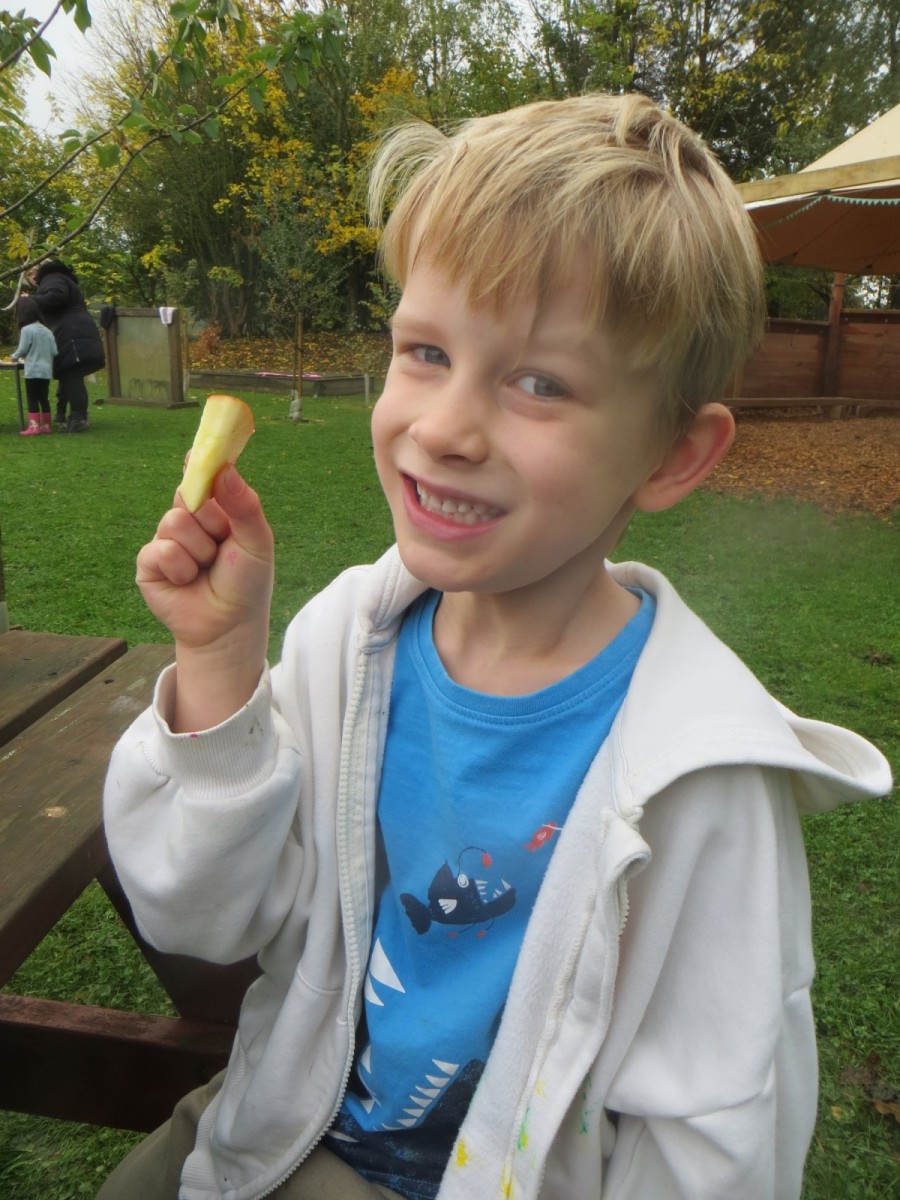 Today KS1 pupils have been celebrating National Apple Day which falls every year on 21st October. To begin with, children started with some team games using apples that helped to focus their listening, problem solving and teamwork skills whilst trying to finish quicker than the other team. Afterwards, pupils led their own learning by choosing from a range of apple related activities on offer. First, they could try the traditional game of apple bobbing. Pupils were eager to throw their faces into the buckets at first but, after some time, they developed strategies and techniques for grabbing the apple as quickly as they could before their opponent. The second activity was apple printing to make pictures. Using poster paint, apples, sticks and their own fingers, pupils created some lovely animal paintings of the creatures we see and hear on the school grounds. Pupils could also make apple collages out of loose parts and glue as well as try some different varieties of apples including Pippin, Golden Delicious and Royal Gala. The final activity linked back to our work on loose parts again and children were tasked with creating the scariest, most terrifying apple monstersthey could using only loose parts. Pupils had to be resilient, creative and continually problem solve in order to attach parts without the use of tools. A special guest judge chose the scariest! Well done to all the winners!