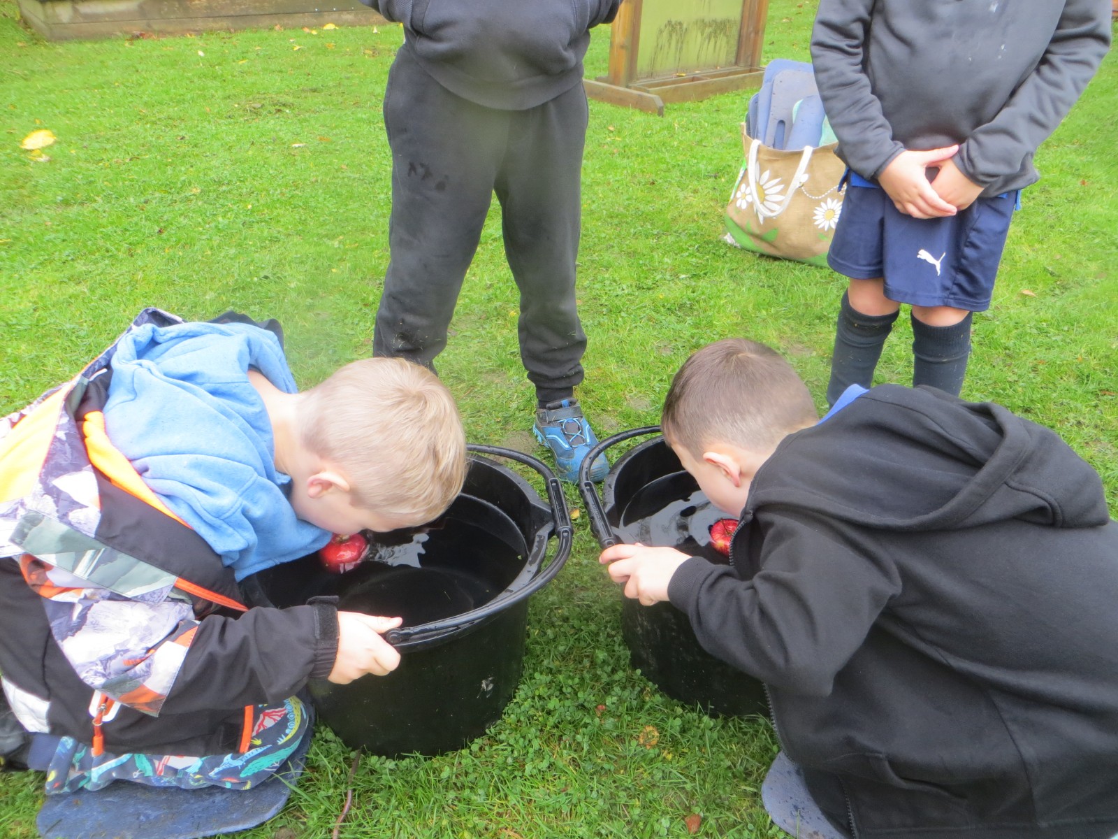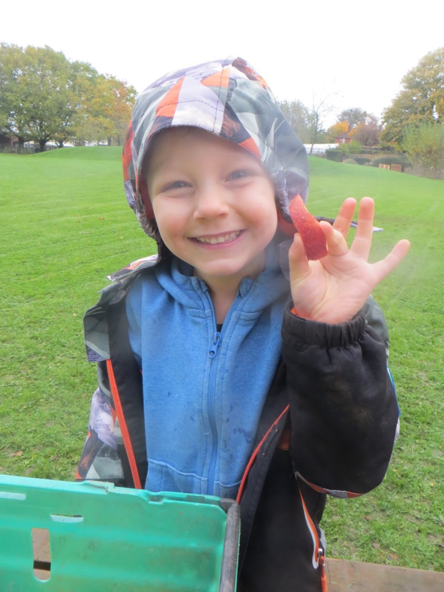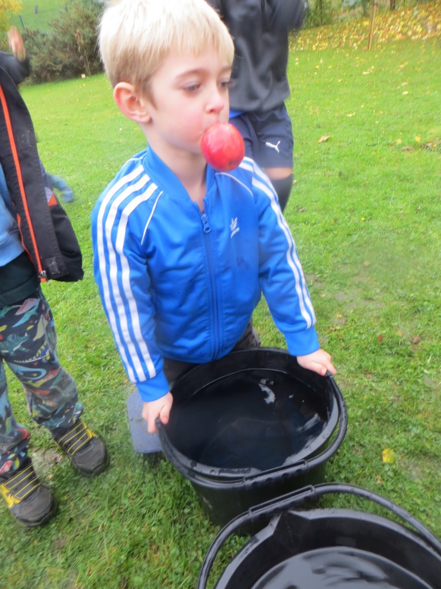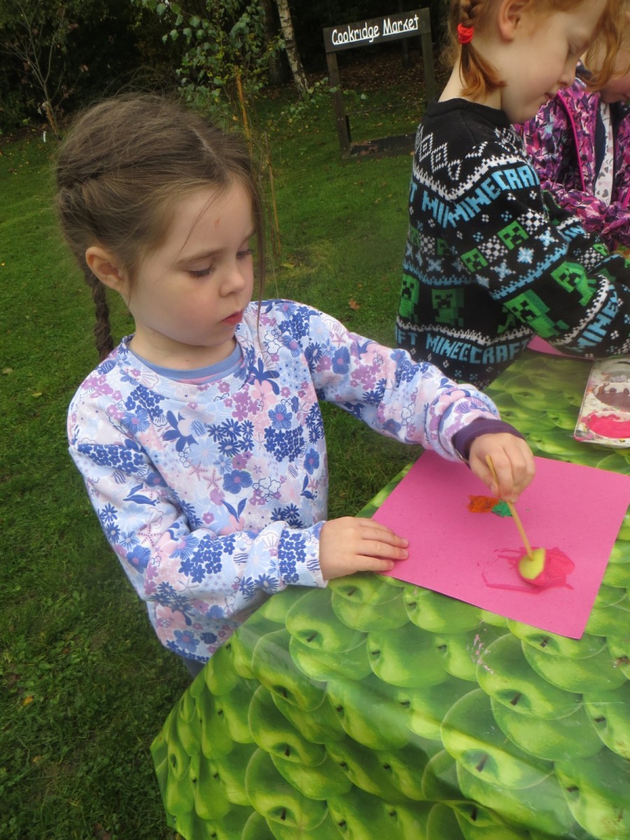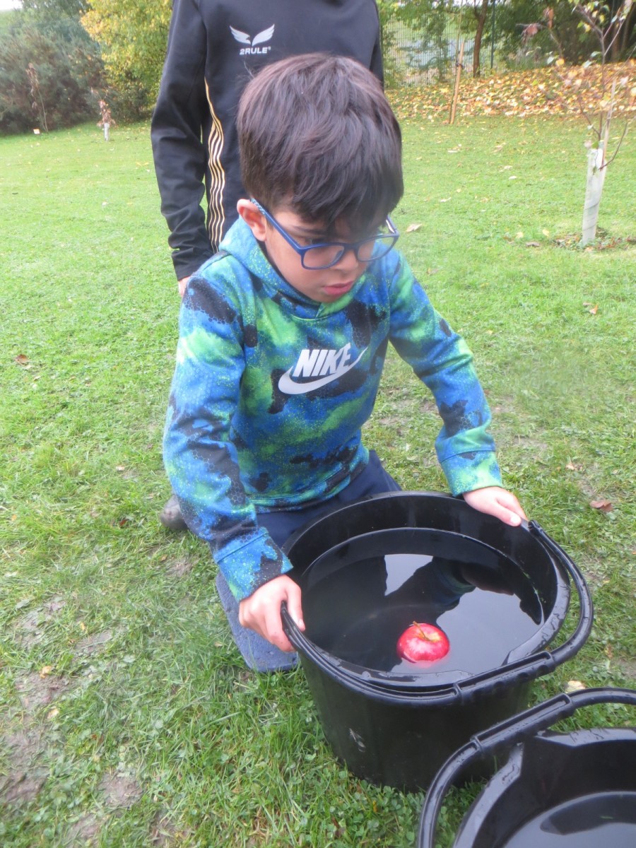 Today KS1 pupils have been celebrating National Apple Day which falls every year on 21st October. To begin with, children started with some team games using apples that helped to focus their listening, problem solving and teamwork skills whilst trying to finish quicker than the other team. Afterwards, pupils led their own learning by choosing from a range of apple related activities on offer. First, they could try the traditional game of apple bobbing. Pupils were eager to throw their faces into the buckets at first but, after some time, they developed strategies and techniques for grabbing the apple as quickly as they could before their opponent. The second activity was apple printing to make pictures. Using poster paint, apples, sticks and their own fingers, pupils created some lovely animal paintings of the creatures we see and hear on the school grounds. Pupils could also make apple collages out of loose parts and glue as well as try some different varieties of apples including Pippin, Golden Delicious and Royal Gala. The final activity linked back to our work on loose parts again and children were tasked with creating the scariest, most terrifying apple monstersthey could using only loose parts. Pupils had to be resilient, creative and continually problem solve in order to attach parts without the use of tools. A special guest judge chose the scariest! Well done to all the winners!