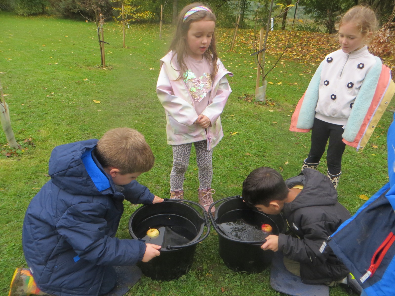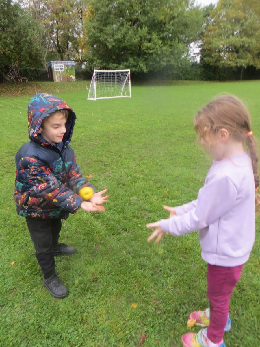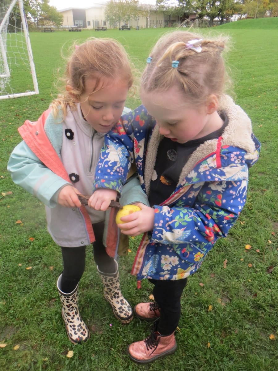 Today KS1 pupils have been celebrating National Apple Day which falls every year on 21st October. To begin with, children started with some team games using apples that helped to focus their listening, problem solving and teamwork skills whilst trying to finish quicker than the other team. Afterwards, pupils led their own learning by choosing from a range of apple related activities on offer. First, they could try the traditional game of apple bobbing. Pupils were eager to throw their faces into the buckets at first but, after some time, they developed strategies and techniques for grabbing the apple as quickly as they could before their opponent. The second activity was apple printing to make pictures. Using poster paint, apples, sticks and their own fingers, pupils created some lovely animal paintings of the creatures we see and hear on the school grounds. Pupils could also make apple collages out of loose parts and glue as well as try some different varieties of apples including Pippin, Golden Delicious and Royal Gala. The final activity linked back to our work on loose parts again and children were tasked with creating the scariest, most terrifying apple monstersthey could using only loose parts. Pupils had to be resilient, creative and continually problem solve in order to attach parts without the use of tools. A special guest judge chose the scariest! Well done to all the winners!