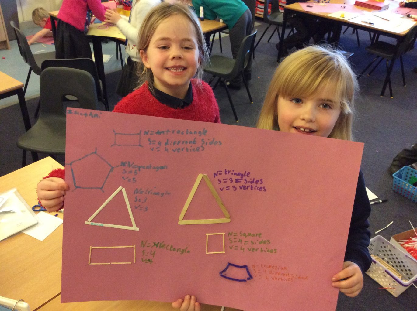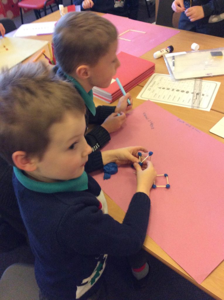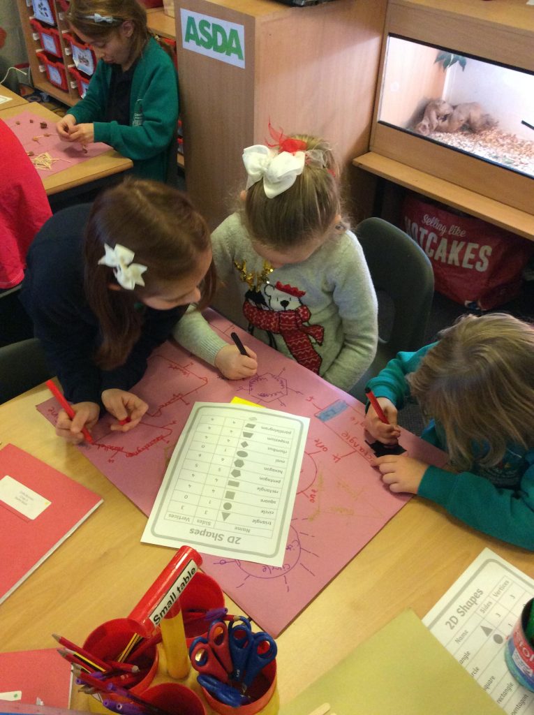In maths we have all been working on shape. Identifying which shape is which and recognising the properties of shape. We are getting much better at labelling the number of sides and vertices of each shape.