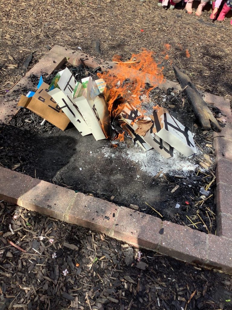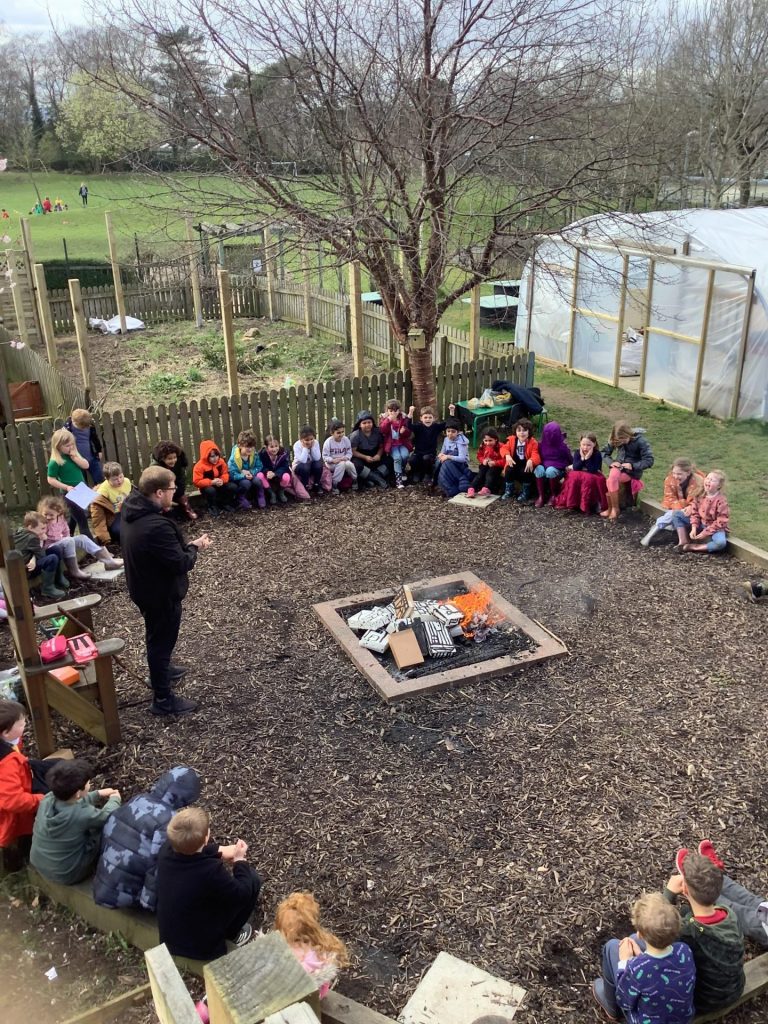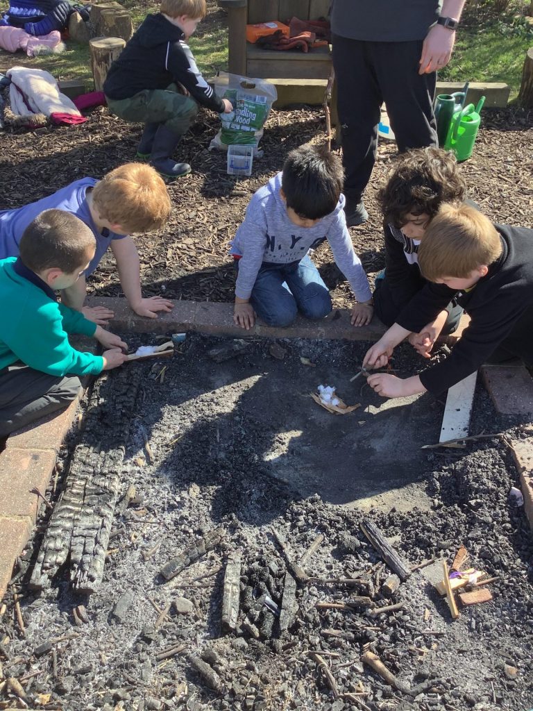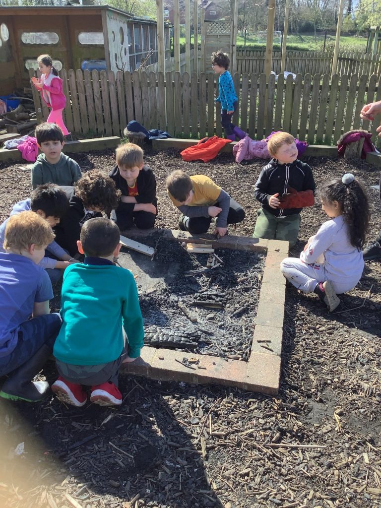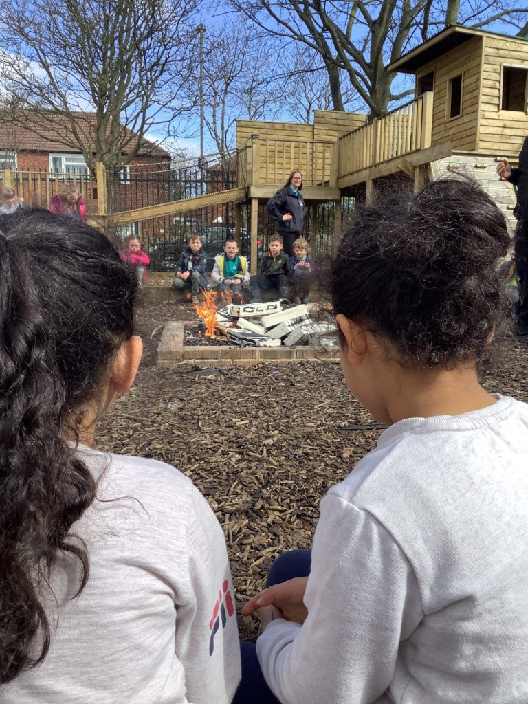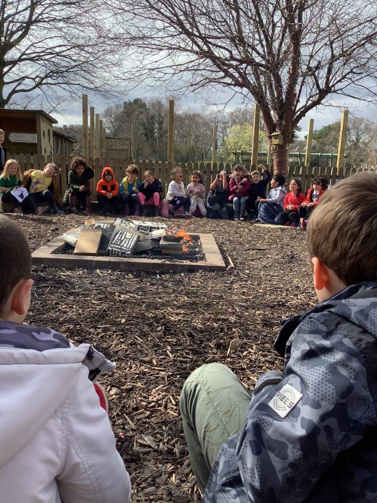 We had great fun during our Forest schools session, taking our houses we had painted up to the fire pit. We laid them out and began a fire in the bakery. We watched as the fire spread really quickly across each of the houses, just like it would have done in London because it was really windy.