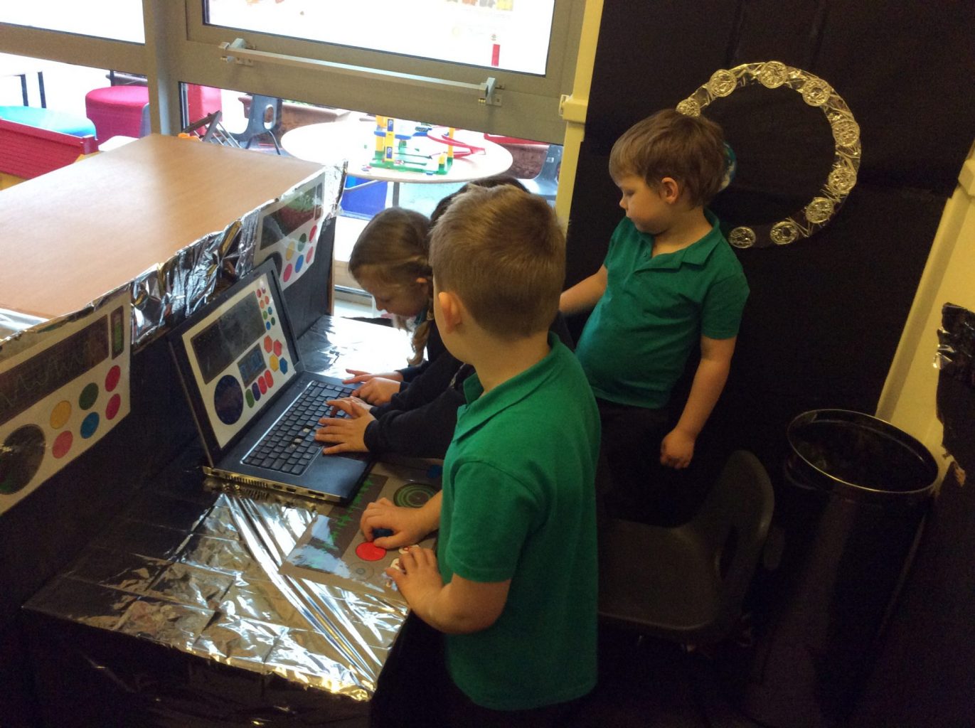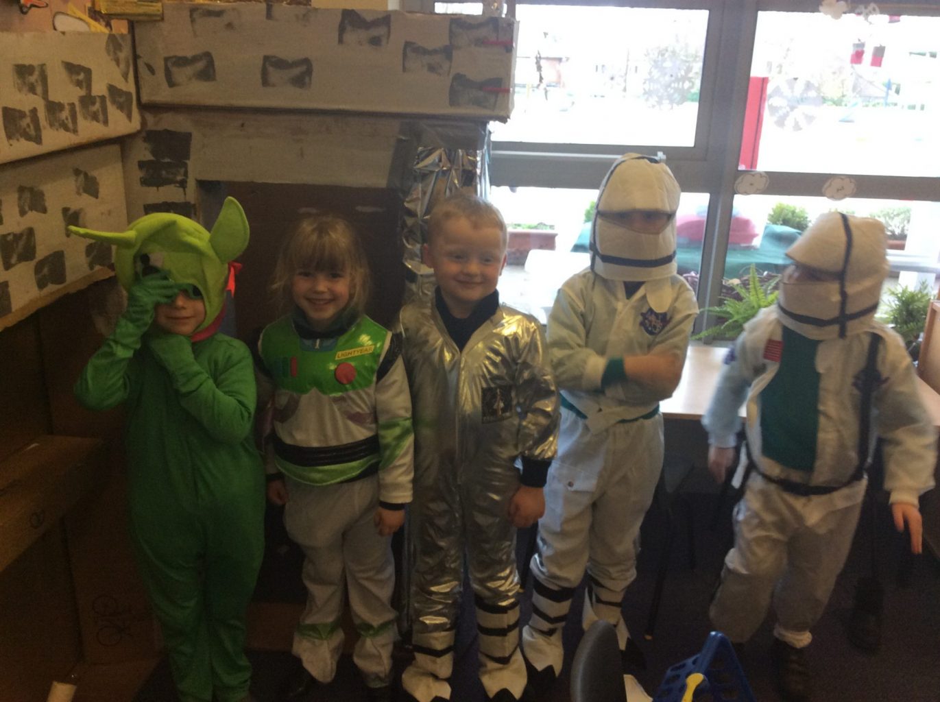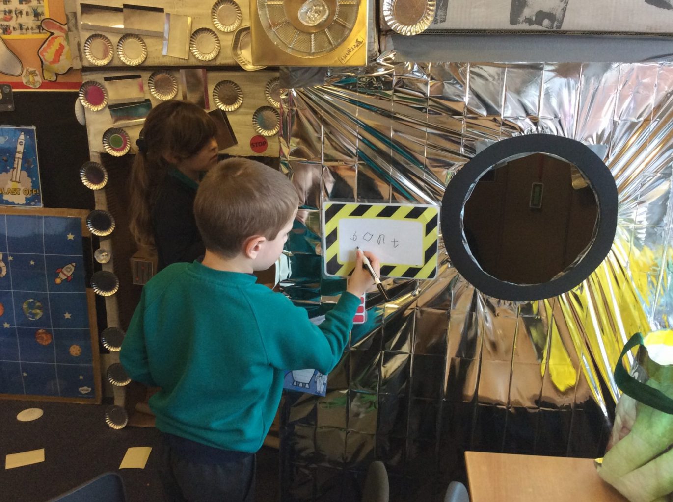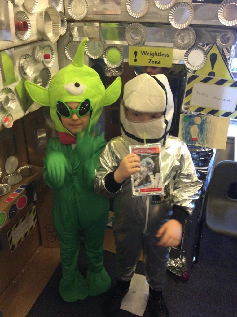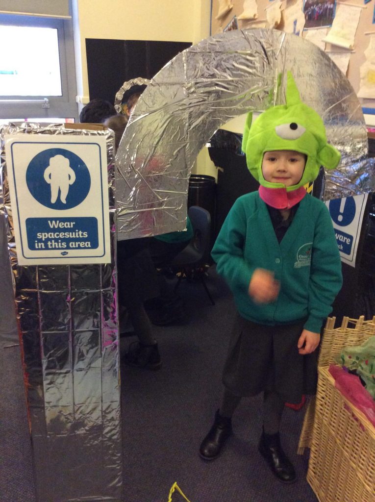We have begun our Space theme and year one began their English by having a rocket take off on the play ground. They all worked together and were developing good oracy skills. Year 2 were also working on oracy skills when they went to investigate a ‘spaceship’ crash site in the garden. They created aliens out of plasticine and wrote about the creature they have created. Great fun has been had exploring our new space themed role play areas.